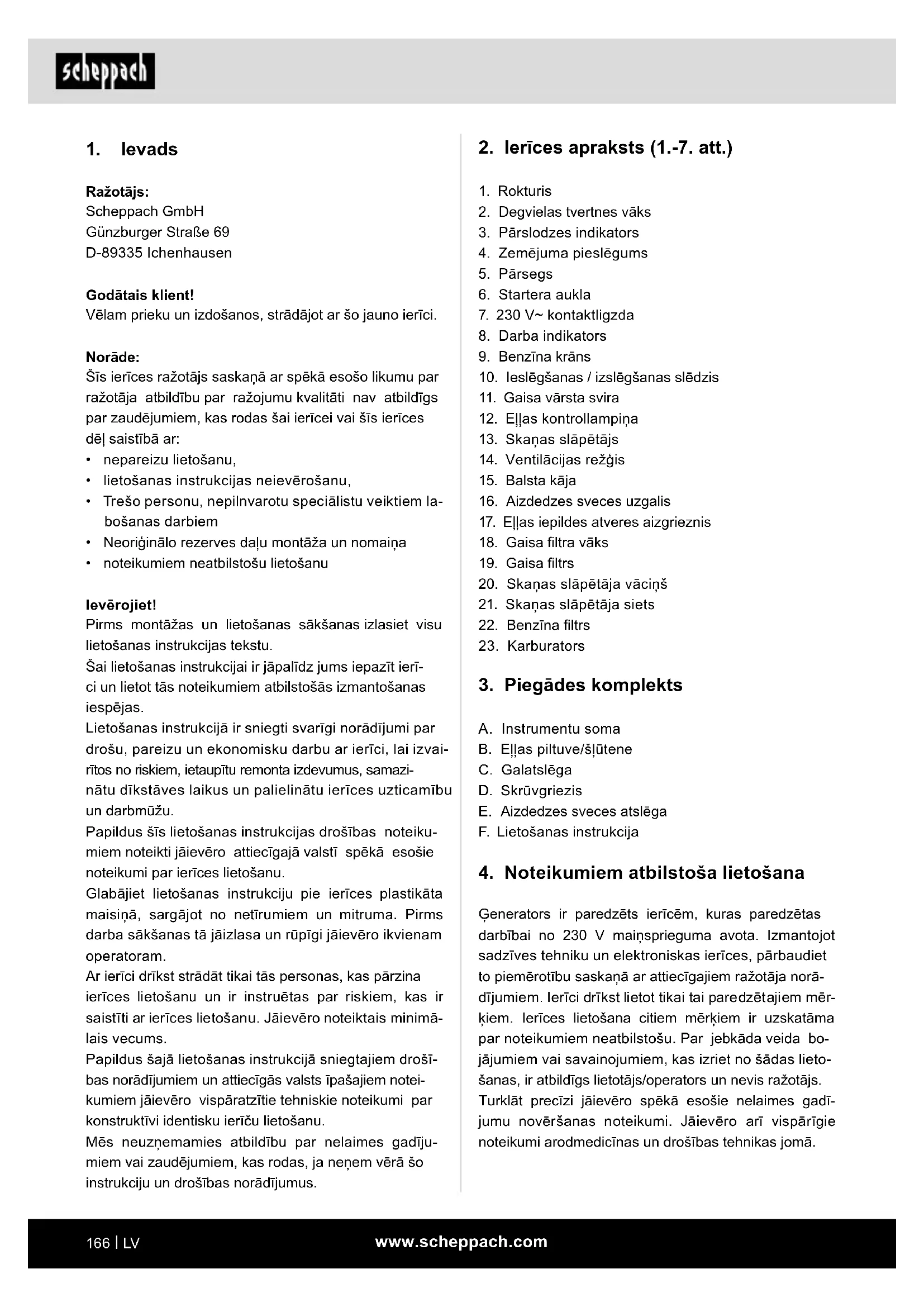 - noteikumiem neatbilstošu lietošanu Ievērojiet! Pirms montāžas un lietošanas sākšanas izlasiet visu lietošanas instrukcijas tekstu. Šai lietošanas instrukcijai ir jāpalīdz jums iepazīt ierī- ci un lietot tās noteikumiem atbilstošās izmantošanas iespējas. Lietošanas instrukcijā ir sniegti svarīgi norādījumi par drošu, pareizu un ekonomisku darbu ar ierīci, lai izvai- rītos no riskiem, ietaupītu remonta izdevumus, samazi- nātu dīkstāves laikus un palielinātu ierīces uzticamību un darbmūžu. Papildus šīs lietošanas instrukcijas drošības noteiku- miem noteikti jāievēro attiecīgajā valstī spēkā esošie noteikumi par ierīces lietošanu. Glabājiet lietošanas instrukciju pie ierīces plastikāta maisiņā, sargājot no netīrumiem un mitruma. Pirms darba sākšanas tā jāizlasa un rūpīgi jāievēro ikvienam operatoram. Ar ierīci drīkst strādāt tikai tās personas, kas pārzina ierīces lietošanu un ir instruētas par riskiem, kas ir saistīti ar ierīces lietošanu. Jāievēro noteiktais minimā- lais vecums. Papildus šajā lietošanas instrukcijā sniegtajiem drošī- bas norādījumiem un attiecīgās valsts īpašajiem notei- kumiem jāievēro vispāratzītie tehniskie noteikumi par konstruktīvi identisku ierīču lietošanu. Mēs neuzņemamies atbildību par nelaimes gadīju- miem vai zaudējumiem, kas rodas, ja neņem vērā šo instrukciju un drošības norādījumus.www.scheppach.com