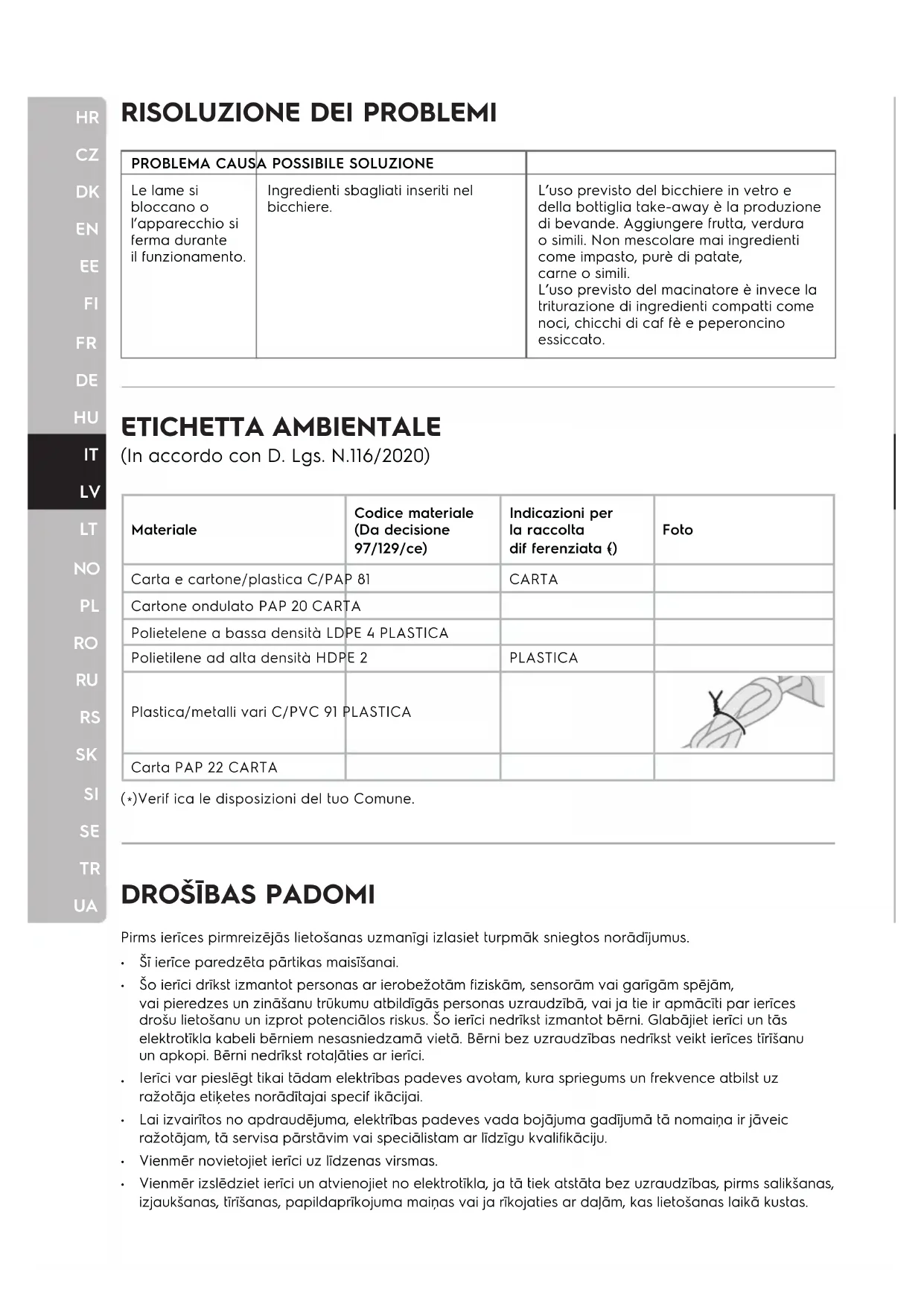 Šī ierīce paredzēta pārtikas maisīšanai. Šo ierīci drīkst izmantot personas ar ierobežotām f iziskām, sensorām vai garīgām spējām, vai pieredzes un zināšanu trūkumu atbildīgās personas uzraudzībā, vai ja tie ir apmācīti par ierīces drošu lietošanu un izprot potenciālos riskus. Šo ierīci nedrīkst izmantot bērni. Glabājiet ierīci un tās elektrotīkla kabeli bērniem nesasniedzamā vietā. Bērni bez uzraudzības nedrīkst veikt ierīces tīrīšanu un apkopi. Bērni nedrīkst rotaļāties ar ierīci. Ierīci var pieslēgt tikai tādam elektrības padeves avotam, kura spriegums un frekvence atbilst uz ražotāja etiķetes norādītajai specif ikācijai. Lai izvairītos no apdraudējuma, elektrības padeves vada bojājuma gadījumā tā nomaiņa ir jāveic ražotājam, tā servisa pārstāvim vai speciālistam ar līdzīgu kvalif ikāciju. Vienmēr novietojiet ierīci uz līdzenas virsmas. Vienmēr izslēdziet ierīci un atvienojiet no elektrotīkla, ja tā tiek atstāta bez uzraudzības, pirms salikšanas, izjaukšanas, tīrīšanas, papildaprīkojuma maiņas vai ja rīkojaties ar daļām, kas lietošanas laikā kustas. (In accordo con D. Lgs. N.116/2020) ETICHETTA AMBIENTALE Materiale Codice materiale (Da decisione 97/129/ce) Foto Carta e cartone/plastica C/PAP 81 Indicazioni per la raccolta dif ferenziata (