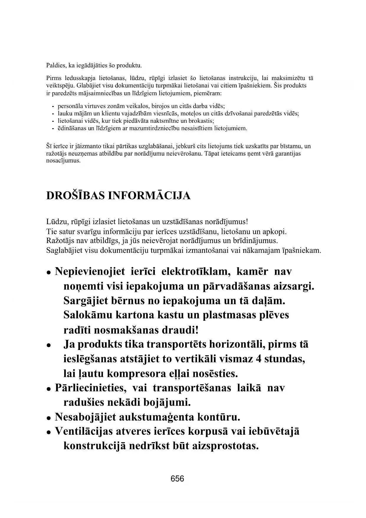 Lūdzu, rūpīgi izlasiet lietošanas un uzstādīšanas norādījumus! Tie satur svarīgu informāciju par ierīces uzstādīšanu, lietošanu un apkopi. Ražotājs nav atbildīgs, ja jūs neievērojat norādījumus un brīdinājumus. Saglabājiet visu dokumentāciju turpmākai izmantošanai vai nākamajam īpašniekam. ⚫ Nepievienojiet ierīci elektrotīklam, kamēr nav noņemti visi iepakojuma un pārvadāšanas aizsargi. Sargājiet bērnus no iepakojuma un tā daļām. Salokāmu kartona kastu un plastmasas plēves radīti nosmakšanas draudi! ⚫ Ja produkts tika transportēts horizontāli, pirms tā ieslēgšanas atstājiet to vertikāli vismaz 4 stundas, lai ļautu kompresora eļļai nosēsties. ⚫ Pārliecinieties, vai transportēšanas laikā nav radušies nekādi bojājumi. ⚫ Nesabojājiet aukstumaģenta kontūru. ⚫ Ventilācijas atveres ierīces korpusā vai iebūvētajā konstrukcijā nedrīkst būt aizsprostotas.657 ⚫ Nekad nemazgājiet kompresoru ar ūdeni, pēc tīrīšanas rūpīgi noslaukiet to ar sausu drānu, lai novērstu rūsēšanu. ⚫ Ierīce jānes un jāpārvieto vismaz diviem cilvēkiem, jo tā ir smaga. ⚫ Uzstādiet un nolīmeņojiet ierīci tās izmēram un lietošanas mērķim piemērotā vietā. ⚫ Pārliecinieties, vai informācija par elektrību uz datu plāksnītes atbilst barošanas avotam. Ja tā neatbilst, sazinieties ar elektrotehniķi. ⚫ Ierīces barošanu nodrošina 220–240 V maiņstrāva ar 50 Hz frekvenci. Anormālu sprieguma svārstību gadījumā ierīce var neieslēgties, var tikt radīti temperatūras regulatora vai kompresora bojājumi vai ierīces darbības laikā var būt dzirdami neparasti trokšņi. Šādā gadījumā ir jāuzstāda automātiskais regulators. ⚫ Tikai Apvienotajai Karalistei: ierīces barošanas kabelis ir aprīkots ar 3 vadu (zemējuma) kontaktdakšu, kas atbilst standarta 3 vadu (zemētai) kontaktligzdai. Nekad neatvienojiet un nenoņemiet trešo tapiņu (zemējumu). Pēc ierīces uzstādīšanas kontaktdakšai ir jābūt pieejamai. ⚫ Pēc ierīces nešanas/pārvietošanas pārliecinieties, ka strāvas kabelis nav aizķēries zem ierīces, lai izvairītos no strāvas kabeļa sagriešanas vai sabojāšanas. Ja barošanas vads ir bojāts, lai658 izvairītos no riska, tas jānomaina ražotājam, tā klientu apkalpošanas dienesta pārstāvim vai līdzīgi kvalificētai personai. ⚫ Neuzstādiet ierīci mitrās, eļļainās vai putekļainās vietās, kā arī nepakļaujiet to tiešu saules staru un ūdens iedarbībai. ⚫ Neuzstādiet ierīci sildītāju vai viegli uzliesmojošu materiālu tuvumā. ⚫ Ierīcēm ar saldētavas nodalījumu: strāvas padeves traucējumu gadījumā neatveriet vāku. Ja strāvas padeves pārtraukums ir īsāks par laiku, kas norādīts uz tehnisko datu uzlīmes (temperatūras paaugstināšanās laiks), tam nebūtu jāietekmē saldētie produkti. Ja pārtraukums ir ilgāks, tad produkti ir jāpārbauda un nekavējoties jāpatērē vai jāpagatavo un pēc tam atkārtoti jāsasaldē. ⚫ Ja konstatējat, ka ierīces vāku ir grūti atvērt uzreiz pēc tā aizvēršanas, neuztraucieties. Tas ir saistīts ar spiediena starpību, kas izlīdzināsies, un pēc dažām minūtēm vāku varēs atvērt kā parasti. ⚫ Ierīcē neglabājiet zāles, bakteriālos vai ķīmiskos līdzekļus. Šī ierīce ir mājsaimniecības ierīce. Tajā nav ieteicams uzglabāt materiālus, kuriem nepieciešama stingra temperatūras kontrole. ⚫ Nevelciet pārāk stipri strāvas vadu un nelokiet to, un nepieskarieties kontaktdakšai ar mitrām rokām.659 ⚫ Neuzglabājiet ierīcē produktus, kas satur uzlies- mojošu propelentu (piem., aerosola baloniņus) vai sprādzienbīstamas vielas. Sprādziena risks! ⚫ Nenovietojiet nestabilus priekšmetus (smagus priekšmetus, ar ūdeni piepildītus traukus) uz ledusskapja virsmas, lai izvairītos no traumām, ko var izraisīt priekšmetu nokrišana, vai elektriskās strāvas trieciena, saskaroties ar ūdeni. ⚫ Pārtikas uzglabāšanas nodalījumos neizmantojiet nekādas elektroierīces, izņemot tās, kuras ieteicis ražotājs. ⚫ Nepieskarieties iekšējiem dzesēšanas elementiem, īpaši ar mitrām rokām, lai izvairītos no plaisu rašanās vai savainojumiem. ⚫ Galvenais apdraudējums šeit ir bērniem, cilvēkiem ar ierobežotām fiziskām, garīgām vai maņu spējām, kā arī cilvēki, kuriem nav pietiekamu zināšanu par drošu ierīces lietošanu. ⚫ Pārliecinieties, vai bērni un neaizsargātas personas ir sapratušas apdraudējumu. Par drošību atbildīgajai personai ir jāuzrauga vai jāinstruē bērni un neaizsargātas personas, kas izmanto šo ierīci. Šo ierīci drīkst lietot tikai bērni no 8 gadu vecuma. ⚫ Bērni nedrīkst spēlēties ar šo ierīci. ⚫ Bērniem vecumā no 3 līdz 8 gadiem ir atļauts ievietot un izņemt produktus no šīs ierīces.660 ⚫ Ierīcēm ar saldētavas nodalījumu: saldētavas nodalījumā neuzglabājiet pudelēs vai bundžās pildītus šķidrumus (īpaši gāzētus dzērienus). Pudeles un bundžas var plīst! ⚫ Ierīcēm ar saldētavas nodalījumu: nekad nelieciet mutē no saldētavas tikko izņemtus saldētus pārtikas produktus! Zemas temperatūras apdegumu risks! ⚫ Sargiet plastmasas detaļas un durvju blīvi no eļļas un smērvielām. Pretējā gadījumā plastmasas daļas un durvju blīve kļūs poraina. ⚫ Pirms jebkādu darbību veikšanas atvienojiet strāvas vadu no kontaktligzdas. ⚫ Neizmantojiet nekādas mehāniskas ierīces vai citus atkausēšanas procesa paātrināšanas līdzekļus, izņemot tos, kurus ieteicis ražotājs. ⚫ Neizmantojiet smailus vai asus priekšmetus, piemēram, nažus vai dakšas, lai atbrīvotos no apsarmojuma. ⚫ Atkausēšanai nekad neizmantojiet fēnus, elektriskos sildītājus vai citas līdzīgas elektroierīces. ⚫ Kontaktdakšu ieteicams uzturēt tīru, jo pārmērīga putekļu uzkrāšanās uz kontaktdakšas var izraisīt aizdegšanos. ⚫ Nem