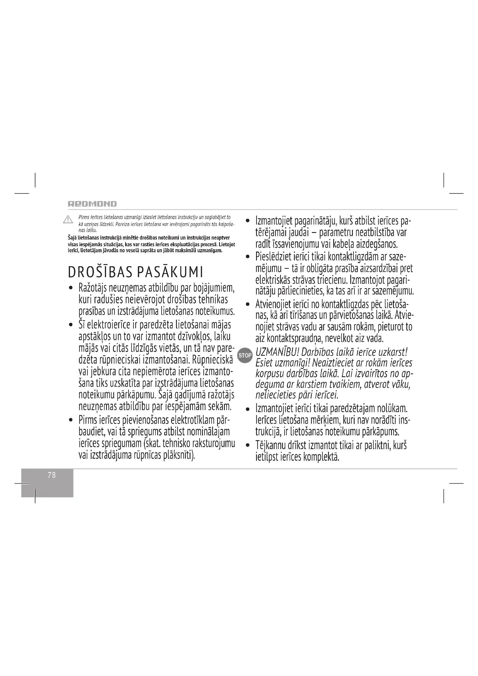 - Standarta garantija ir 1 gads. Papildu gadu bezmaksas servi- sa apkopes tiek piešķirts pēc reģistrācijas programmā Ready for Sky. Informācija par noteikumiem un nosacījumiem jūsu valstī ir pieejama mājas lapā www.r4s.redmond.company. Garantija 1 + 1 ir pieejama ierobežotam skaitam valstu. Ekoloģiski nekaitīga utilizācija (elektronisko un elektrisko ierīču utili- zācija) Iepakojumu, lietošanas instrukciju, kā arī pašu ierīci nepieciešams utilizēt at- bilstoši vietējai atkritumu pārstrādes programmai. Rūpējieties par apkārtējo dabu: neizmetiet šādus izstrādājumus kopā ar parastajiem sadzīves atkritumiem. Izmantotās (vecās) ierīces nedrīkst izmest kopā ar citiem sadzīves atkritumiem, tos ir nepieciešams utilizēt atsevišķi. Vecās tehnikas īpašniekiem ir jānodod to speciālos pieņemšanas punktos vai atbilstošai organizācijai. Tādā veidā Jūs palīdzat vērtīgo izejvielu pārstrādes procesam. Dotā ierīce ir nomarķēta atbilstoši Eiropas direktīvai 2012/19/EU, kas regulē elek- trisko un elektronisko iekārtu utilizāciju. Dotā direktīva nosaka galvenās elektrisko un elektroniski iekārtu atkritumu utilizā- cijas un pārstrādes prasības, kuras darbojas visā Eiropas Savienības teritorijā. Bluetooth ir kompānijas Bluetooth SIG, Inc. reģistrētā preču zīme. App Store ir Apple Inc. pakalpojumu zīme, kura ir reģistrēta ASV un citās valstīs. Google Play ir kompānijas Google Inc. reģistrētā preču zīme.84 Enne kasutamist lugege hoolikalt läbi kasutusjuhend ja hoidke see teatmikuna alles. Seadme õige kasutamine pikendab oluliselt selle teenistusaega. Käesolevas juhendis olevad ohutusmeetmed ja instruktsioonid ei hõlma kõik võima- likud olukorrad, mis võivad tekkida seadme kasutamise protsessis. Seadme kasutami- sel kasutaja peab juhinduma tervest mõistusest, olla ettevaatlik ja tähelepanelik. OHUTUSMEETMED