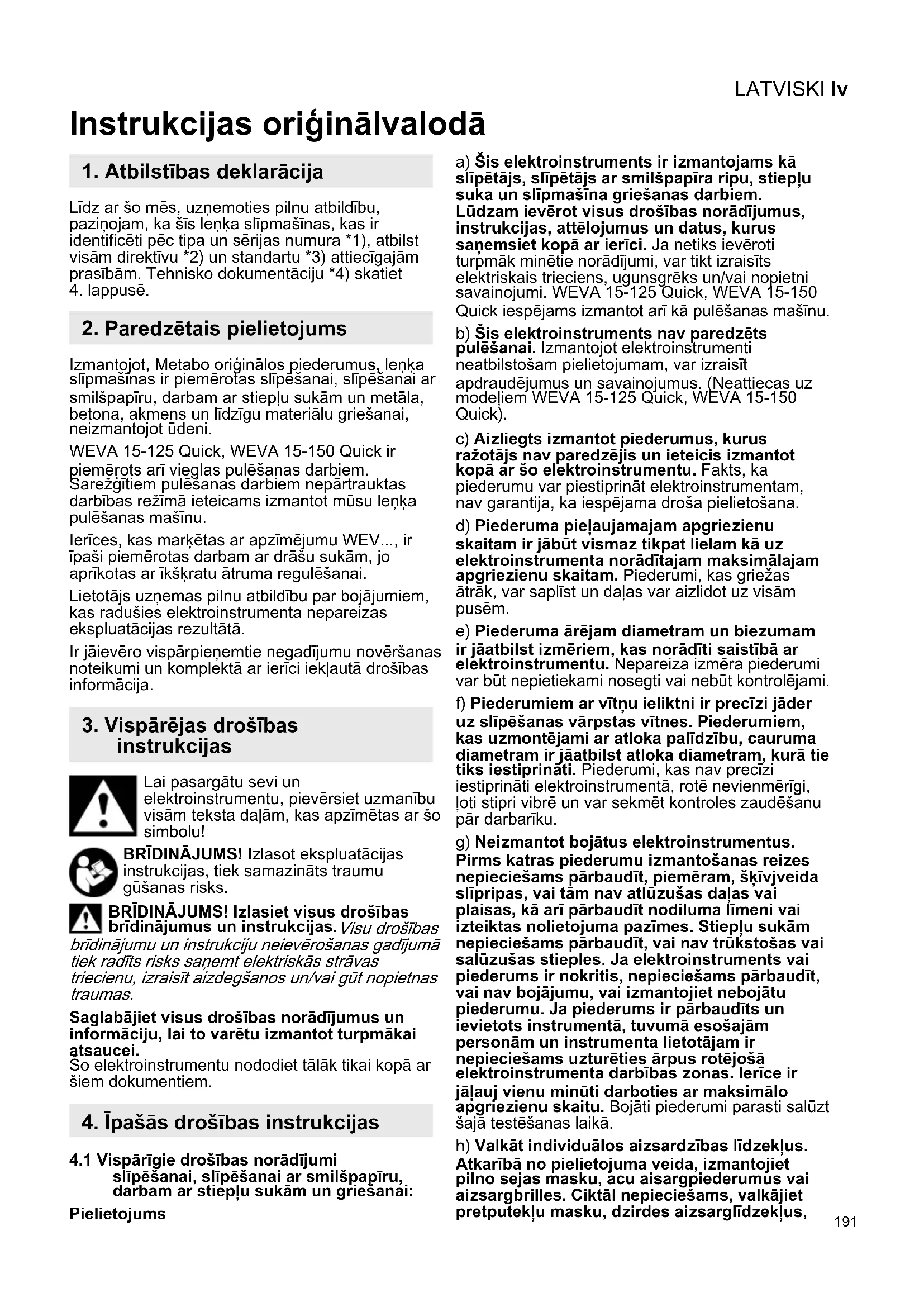Izmantojot, Metabo oriģinālos piederumus, leņķa slīpmašīnas ir piemērotas slīpēšanai, slīpēšanai ar smilšpapīru, darbam ar stiepļu sukām un metāla, betona, akmens un līdzīgu materiālu griešanai, neizmantojot ūdeni. WEVA 15-125 Quick, WEVA 15-150 Quick ir piemērots arī vieglas pulēšanas darbiem. Sarežģītiem pulēšanas darbiem nepārtrauktas darbības režīmā ieteicams izmantot mūsu leņķa pulēšanas mašīnu. Ierīces, kas marķētas ar apzīmējumu WEV..., ir īpaši piemērotas darbam ar drāšu sukām, jo aprīkotas ar īkšķratu ātruma regulēšanai. Lietotājs uzņemas pilnu atbildību par bojājumiem, kas radušies elektroinstrumenta nepareizas ekspluatācijas rezultātā. Ir jāievēro vispārpieņemtie negadījumu novēršanas noteikumi un komplektā ar ierīci iekļautā drošības informācija. Lai pasargātu sevi un elektroinstrumentu, pievērsiet uzmanību visām teksta daļām, kas apzīmētas ar šo simbolu! BRĪDINĀJUMS! Izlasot ekspluatācijas instrukcijas, tiek samazināts traumu gūšanas risks. BRĪDINĀJUMS! Izlasiet visus drošības brīdinājumus un instrukcijas. Visu drošības brīdinājumu un instrukciju neievērošanas gadījumā tiek radīts risks saņemt elektriskās strāvas triecienu, izraisīt aizdegšanos un/vai gūt nopietnas traumas. Saglabājiet visus drošības norādījumus un informāciju, lai to varētu izmantot turpmākai atsaucei. Šo elektroinstrumentu nododiet tālāk tikai kopā ar šiem dokumentiem.