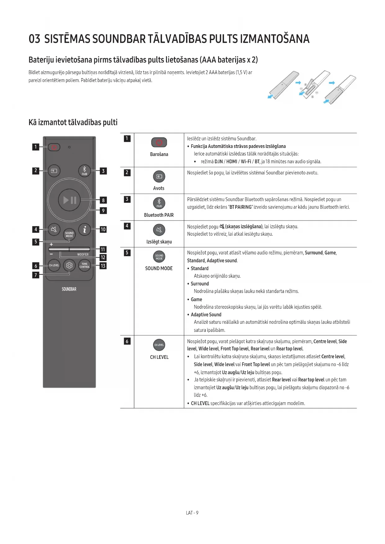 - Šo ierīci vai citus komponentus nedrīkst pievienot maiņstrāvas kontaktligzdai, līdz ir izveidoti visi savienojumi starp komponentiem.LAT - 9 03 SISTĒMAS SOUNDBAR TĀLVADĪBAS PULTS IZMANTOŠANA Bateriju ievietošana pirms tālvadības pults lietošanas (AAA baterijas x 2) Bīdiet aizmugurējo pārsegu bultiņas norādītajā virzienā, līdz tas ir pilnībā noņemts. Ievietojiet 2 AAA baterijas (1,5 V) ar pareizi orientētiem poliem. Pabīdiet bateriju vāciņu atpakaļ vietā. Kā izmantot tālvadības pulti SOUNDBAR
