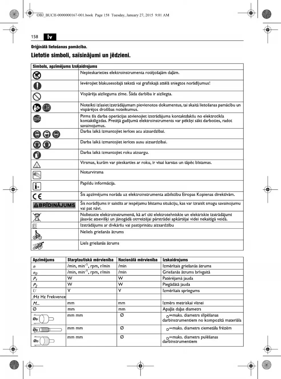 Oriģinālā lietošanas pamācība. Lietotie simboli, saīsinājumi un jēdzieni. Simbols, apzīmējums Izskaidrojums Nepieskarieties elektroinstrumenta rotējošajām daļām. Ievērojiet blakusesošajā tekstā vai grafiskajā attēlā sniegtos norādījumus! Vispārēja aizlieguma zīme. Šāda darbība ir aizliegta. Noteikti izlasiet izstrādājumam pievienotos dokumentus, tai skaitā lietošanas pamācību un vispārējos drošības noteikumus. Pirms šīs darba operācijas atvienojiet izstrādājuma kontaktdakšu no elektrotīkla kontaktligzdas. Pretējā gadījumā elektroinstruments var pēkšņi sākt darboties, radot savainojumus. Darba laikā izmantojiet ierīces acu aizsardzībai. Darba laikā izmantojiet ierīces ausu aizsardzībai. Darba laikā izmantojiet roku aizsargu. Virsmas, kurām var pieskarties ar roku, ir visai karstas un tāpēc bīstamas. Noturvirsma Papildu informācija. Šis apzīmējums norāda uz elektroinstrumenta atbilstību Eiropas Kopienas direktīvām. Šis norādījums ir saistīts ar iespējamu bīstamu situāciju, kas var izraisīt smagu savainojumu vai pat nāvi. Nolietotie elektroinstrumenti, kā arī citi elektrotehniskie un elektriskie izstrādājumi jāsavāc atsevišķi un jānogādā otrreizējai pārstrādei apkārtējai videi nekaitīgā veidā. Izstrādājums ar divkāršu vai pastiprinātu aizsardzību Neliels griešanās ātrums Liels griešan ās ātrums Apzīmējums Starptautiskā mērvienība Nacionālā mērvienība Izskaidrojums