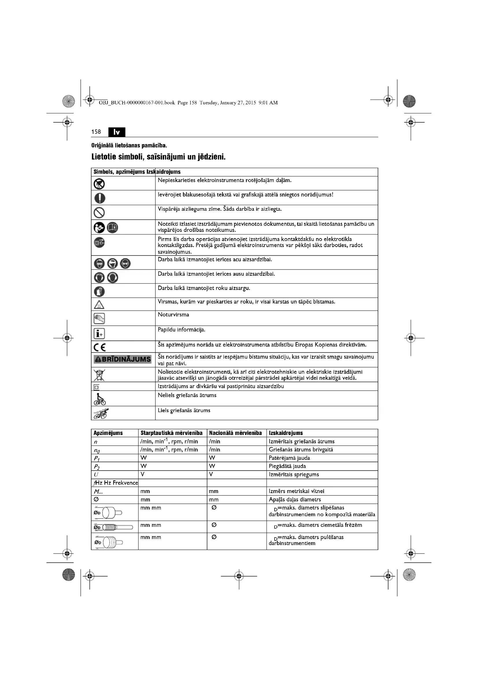 Oriģinālā lietošanas pamācība. Lietotie simboli, saīsinājumi un jēdzieni. Simbols, apzīmējums Izskaidrojums Nepieskarieties elektroinstrumenta rotējošajām daļām. Ievērojiet blakusesošajā tekstā vai grafiskajā attēlā sniegtos norādījumus! Vispārēja aizlieguma zīme. Šāda darbība ir aizliegta. Noteikti izlasiet izstrādājumam pievienotos dokumentus, tai skaitā lietošanas pamācību un vispārējos drošības noteikumus. Pirms šīs darba operācijas atvienojiet izstrādājuma kontaktdakšu no elektrotīkla kontaktligzdas. Pretējā gadījumā elektroinstruments var pēkšņi sākt darboties, radot savainojumus. Darba laikā izmantojiet ierīces acu aizsardzībai. Darba laikā izmantojiet ierīces ausu aizsardzībai. Darba laikā izmantojiet roku aizsargu. Virsmas, kurām var pieskarties ar roku, ir visai karstas un tāpēc bīstamas. Noturvirsma Papildu informācija. Šis apzīmējums norāda uz elektroinstrumenta atbilstību Eiropas Kopienas direktīvām. Šis norādījums ir saistīts ar iespējamu bīstamu situāciju, kas var izraisīt smagu savainojumu vai pat nāvi. Nolietotie elektroinstrumenti, kā arī citi elektrotehniskie un elektriskie izstrādājumi jāsavāc atsevišķi un jānogādā otrreizējai pārstrādei apkārtējai videi nekaitīgā veidā. Izstrādājums ar divkāršu vai pastiprinātu aizsardzību Neliels griešanās ātrums Liels griešan ās ātrums Apzīmējums Starptautiskā mērvienība Nacionālā mērvienība Izskaidrojums