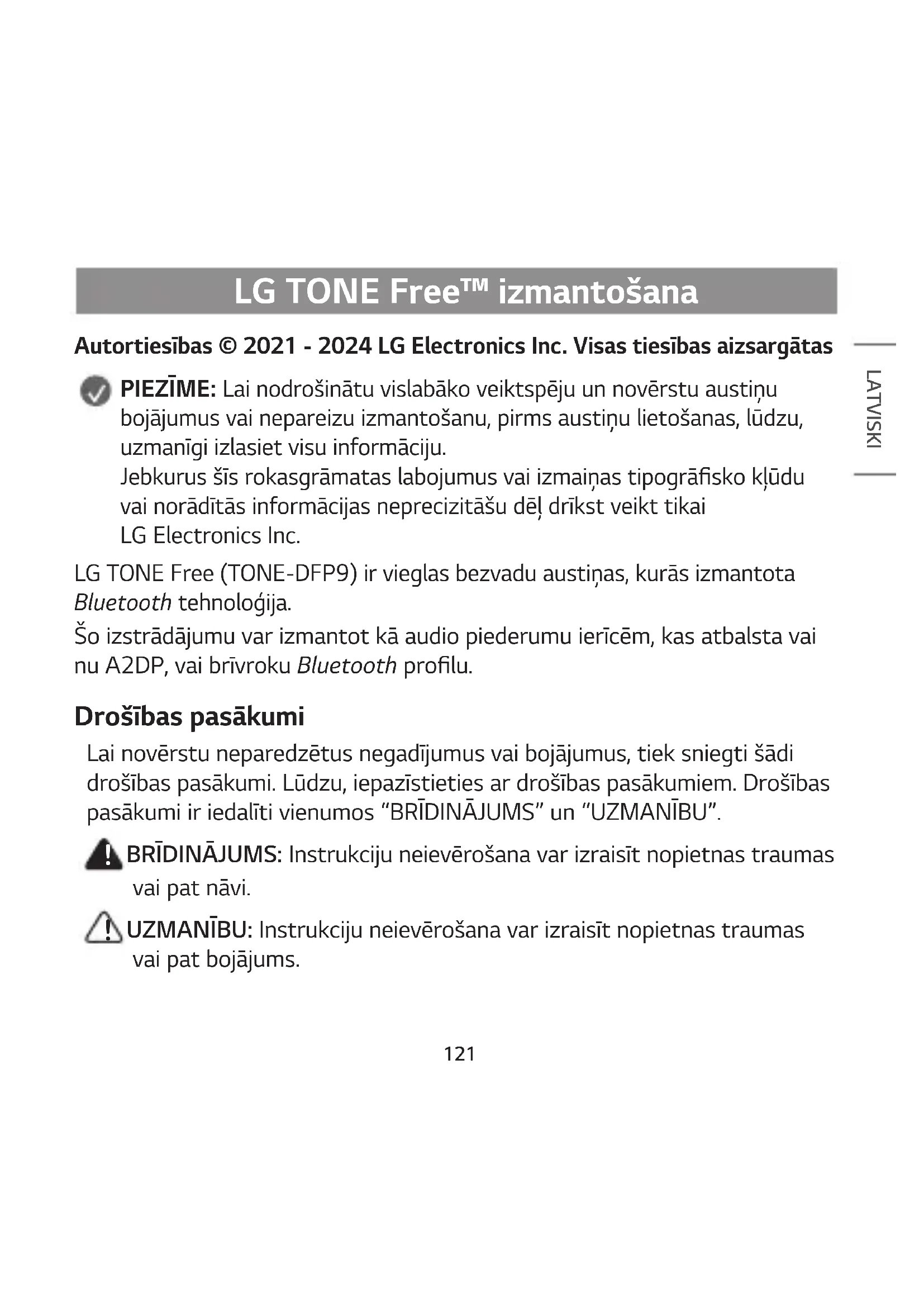 Autortiesības © 2021 - 2024 LG Electronics Inc. Visas tiesības aizsargātas PIEZĪME: Lai nodrošinātu vislabāko veiktspēju un novērstu austiņu bojājumus vai nepareizu izmantošanu, pirms austiņu lietošanas, lūdzu, uzmanīgi izlasiet visu informāciju. Jebkurus šīs rokasgrāmatas labojumus vai izmaiņas tipogrāsko kļūdu vai norādītās informācijas neprecizitāšu dēļ drīkst veikt tikai LG Electronics Inc. LG TONE Free (TONE-DFP9) ir vieglas bezvadu austiņas, kurās izmantota Bluetooth tehnoloģija. Šo izstrādājumu var izmantot kā audio piederumu ierīcēm, kas atbalsta vai nu A2DP, vai brīvroku Bluetooth prolu. Drošības pasākumi Lai novērstu neparedzētus negadījumus vai bojājumus, tiek sniegti šādi drošības pasākumi. Lūdzu, iepazīstieties ar drošības pasākumiem. Drošības pasākumi ir iedalīti vienumos “BRĪDINĀJUMS” un “UZMANĪBU”.