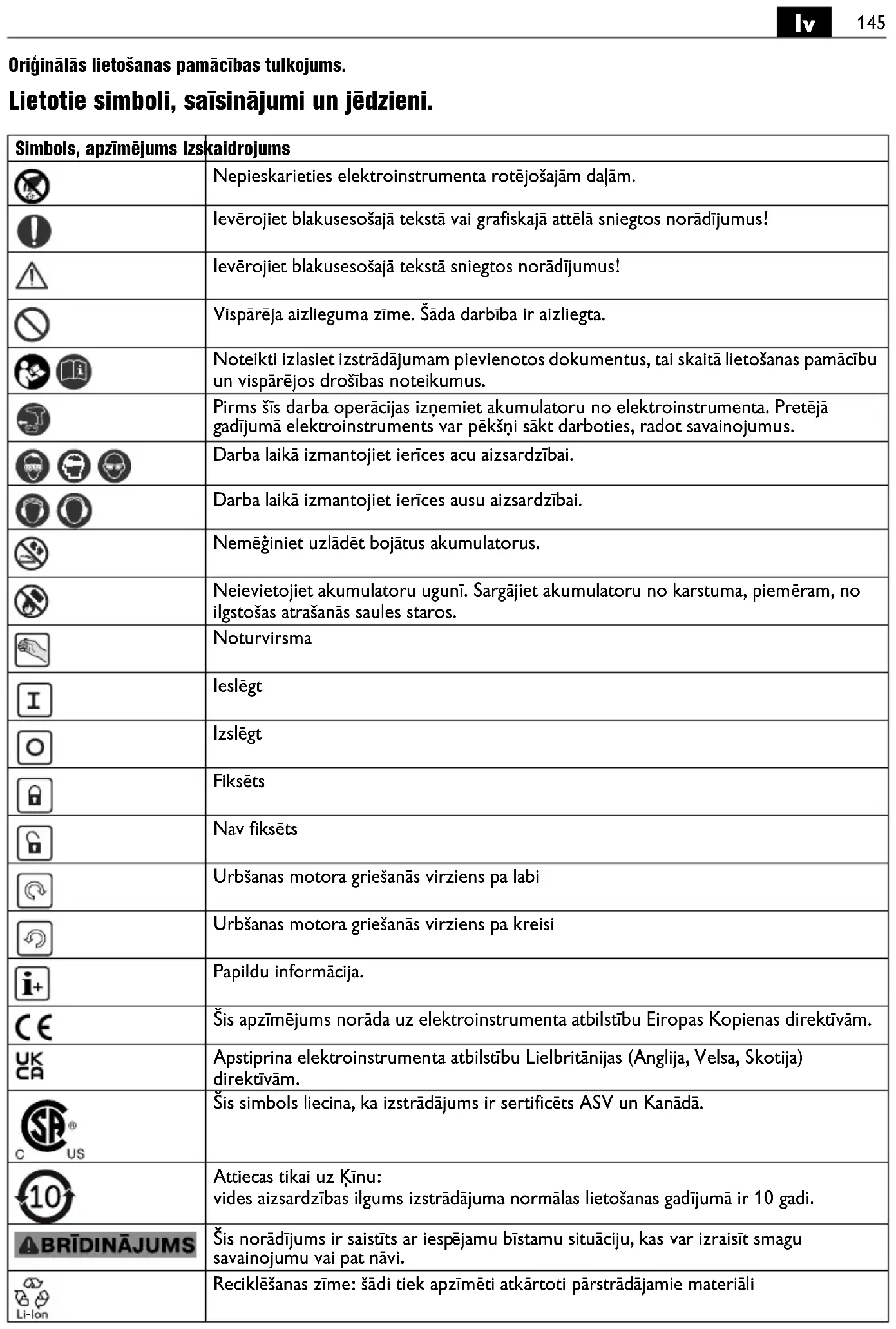 Oriģinālās lietošanas pamācības tulkojums. Lietotie simboli, saīsinājumi un jēdzieni. Simbols, apzīmējums Izskaidrojums Nepieskarieties elektroinstrumenta rotējošajām daļām. Ievērojiet blakusesošajā tekstā vai grafiskajā attēlā sniegtos norādījumus! Ievērojiet blakusesošajā tekstā sniegtos norādījumus! Vispārēja aizlieguma zīme. Šāda darbība ir aizliegta. Noteikti izlasiet izstrādājumam pievienotos dokumentus, tai skaitā lietošanas pamācību un vispārējos drošības noteikumus. Pirms šīs darba operācijas izņemiet akumulatoru no elektroinstrumenta. Pretējā gadījumā elektroinstruments var pēkšņi sākt darboties, radot savainojumus. Darba laikā izmantojiet ierīces acu aizsardzībai. Darba laikā izmantojiet ierīces ausu aizsardz ībai. Nemēģiniet uzlādēt bojātus akumulatorus. Neievietojiet akumulatoru ugunī. Sargājiet akumulatoru no karstuma, piemēram, no ilgstošas atrašanās saules staros. Noturvirsma Ieslēgt Izslēgt Fiksēts Nav fiksēts Urbšanas motora griešanās virziens pa labi Urbšanas motora griešanās virziens pa kreisi Papildu informācija. Šis apzīmējums norāda uz elektroinstrumenta atbilstību Eiropas Kopienas direktīvām. Apstiprina elektroinstrumenta atbilstību Lielbritānijas (Anglija, Velsa, Skotija) direktīvām. Šis simbols liecina, ka izstrādājums ir sertificēts ASV un Kanādā. Attiecas tikai uz Ķīnu: vides aizsardzības ilgums izstrādājuma normālas lietošanas gadījumā ir 10 gadi. Šis norādījums ir saistīts ar iesp ējamu bīstamu situāciju, kas var izraisīt smagu savainojumu vai pat nāvi. Reciklēšanas zīme: šādi tiek apzīmēti atkārtoti pārstrādājamie materiāli146