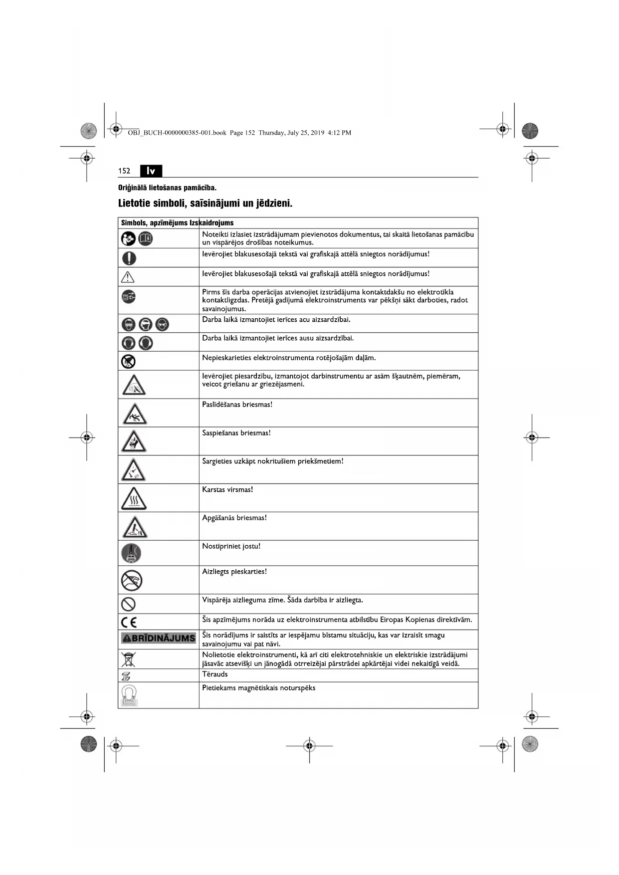 Oriģinālā lietošanas pamācība. Lietotie simboli, saīsinājumi un jēdzieni. Simbols, apzīmējums Izskaidrojums Noteikti izlasiet izstrādājumam pievienotos dokumentus, tai skaitā lietošanas pamācību un vispārējos drošības noteikumus. Ievērojiet blakusesošajā tekstā vai grafiskajā attēlā sniegtos norādījumus! Ievērojiet blakusesošajā tekstā vai grafiskajā attēlā sniegtos norādījumus! Pirms šīs darba operācijas atvienojiet izstrādājuma kontaktdakšu no elektrotīkla kontaktligzdas. Pretējā gadījumā elektroinstruments var pēkšņi sākt darboties, radot savainojumus. Darba laikā izmantojiet ierīces acu aizsardzībai. Darba laikā izmantojiet ierīces ausu aizsardzībai. Nepieskarieties elektroinstrumenta rotējošajām daļām. Ievērojiet piesardzību, izmantojot darbinstrumentu ar asām šķautnēm, piemēram, veicot griešanu ar griezējasmeni. Paslīdēšanas briesmas! Saspiešanas briesmas! Sargieties uzkāpt nokritušiem priekšmetiem! Karstas virsmas! Apgāšanās briesmas! Nostipriniet jostu! Aizliegts pieskarties! Vispārēja aizlieguma zīme. Šāda darbība ir aizliegta. Šis apzīmējums norāda uz elektroinstrumenta atbilstību Eiropas Kopienas direktīvām. Šis norādījums ir saistīts ar iespējamu bīstamu situāciju, kas var izraisīt smagu savainojumu vai pat nāvi. Nolietotie elektroinstrumenti, kā arī citi elektrotehniskie un elektriskie izstrādājumi jāsavāc atsevišķi un jānogādā otrreizējai pārstr ādei apkārtējai videi nekaitīgā veidā. Tērauds Pietiekams magnētiskais noturspēks OBJ_BUCH-0000000385-001.book Page 152 Thursday, July 25, 2019 4:12 PM153