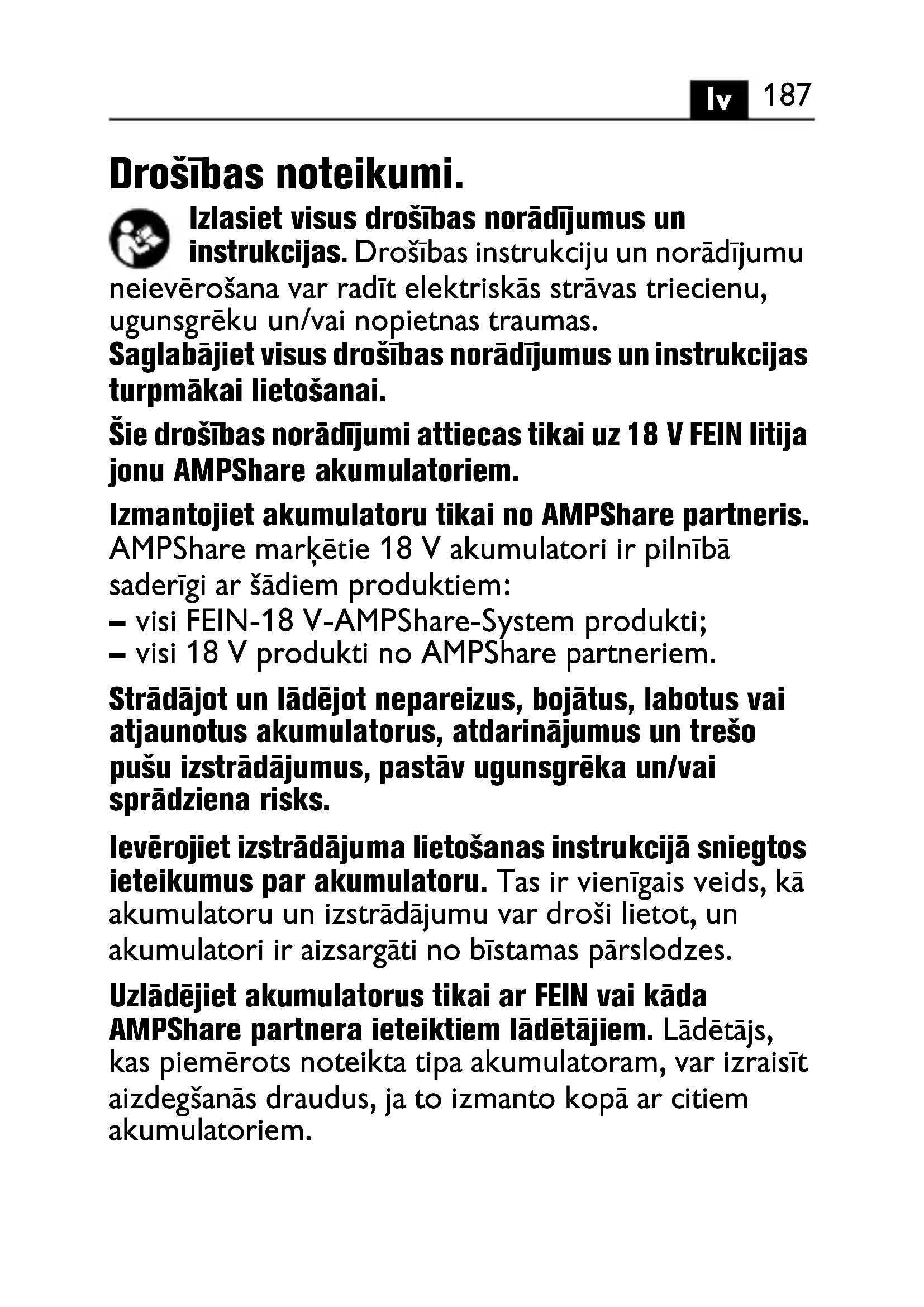 Drošības noteikumi. Izlasiet visus drošības norādījumus un instrukcijas. Drošības instrukciju un norādījumu neievērošana var radīt elektriskās strāvas triecienu, ugunsgrēku un/vai nopietnas traumas. Saglabājiet visus drošības norādījumus un instrukcijas turpmākai lietošanai. Šie drošības norādījumi attiecas tikai uz 18 V FEIN litija jonu AMPShare akumulatoriem. Izmantojiet akumulatoru tikai no AMPShare partneris. AMPShare marķētie 18 V akumulatori ir pilnībā saderīgi ar šādiem produktiem: – visi FEIN-18 V-AMPShare-System produkti; – visi 18 V produkti no AMPShare partneriem. Strādājot un lādējot nepareizus, bojātus, labotus vai atjaunotus akumulatorus, atdarinājumus un trešo pušu izstrādājumus, pastāv ugunsgrēka un/vai sprādziena risks. Ievērojiet izstrādājuma lietošanas instrukcijā sniegtos ieteikumus par akumulatoru. Tas ir vienīgais veids, kā akumulatoru un izstrādājumu var droši lietot, un akumulatori ir aizsargāti no bīstamas pārslodzes. Uzlādējiet akumulatorus tikai ar FEIN vai kāda AMPShare partnera ieteiktiem lādētājiem. Lādētājs, kas piemērots noteikta tipa akumulatoram, var izraisīt aizdegšanās draudus, ja to izmanto kopā ar citiem akumulatoriem.188