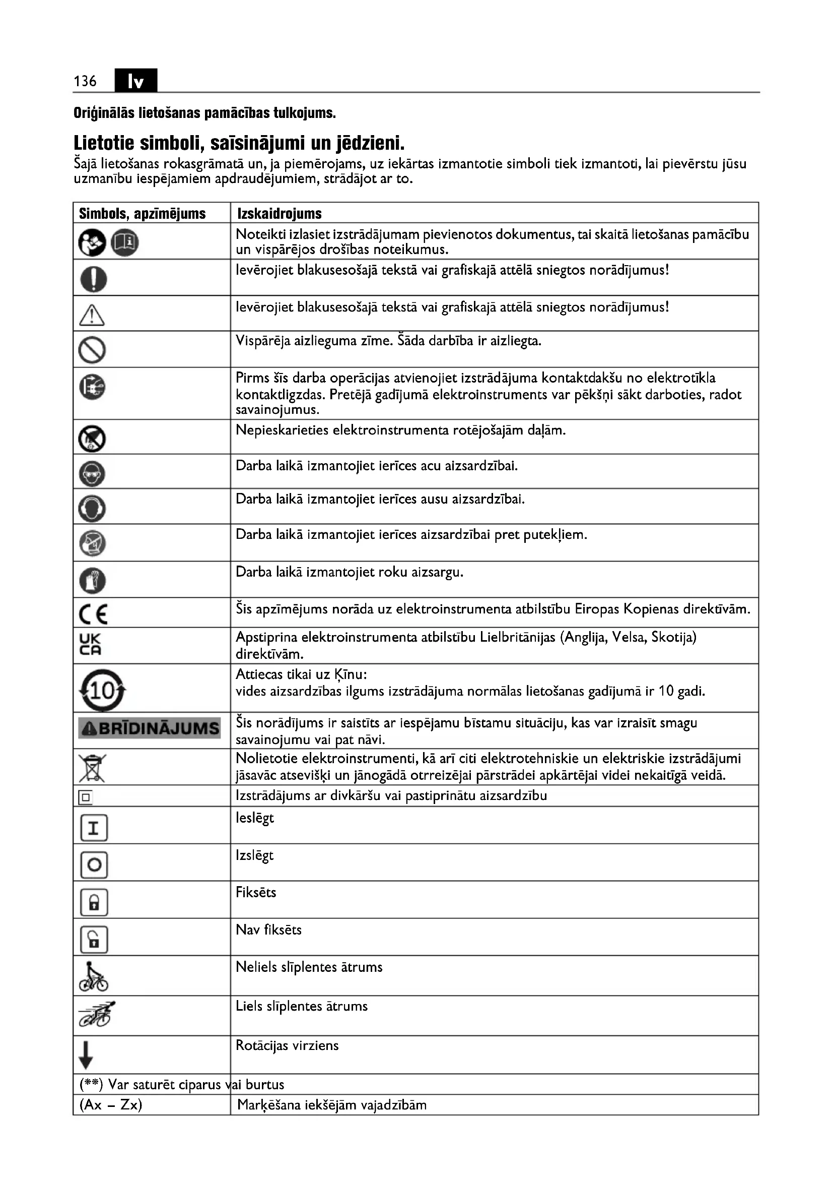 Oriģinālās lietošanas pamācības tulkojums. Lietotie simboli, saīsinājumi un jēdzieni. Šajā lietošanas rokasgrāmatā un, ja piemērojams, uz iekārtas izmantotie simboli tiek izmantoti, lai pievērstu jūsu uzmanību iespējamiem apdraudējumiem, strādājot ar to. Simbols, apzīmējums Izskaidrojums Noteikti izlasiet izstrādājumam pievienotos dokumentus, tai skaitā lietošanas pamācību un vispārējos drošības noteikumus. Ievērojiet blakusesošajā tekstā vai grafiskajā attēlā sniegtos norādījumus! Ievērojiet blakusesošajā tekstā vai grafiskajā attēlā sniegtos norādījumus! Vispārēja aizlieguma zīme. Šāda darbība ir aizliegta. Pirms šīs darba operācijas atvienojiet izstrād ājuma kontaktdakšu no elektrotīkla kontaktligzdas. Pretējā gadījumā elektroinstruments var pēkšņi sākt darboties, radot savainojumus. Nepieskarieties elektroinstrumenta rotējošajām daļām. Darba laikā izmantojiet ierīces acu aizsardzībai. Darba laikā izmantojiet ierīces ausu aizsardzībai. Darba laikā izmantojiet ierīces aizsardzībai pret putekļiem. Darba laikā izmantojiet roku aizsargu. Šis apzīmējums norāda uz elektroinstrumenta atbilstību Eiropas Kopienas direktīvām. Apstiprina elektroinstrumenta atbilstību Lielbritānijas (Anglija, Velsa, Skotija) direktīvām. Attiecas tikai uz Ķīnu: vides aizsardzības ilgums izstrādājuma normālas lietošanas gadījumā ir 10 gadi. Šis norādījums ir saistīts ar iespējamu b īstamu situāciju, kas var izraisīt smagu savainojumu vai pat nāvi. Nolietotie elektroinstrumenti, kā arī citi elektrotehniskie un elektriskie izstrādājumi jāsavāc atsevišķi un jānogādā otrreizējai pārstrādei apkārtējai videi nekaitīgā veidā. Izstrādājums ar divkāršu vai pastiprinātu aizsardzību Ieslēgt Izslēgt Fiksēts Nav fiksēts Neliels slīplentes ātrums Liels slīplentes ātrums Rotācijas virziens (**) Var saturēt ciparus vai burtus (Ax – Zx) Marķēšana iekšējām vajadzībām137