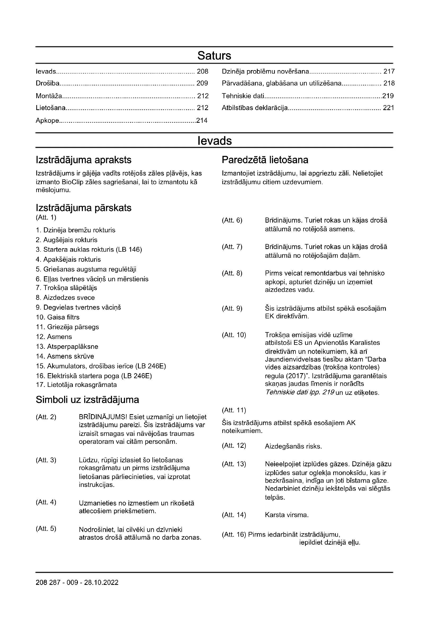 Simboli uz izstrādājuma (Att. 2) BRĪDINĀJUMS! Esiet uzmanīgi un lietojiet izstrādājumu pareizi. Šis izstrādājums var izraisīt smagas vai nāvējošas traumas operatoram vai citām personām. (Att. 3) Lūdzu, rūpīgi izlasiet šo lietošanas rokasgrāmatu un pirms izstrādājuma lietošanas pārliecinieties, vai izprotat instrukcijas. (Att. 4) Uzmanieties no izmestiem un rikošetā atlecošiem priekšmetiem. (Att. 5) Nodrošiniet, lai cilvēki un dzīvnieki atrastos drošā attālumā no darba zonas. (Att. 6) Brīdinājums. Turiet rokas un kājas drošā attālumā no rotējošā asmens. (Att. 7) Brīdinājums. Turiet rokas un kājas drošā attālumā no rotējošajām daļām. (Att. 8) Pirms veicat remontdarbus vai tehnisko apkopi, apturiet dzinēju un izņemiet aizdedzes vadu. (Att. 9) Šis izstrādājums atbilst spēkā esošajām EKdirektīvām. (Att. 10) Trokšņa emisijas vidē uzlīme atbilstoši ES un Apvienotās Karalistes direktīvām un noteikumiem, kā arī Jaundienvidvelsas tiesību aktam “Darba vides aizsardzības(trokšņa kontroles) regula(2017)”. Izstrādājuma garantētais skaņas jaudas līmenis ir norādīts Tehniskie dati lpp. 219 un uz etiķetes. (Att. 11) Šis izstrādājums atbilst spēkā esošajiem AK noteikumiem. (Att. 12) Aizdegšanās risks. (Att. 13) Neieelpojiet izplūdes gāzes. Dzinēja gāzu izplūdes satur oglekļa monoksīdu, kas ir bezkrāsaina, indīga un ļoti bīstama gāze. Nedarbiniet dzinēju iekštelpās vai slēgtās telpās. (Att. 14) Karsta virsma. (Att. 16) Pirms iedarbināt izstrādājumu, iepildiet dzinējā eļļu. 208 287 - 009 - 28.10.2022(Att. 17) Iedarbināšanas darbības mo- delim LB 146: Bīdiet dzinēja bremžu rokturi uz leju un vel- ciet startera auklas rokturi. (Att. 18) Iedarbināšanas darbības mo- delim LB 246E: Bīdiet dzinēja bremžu rokturi uz leju un no- spiediet iedarbināšanas pogu. (Att. 15) Skenējams kods. Piezīme: Pārējie uz izstrādājuma norādītie simboli/uzlīmes attiecas uz citu tirdzniecības nozaru sertifikācijas prasībām. Atbildība par izstrādājuma kvalitāti Saskaņā ar likumiem par izstrādājuma kvalitāti mēs neuzņemamies atbildību par bojājumiem, ko radījis mūsu izstrādājums, ja: