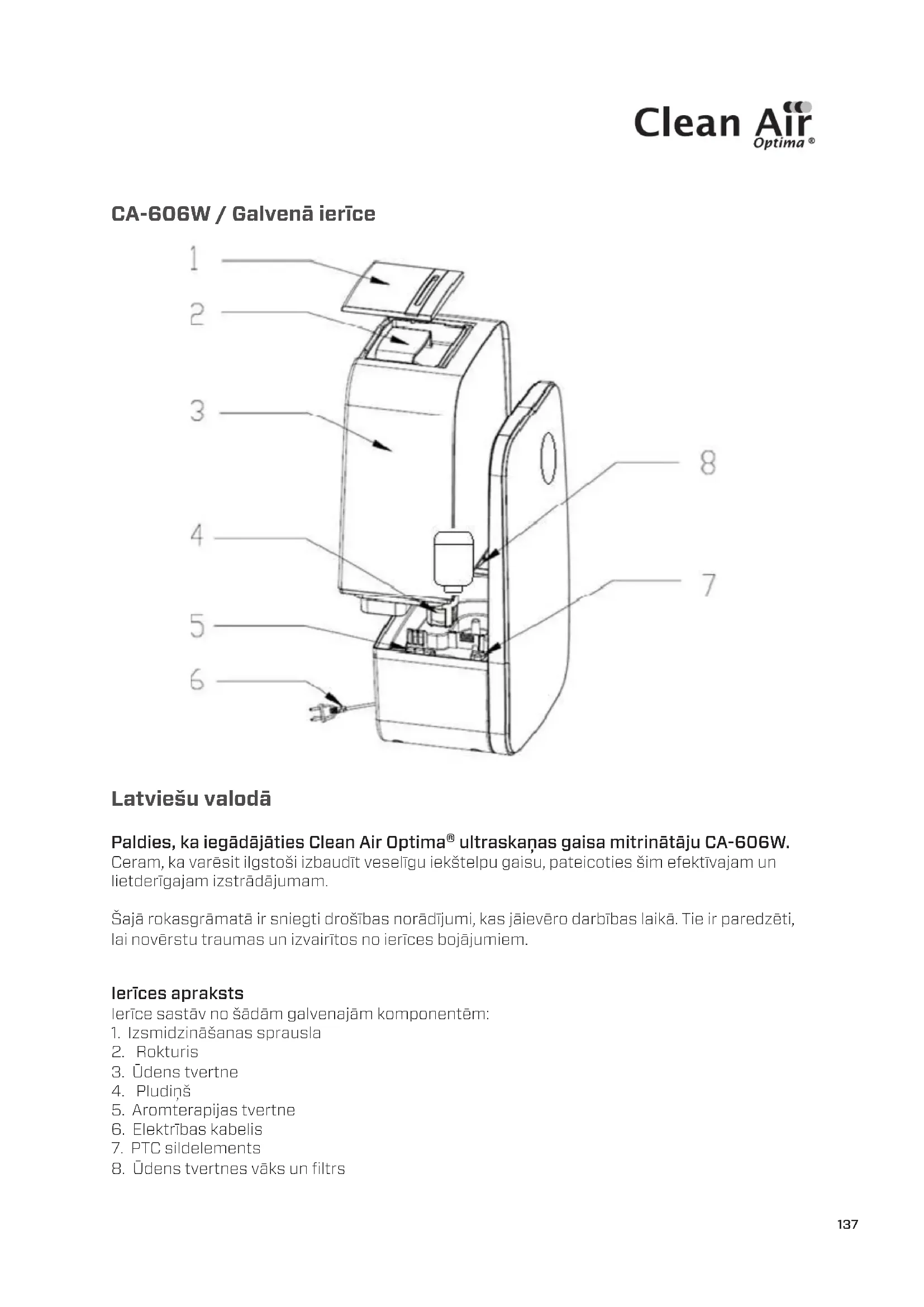 Latviešu valodā Paldies, ka iegādājāties Clean Air Optima® ultraskaņas gaisa mitrinātāju CA-606W. Ceram, ka varēsit ilgstoši izbaudīt veselīgu iekštelpu gaisu, pateicoties šim efektīvajam un lietderīgajam izstrādājumam. Šajā rokasgrāmatā ir sniegti drošības norādījumi, kas jāievēro darbības laikā. Tie ir paredzēti, lainovērstu traumas un izvairītos no ierīces bojājumiem. Ierīces apraksts Ierīce sastāv no šādām galvenajām komponentēm: