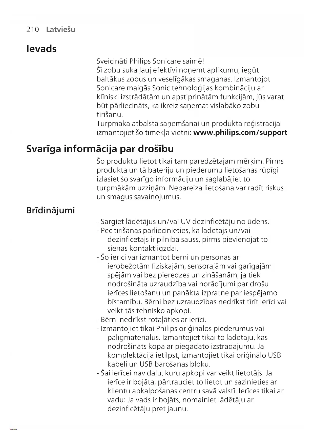 Latviešu Ievads Sveicināti Philips Sonicare saimē! Šī zobu suka ļauj efektīvi noņemt aplikumu, iegūt baltākus zobus un veselīgākas smaganas. Izmantojot Sonicare maigās Sonic tehnoloģijas kombināciju ar klīniski izstrādātām un apstiprinātām funkcijām, jūs varat būt pārliecināts, ka ikreiz saņemat vislabāko zobu tīrīšanu. Turpmāka atbalsta saņemšanai un produkta reģistrācijai izmantojiet šo tīmekļa vietni: www.philips.com/support Svarīga informācija par drošību Šo produktu lietot tikai tam paredzētajam mērķim. Pirms produkta un tā bateriju un piederumu lietošanas rūpīgi izlasiet šo svarīgo informāciju un saglabājiet to turpmākām uzziņām. Nepareiza lietošana var radīt riskus un smagus savainojumus. Brīdinājumi - Sargiet lādētājus un/vai UV dezinficētāju no ūdens. - Pēc tīrīšanas pārliecinieties, ka lādētājs un/vai dezinficētājs ir pilnībā sauss, pirms pievienojat to sienas kontaktligzdai. - Šo ierīci var izmantot bērni un personas ar ierobežotām fiziskajām, sensorajām vai garīgajām spējām vai bez pieredzes un zināšanām, ja tiek nodrošināta uzraudzība vai norādījumi par drošu ierīces lietošanu un panākta izpratne par iespējamo bīstamību. Bērni bez uzraudzības nedrīkst tīrīt ierīci vai veikt tās tehnisko apkopi. - Bērni nedrīkst rotaļāties ar ierīci. - Izmantojiet tikai Philips oriģinālos piederumus vai palīgmateriālus. Izmantojiet tikai to lādētāju, kas nodrošināts kopā ar piegādāto izstrādājumu. Ja komplektācijā ietilpst, izmantojiet tikai oriģinālo USB kabeli un USB barošanas bloku. - Šai ierīcei nav daļu, kuru apkopi var veikt lietotājs. Ja ierīce ir bojāta, pārtrauciet to lietot un sazinieties ar klientu apkalpošanas centru savā valstī. Ierīces tikai ar vadu: Ja vads ir bojāts, nomainiet lādētāju ar dezinficētāju pret jaunu.211 Latviešu - Neizmantojiet lādētāju un/vai dezinficētāju ārpus telpām vai karstu virsmu tuvumā. - Nemazgājiet nevienu izstrādājuma daļu trauku mazgājamajā mašīnā. - Šī ierīce ir paredzēta tikai zobu, smaganu un mēles tīrīšanai. - Dezinficētāju vienmēr glabājiet bērniem nepieejamā vietā. - Nelietojiet dezinficētāju, ja UVgaismas spuldze nenodziest vai vāks ir atvērts. UV gaisma var bojāt cilvēka acis un ādu. - Dezinficētāju izmantojiet tikai tad, ja ir uzstādīts aizsargekrāns. - Nepieskarieties dezinficētāja UV gaismas spuldzei, kamēr tā ir karsta. - Pārtrauciet lietot sukas uzgali, ja tās sari ir saspiesti vai saliekti. Nomainiet sukas uzgali ik pēc 3mēnešiem vai agrāk, ja tam ir redzamas nolietojuma pazīmes. - Nepieļaujiet tiešu saskari ar izstrādājumiem, kas satur ēteriskās eļļas vai kokosriekstu eļļu. Saskare ar eļļu var sekmēt sariņu izkrišanu. - Pārtrauciet ierīces lietošanu un konsultējieties ar savu zobārstu/ārstu, ja pēc lietošanas rodas pārmērīga asiņošana, ja pēc 1 lietošanas nedēļas turpinās asiņošana vai ja Jums rodas diskomforts vai sāpes. - Ja pēdējo divu mēnešu laikā jums ir bijušas mutes vai smaganu operācijas, pirms šīs ierīces lietošanas konsultējieties ar zobārstu. - Ja jums ir elektrokardiostimulators vai cita implantēta ierīce, pirms lietošanas konsultējieties ar ārstu vai implantētās ierīces ražotāju. - Ja jums radušās medicīniska rakstura šaubas, pirms šīs ierīces lietošanas konsultējieties ar ārstu. - Šī ir personīgās higiēnas ierīce, un tā nav paredzēta lietošanai vairākiem pacientiem zobārstniecības praksē vai iestādē. Bateriju drošības norādījumi - Šajā ierīcē ir baterijas, kuras nomainīt drīkst tikai kvalificēts speciālists.212 Latviešu - Šo produktu lietot tikai tam paredzētajam mērķim. Pirms produkta, tā bateriju un piederumu lietošanas rūpīgi izlasiet šo svarīgo informāciju un saglabājiet to turpmākām uzziņām. Nepareiza lietošana var radīt riskus un smagus savainojumus. Komplektā iekļautie piederumi dažādiem produktiem var atšķirties. - Izmantojiet tikai oriģinālos Philips piederumus un patēriņa preces. Izmantojiet tikai noņemamo barošanas bloku TCBxxxx, HX6100, HX6110, HX6160 vai WAAxxxx. - Nenovietojiet produktu un baterijas uguns tuvumā, kā arī nepakļaujiet tos tiešu saules staru vai augstas temperatūras iedarbībai. - Ja produkts pārlieku sakarst vai izdala smaku, maina krāsu vai uzlāde notiek ilgāk nekā parasti, pārtrauciet produkta lietošanu un uzlādi, un sazinieties ar Philips. - Izstrādājumus un to baterijas nedrīkst likt mikroviļņu krāsnīs vai uz indukcijas plītīm. - Neatveriet, nepārveidojiet, necaurduriet, nebojājiet vai neizjauciet izstrādājumu vai bateriju, lai novērstu bateriju sakaršanu vai indīgu vai bīstamu vielu noplūdi. Neizraisiet īsslēgumu, nepārlādējiet baterijas vai neveiciet to atgriezenisku uzlādi. - Šajā iekārtā iekļautas baterijas, kas nav nomaināmas. Kad baterija ir nokalpojusi, atbilstoši atbrīvojieties no ierīces, skatiet sadaļu Pārstrāde. - Ja baterijas ir bojātas vai ja tām radusies noplūde, izvairieties no saskares ar ādu vai acīm. Ja tā tomēr notiek, nekavējoties rūpīgi skalojiet ar ūdeni un vērsieties pēc medicīniskas palīdzības. - Rīkojoties ar baterijām, pārliecinieties, ka gan jūsu rokas, gan arī izstrādājums un baterijas ir sausi. - Lai pēc bateriju izņemšanas tām nerastos īsslēgums, neļaujiet bateriju kontaktiem saskarties ar metāla priekšmetiem (piem., monētām, matu sprādzēm, gredzeniem). Netiniet baterijas alumīnija folijā. Pirms likvidējat, aptiniet bateriju spailes ar līmlentu vai ievietojiet baterijas plastmasas maisiņā. - Uzlādējiet un lietojiet ierīci no 0°C līdz 40°C temperatūrā.213 Latviešu Uzglabāšanas un pārvadāšanas nosacījumi Temperatūra: no -10°C līdz 60°C. Elektromagnētiskie lauki (EML) Šī Philips ierīce atbilst visiem piemērojamajiem s