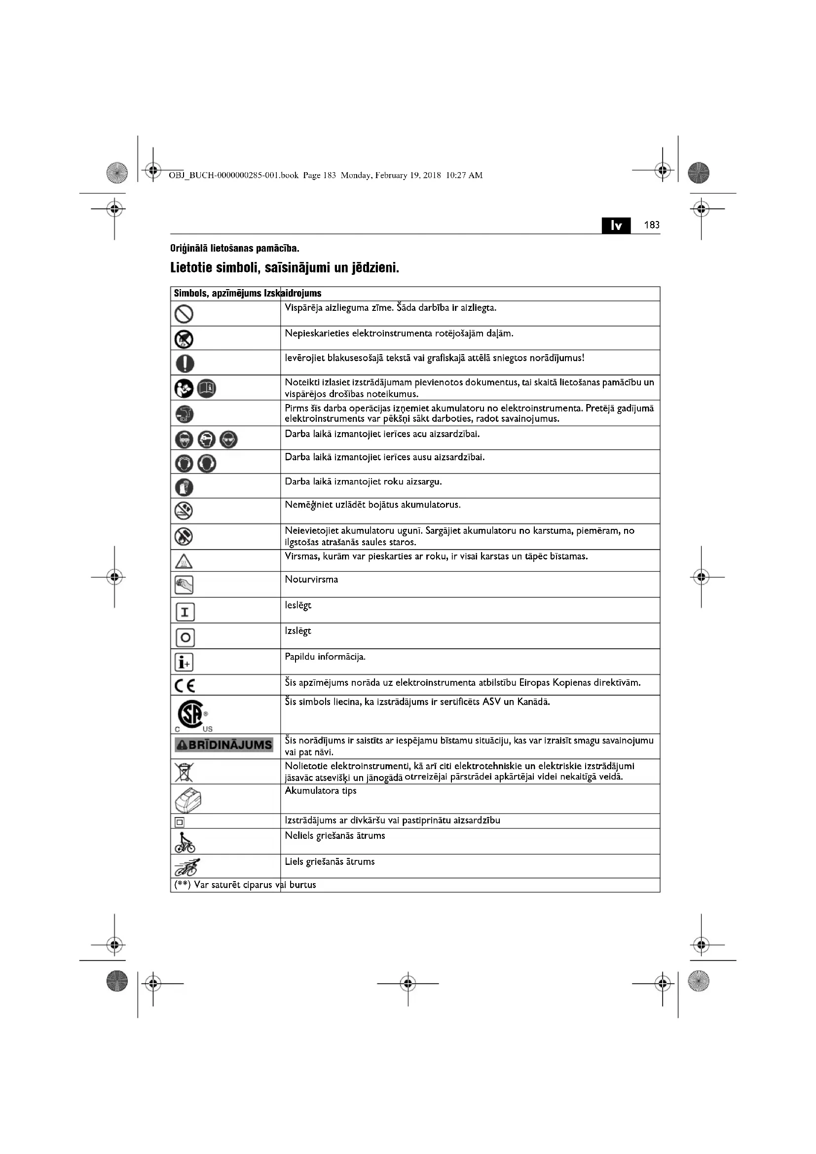 Oriģinālā lietošanas pamācība. Lietotie simboli, saīsinājumi un jēdzieni. Simbols, apzīmējums Izskaidrojums Vispārēja aizlieguma zīme. Šāda darbība ir aizliegta. Nepieskarieties elektroinstrumenta rotējošajām daļām. Ievērojiet blakusesošajā tekstā vai grafiskajā attēlā sniegtos norādījumus! Noteikti izlasiet izstrādājumam pievienotos dokumentus, tai skaitā lietošanas pamācību un vispārējos drošības noteikumus. Pirms šīs darba operācijas izņemiet akumulatoru no elektroinstrumenta. Pretējā gadījumā elektroinstruments var pēkšņi sākt darboties, radot savainojumus. Darba laikā izmantojiet ierīces acu aizsardzībai. Darba laikā izmantojiet ierīces ausu aizsardzībai. Darba laikā izmantojiet roku aizsargu. Nemēģ iniet uzlādēt bojātus akumulatorus. Neievietojiet akumulatoru ugunī. Sargājiet akumulatoru no karstuma, piemēram, no ilgstošas atrašanās saules staros. Virsmas, kurām var pieskarties ar roku, ir visai karstas un tāpēc bīstamas. Noturvirsma Ieslēgt Izslēgt Papildu informācija. Šis apzīmējums norāda uz elektroinstrumenta atbilstību Eiropas Kopienas direktīvām. Šis simbols liecina, ka izstrādājums ir sertificēts ASV un Kanādā. Šis norādījums ir saistīts ar iespējamu bīstamu situāciju, kas var izraisīt smagu savainojumu vai pat nāvi. Nolietotie elektroinstrumenti, kā arī citi elektrotehniskie un elektriskie izstrādājumi jāsavāc atsevišķi un jānogādā otrreizējai pārstrādei apkārtējai videi nekaitīgā veidā. Akumulatora tips Izstrādājums ar divkāršu vai pastiprinātu aizsardzību Neliels griešanās ātrums Liels griešanās ātrums (**) Var saturēt ciparus vai burtus OBJ_BUCH-0000000285-001.book Page 183 Monday, February 19, 2018 10:27 AM184