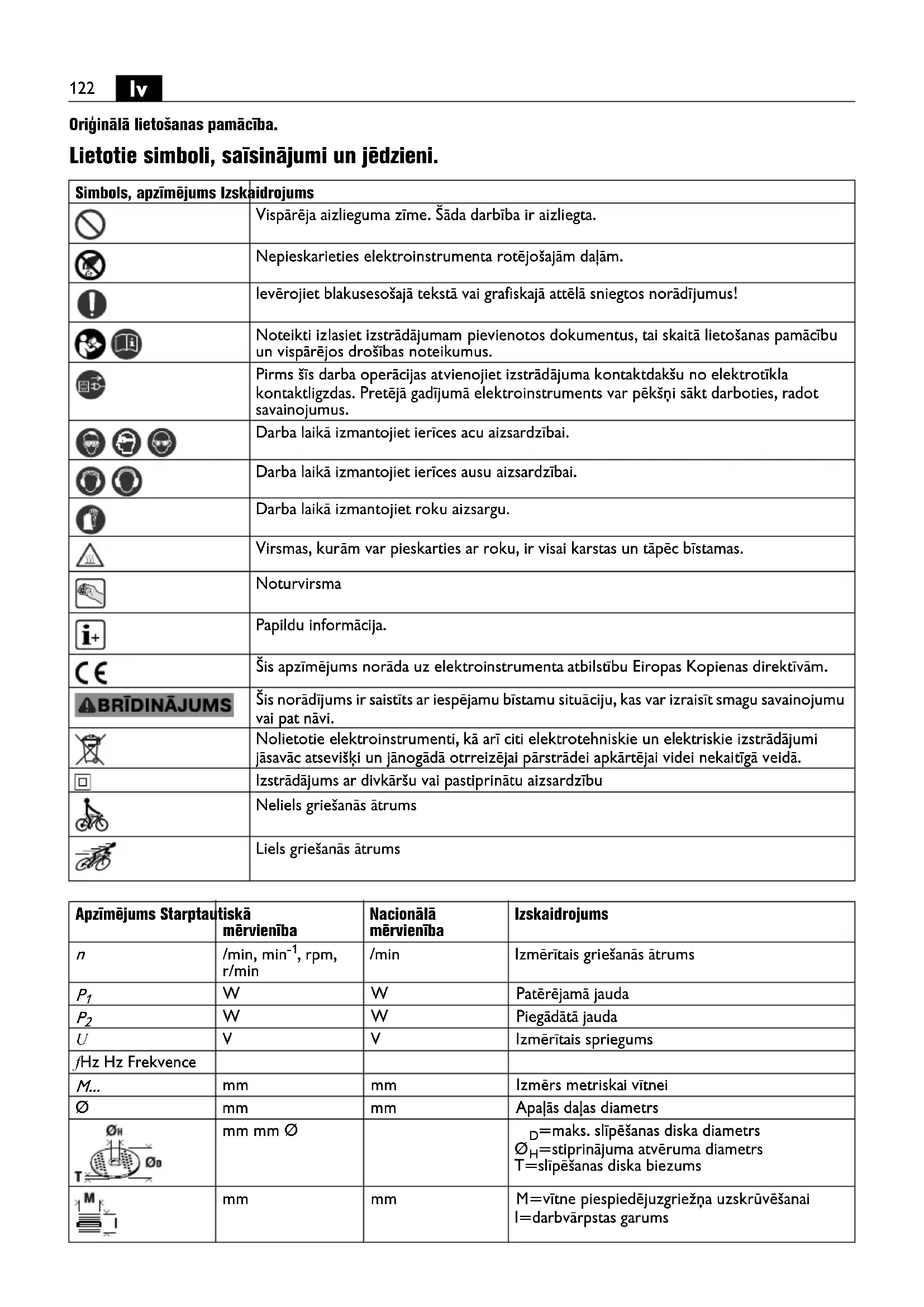 Oriģinālā lietošanas pamācība. Lietotie simboli, saīsinājumi un jēdzieni. Simbols, apzīmējums Izskaidrojums Vispārēja aizlieguma zīme. Šāda darbība ir aizliegta. Nepieskarieties elektroinstrumenta rotējošajām daļām. Ievērojiet blakusesošajā tekstā vai grafiskajā attēlā sniegtos norā dījumus! Noteikti izlasiet izstrādājumam pievienotos dokumentus, tai skaitā lietošanas pamācību un vispārējos drošības noteikumus. Pirms šīs darba operācijas atvienojiet izstrādājuma kontaktdakšu no elektrotīkla kontaktligzdas. Pretējā gadījumā elektroinstruments var pēkšņi sākt darboties, radot savainojumus. Darba laikā izmantojiet ierīces acu aizsardzībai. Darba laikā izmantojiet ierīces ausu aizsardzībai. Darba laikā izmantojiet roku aizsargu. Virsmas, kur ām var pieskarties ar roku, ir visai karstas un tāpēc bīstamas. Noturvirsma Papildu informācija. Šis apzīmējums norāda uz elektroinstrumenta atbilstību Eiropas Kopienas direktīvām. Šis norādījums ir saistīts ar iespējamu bīstamu situāciju, kas var izraisīt smagu savainojumu vai pat nāvi. Nolietotie elektroinstrumenti, kā arī citi elektrotehniskie un elektriskie izstrādājumi jāsavāc atsevišķi un jānogādā otrreizējai pārstrādei apkārtējai videi nekaitīgā veidā. Izstrādājums ar divkāršu vai pastiprinātu aizsardzību Neliels griešanās ātrums Liels griešanās ā trums Apzīmējums Starptautiskā mērvienība Nacionālā mērvienība Izskaidrojums