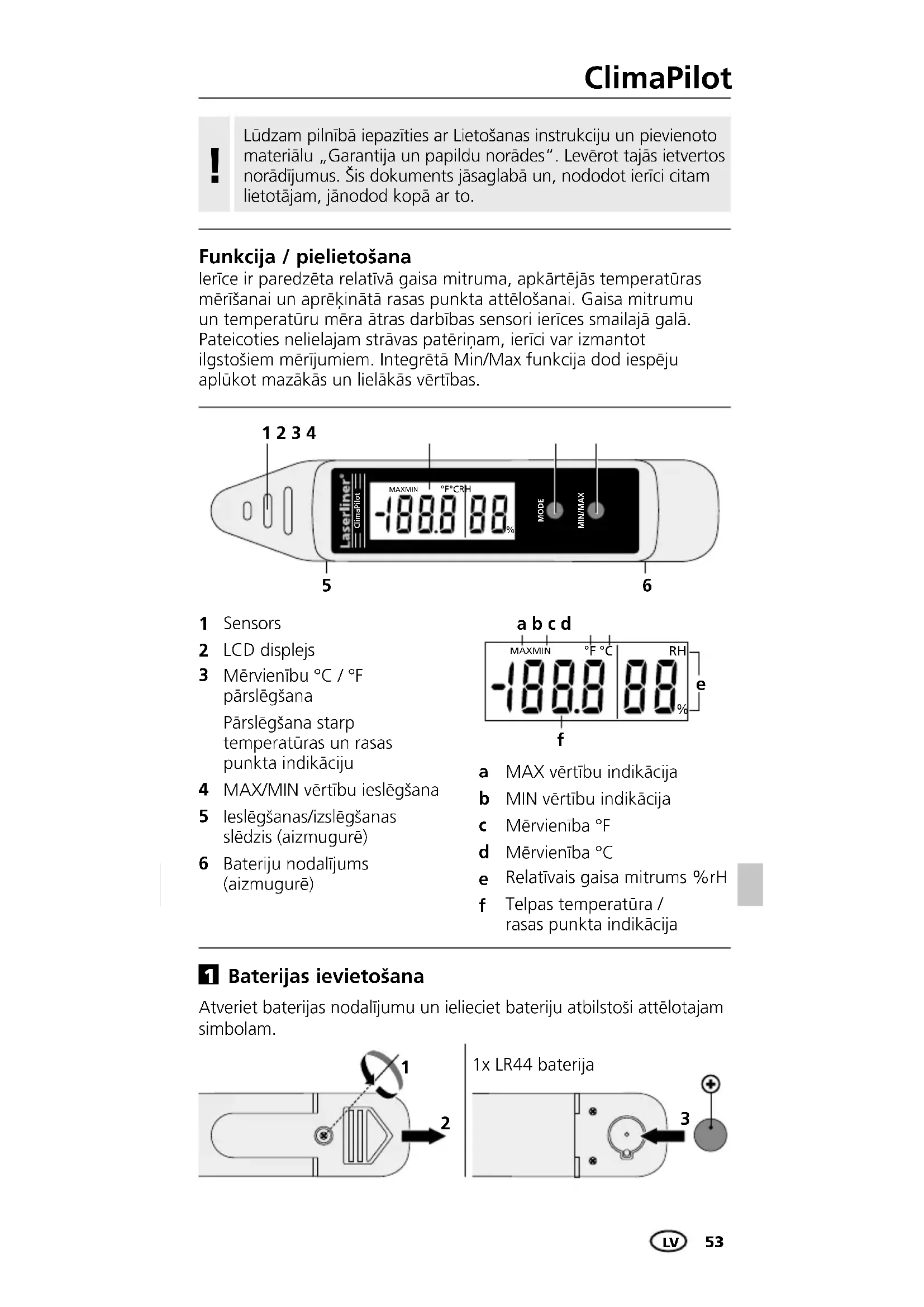 Baterijas ievietošana Atveriet baterijas nodalījumu un ielieciet bateriju atbilstoši attēlotajam simbolam. 1x LR44 baterija54