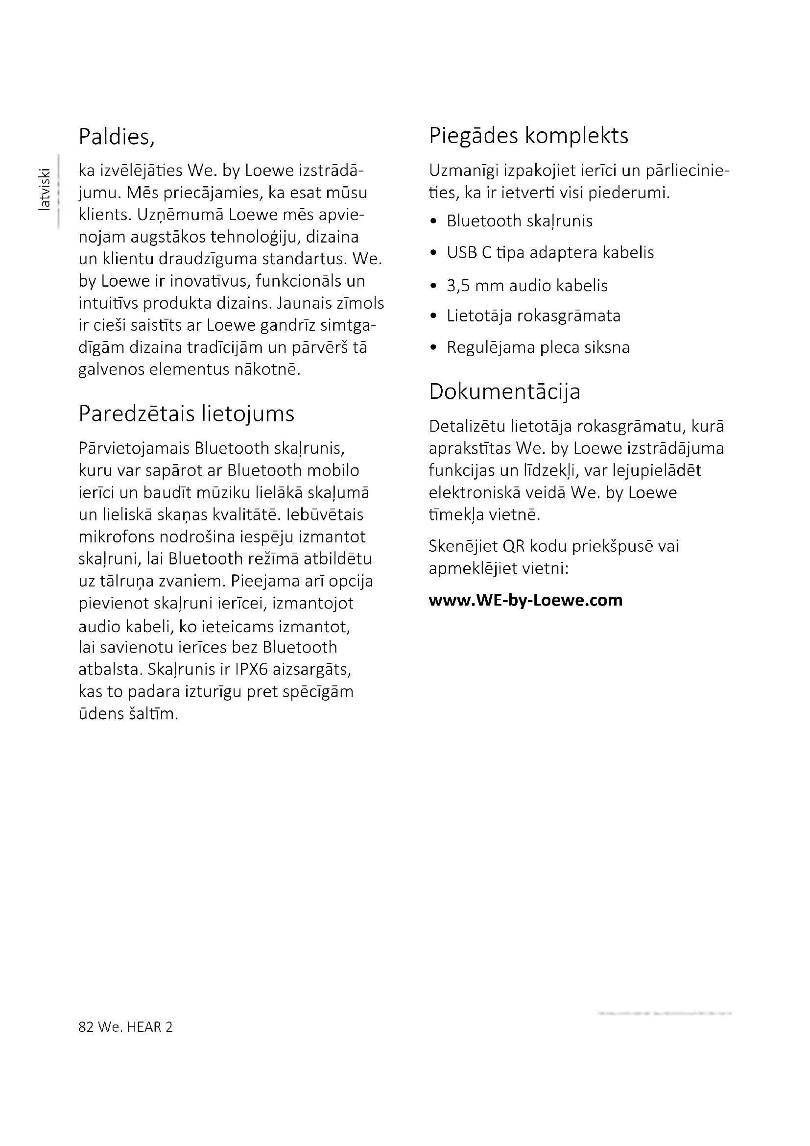- Regulējama pleca siksna Dokumentācija Detalizētu lietotāja rokasgrāmatu, kurā aprakstas We. by Loewe izstrādājuma funkcijas un līdzekļi, var lejupielādēt elektroniskā veidā We. by Loewe mekļa vietnē. Skenējiet QR kodu priekšpusē vai apmeklējiet vietni: www.WE-by-Loewe.comWe. HEAR 2 83 latviski 1 Svarīgi drošības norādījumi Uzmanību! Rūpīgi izlasiet šo lapu, lai garantētu, ka ierīce ek lietota droši. Simbolu skaidrojums Šis simbols norāda augstspriegu- ma radītos riskus. Šis simbols brīdina lietotāju par ciem speciskākiem riskiem. Šis simbols norāda aizdegšanās briesmas. 1.1. Karstums Neuzstādiet ierīci blakus karstām virsmām, piemēram, radiatoriem, sildītājiem ar venlatoru, cepeškrāsnīm un citām ierīcēm (ietverot pasprinātājus), kuras var uzkarst. Nekad nenovietojiet uz ierīces izstrādājumus ar atklātu liesmu, piemēram, sveces un lukturus. Lai samazinātu aizdegšanās risku, lietošanas laikā neklājiet uz ierīces avīzes, galdautu, aizkarus u. 1.2. Vide Nelietojiet to putekļainā, mitrā, nerā vidē un vidē ar augstu temperatūru. 1.3. Pērkona negaiss Pērkona negaisa laikā ierīce ir jāatvieno no uzlādes ierīces (USB lādētāja). 1.4. Akumulatora apkalpe Ja ilgu laiku neizmantojat izstrā- dājumu, nodrošiniet, ka vismaz reizi mēnesī tā ek uzlādēta, lai uzturētu tās veiktspēju.