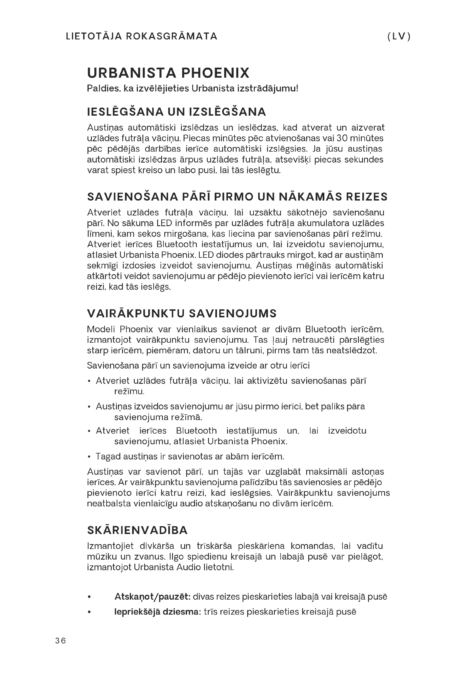(LV) URBANISTA PHOENIX Paldies, ka izvēlējieties Urbanista izstrādājumu! IESLĒGŠANA UN IZSLĒGŠANA Austiņas automātiski izslēdzas un ieslēdzas, kad atverat un aizverat uzlādes futrāļa vāciņu. Piecas minūtes pēc atvienošanas vai 30 minūtes pēc pēdējās darbības ierīce automātiski izslēgsies. Ja jūsu austiņas automātiski izslēdzas ārpus uzlādes futrāļa, atsevišķi piecas sekundes varat spiest kreiso un labo pusi, lai tās ieslēgtu. SAVIENOŠANA PĀRĪ PIRMO UN NĀKAMĀS REIZES Atveriet uzlādes futrāļa vāciņu, lai uzsāktu sākotnējo savienošanu pārī. No sākuma LED informēs par uzlādes futrāļa akumulatora uzlādes līmeni, kam sekos mirgošana, kas liecina par savienošanas pārī režīmu. Atveriet ierīces Bluetooth iestatījumus un, lai izveidotu savienojumu, atlasiet Urbanista Phoenix. LED diodes pārtrauks mirgot, kad ar austiņām sekmīgi izdosies izveidot savienojumu. Austiņas mēģinās automātiski atkārtoti veidot savienojumu ar pēdējo pievienoto ierīci vai ierīcēm katru reizi, kad tās ieslēgs.