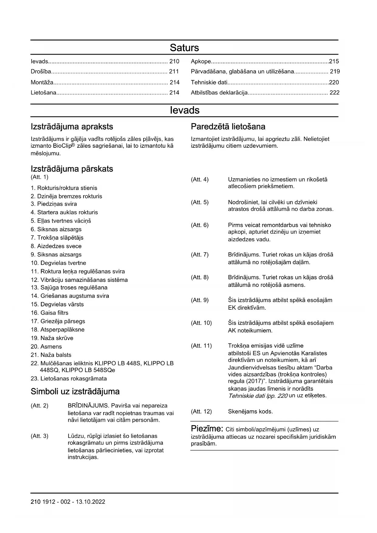 (standarta novirze). 1912 - 002 - 13.10.2022 221Atbilstības deklarācija ESatbilstības deklarācija Mēs, Husqvarna AB, SE-56182 Huskvarna, Zviedrija, tālr. +46-36-146500, ar pilnu atbildību apliecinām, ka šis izstrādājums: Apraksts Zāles pļaujmašīna Zīmols Husqvarna Tips/modelis KLIPPO LB 448S, KLIPPO LB 453S, KLIPPO LB 448SQ, KLIPPO LB 453SQ, KLIPPO LB 548SQe Identifikācija Ar sērijas numuriem no 2022 un turpmākiem sērijas numuriem pilnībā atbilst šādām ES direktīvām un noteikumiem: Direktīva/regula Apraksts 2006/42/EK “par iekārtām” 2014/30/ES par elektromagnētisko savietojamību 2000/14/EK “par trokšņa emisiju vidē” 2011/65/ES “par dažu bīstamu vielu izmantošanas ierobežošanu elektriskās un elektroniskās iekārtās” un ir ievēroti zemāk norādītie saskaņotie standarti un/vai tehniskie dati: EN ISO 5395-1:2013/A1:2018, EN ISO