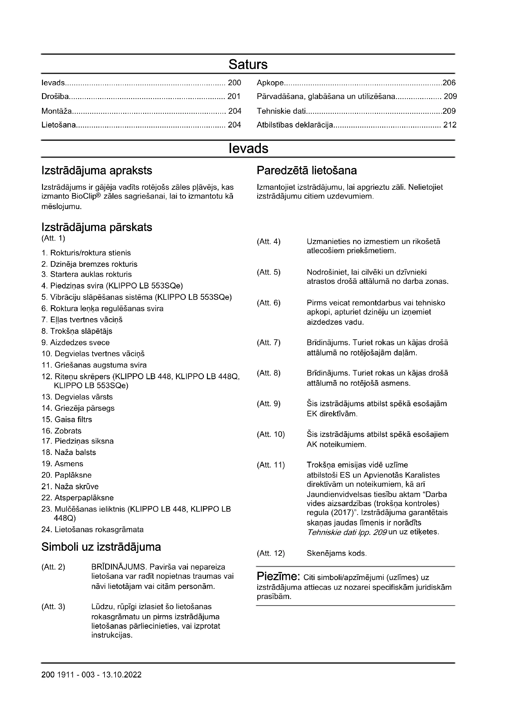 442Q KLIPPO LB448 KLIPPO LB 448Q KLIPPO LB 553SQe Braukšana Ātrums, km/h - - - 4,8 1911 - 003 - 13.10.2022 211Atbilstības deklarācija ESatbilstības deklarācija Mēs, Husqvarna AB, SE-56182 Huskvarna, Zviedrija, tālr. +46-36-146500, ar pilnu atbildību apliecinām, ka šis izstrādājums: Apraksts Zāles pļaujmašīna Zīmols Husqvarna Tips/modelis KLIPPO LB 448, KLIPPO LB 442Q, KLIPPO LB 448Q, KLIPPO LB 553SQe Identifikācija Ar sērijas numuriem no 2022 un turpmākiem sērijas numuriem pilnībā atbilst šādām ES direktīvām un noteikumiem: Direktīva/regula Apraksts 2006/42/EK “par iekārtām” 2014/30/ES par elektromagnētisko savietojamību 2000/14/EK “par trokšņa emisiju vidē” 2011/65/ES “par dažu bīstamu vielu izmantošanas ierobežošanu elektriskās un elektroniskās iekārtās” un ir ievēroti zemāk norādītie saskaņotie standarti un/vai tehniskie dati: EN ISO 5395-1:2013/A1:2018, EN ISO