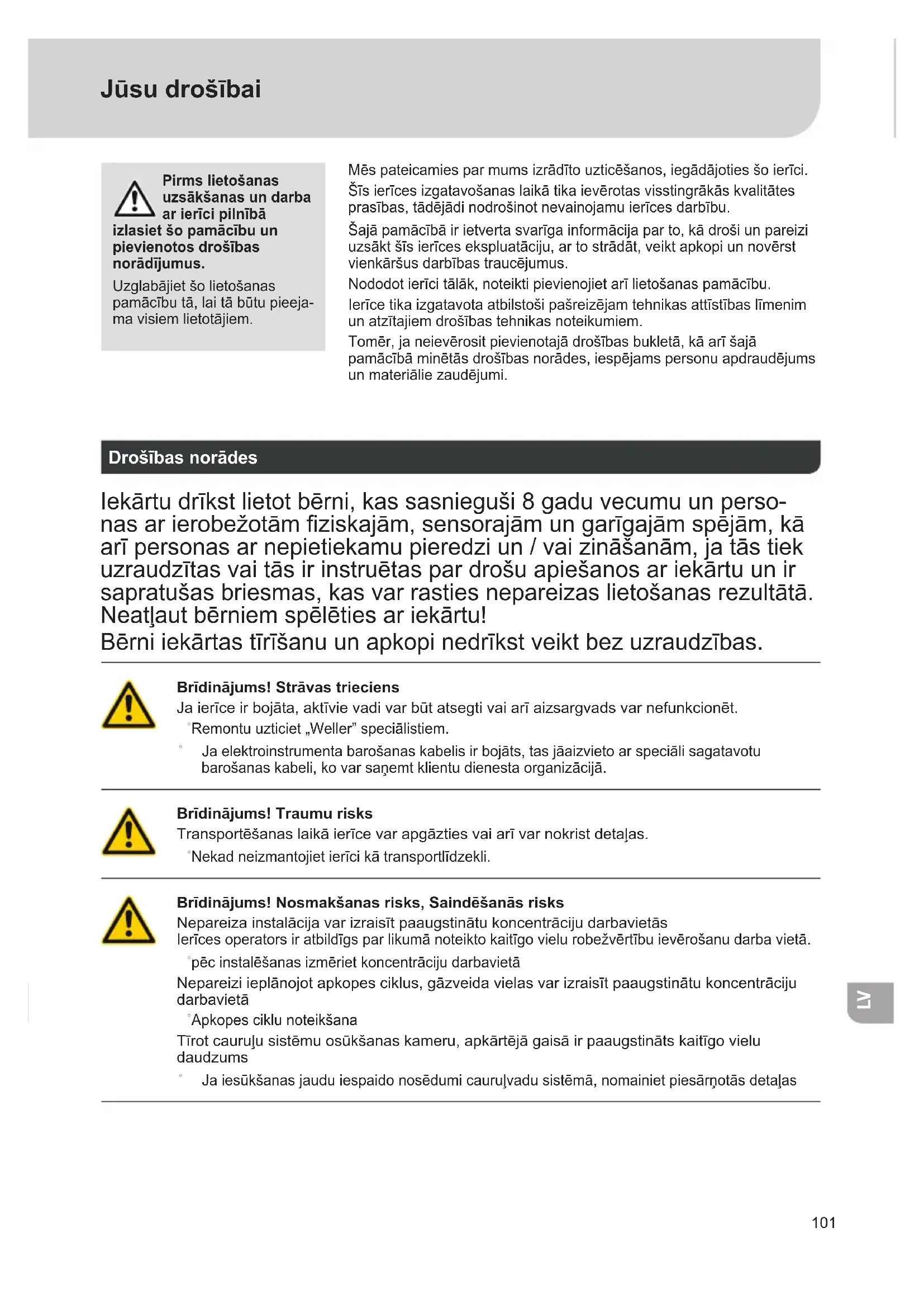 Jūsu drošībai Pirms lietošanas uzsākšanas un darba ar ierīci pilnībā izlasiet šo pamācību un pievienotos drošības norādījumus. Uzglabājietšolietošanas pamācībutā,laitābūtupieeja- mavisiemlietotājiem. Mēspateicamiesparmumsizrādītouzticēšanos,iegādājotiesšoierīci. Šīsierīcesizgatavošanaslaikātikaievērotasvisstingrākāskvalitātes prasības,tādējādinodrošinotnevainojamuierīcesdarbību. Šajāpamācībāirietvertasvarīgainformācijaparto,kādrošiunpareizi uzsāktšīsierīcesekspluatāciju,artostrādāt,veiktapkopiunnovērst vienkāršusdarbībastraucējumus. Nododotierīcitālāk,noteiktipievienojietarīlietošanaspamācību. Ierīcetikaizgatavotaatbilstošipašreizējamtehnikasattīstībaslīmenim unatzītajiemdrošībastehnikasnoteikumiem. Tomēr,janeievērositpievienotajādrošībasbukletā,kāarīšajā pamācībāminētāsdrošībasnorādes,iespējamspersonuapdraudējums unmateriāliezaudējumi. Drošības norādes Iekārtudrīkstlietotbērni,kassasnieguši8gaduvecumuunperso- nasarierobežotāmziskajām,sensorajāmungarīgajāmspējām,kā arīpersonasarnepietiekamupieredziun/vaizināšanām,jatāstiek uzraudzītasvaitāsirinstruētaspardrošuapiešanosariekārtuunir sapratušasbriesmas,kasvarrastiesnepareizaslietošanasrezultātā. Neatļautbērniemspēlētiesariekārtu! Bērniiekārtastīrīšanuunapkopinedrīkstveiktbezuzraudzības. Brīdinājums! Strāvas trieciens Jaierīceirbojāta,aktīvievadivarbūtatsegtivaiarīaizsargvadsvarnefunkcionēt. ˚ Remontuuzticiet„Weller”speciālistiem. ˚ Jaelektroinstrumentabarošanaskabelisirbojāts,tasjāaizvietoarspeciālisagatavotu barošanaskabeli,kovarsaņemtklientudienestaorganizācijā. Brīdinājums! Traumu risks Transportēšanaslaikāierīcevarapgāztiesvaiarīvarnokristdetaļas. ˚ Nekadneizmantojietierīcikātransportlīdzekli. Brīdinājums! Nosmakšanas risks, Saindēšanās risks Nepareizainstalācijavarizraisītpaaugstinātukoncentrācijudarbavietās Ierīcesoperatorsiratbildīgsparlikumānoteiktokaitīgovielurobežvērtībuievērošanudarbavietā. ˚ pēcinstalēšanasizmērietkoncentrācijudarbavietā Nepareiziieplānojotapkopesciklus,gāzveidavielasvarizraisītpaaugstinātukoncentrāciju darbavietā ˚ Apkopesciklunoteikšana Tīrotcauruļusistēmuosūkšanaskameru,apkārtējāgaisāirpaaugstinātskaitīgovielu daudzums ˚ Jaiesūkšanasjauduiespaidonosēdumicauruļvadusistēmā,nomainietpiesārņotāsdetaļas102