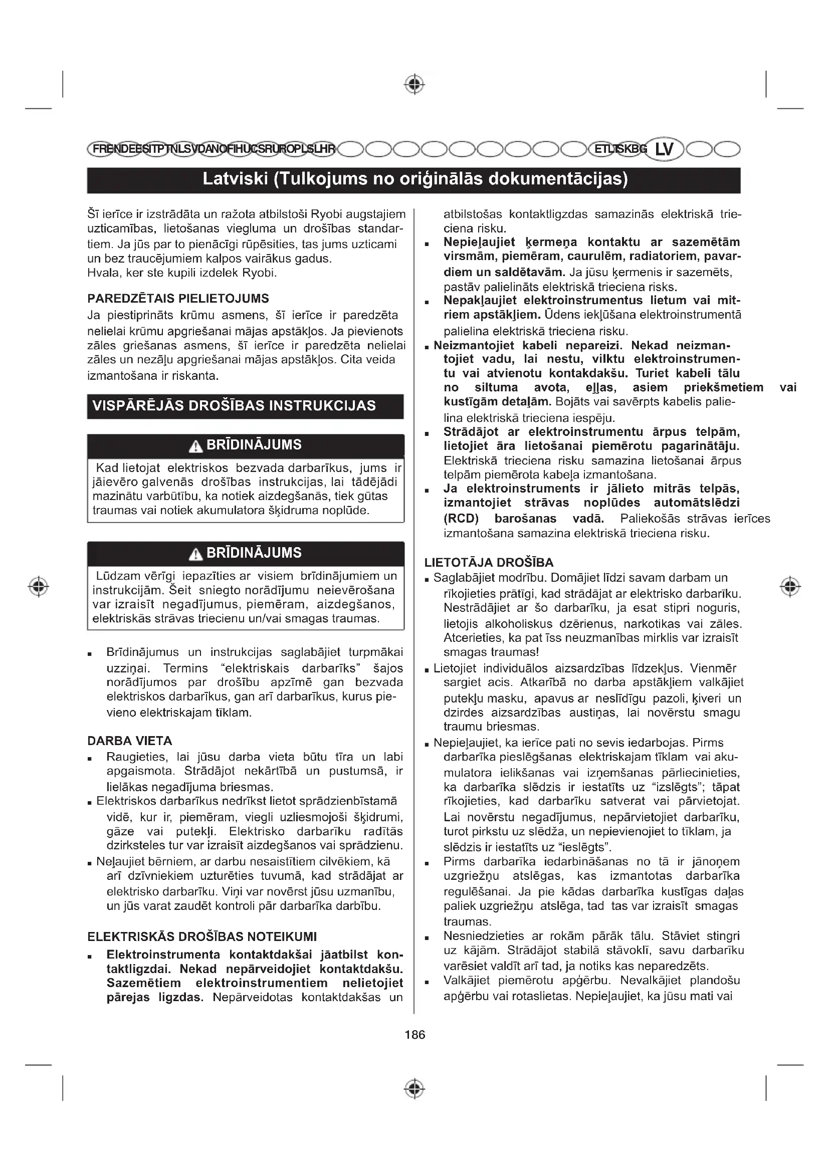 ET LT SK BG Šī ierīce ir izstrādāta un ražota atbilstoši Ryobi augstajiem uzticamības, lietošanas viegluma un drošības standar- tiem. Ja jūs par to pienācīgi rūpēsities, tas jums uzticami un bez traucējumiem kalpos vairākus gadus. Hvala, ker ste kupili izdelek Ryobi. 3$5('=Ɯ7$,63,(/,(72-806 Ja piestiprināts krūmu asmens, šī ierīce ir paredzēta nelielai krūmu apgriešanai mājas apstākļos. Ja pievienots zāles griešanas asmens, šī ierīce ir paredzēta nelielai zāles un nezāļu apgriešanai mājas apstākļos. Cita veida izmantošana ir riskanta. 9,63Ɩ5Ɯ-Ɩ6'52âƮ%$6,16758.&,-$6 %5Ʈ',1Ɩ-806 Kad lietojat elektriskos bezvada darbarīkus, jums ir jāievēro galvenās drošības instrukcijas, lai tādējādi mazinātu varbūtību, ka notiek aizdegšanās, tiek gūtas traumas vai notiek akumulatora šķidruma noplūde. %5Ʈ',1Ɩ-806 Lūdzam vērīgi iepazīties ar visiem brīdinājumiem un instrukcijām. Šeit sniegto norādījumu neievērošana var izraisīt negadījumus, piemēram, aizdegšanos, elektriskās strāvas triecienu un/vai smagas traumas. ■ Brīdinājumus un instrukcijas saglabājiet turpmākai uzziņai. Termins “elektriskais darbarīks” šajos norādījumos par drošību apzīmē gan bezvada elektriskos darbarīkus, gan arī darbarīkus, kurus pie- vieno elektriskajam tīklam. DARBA VIETA ■ Raugieties, lai jūsu darba vieta būtu tīra un labi apgaismota. Strādājot nekārtībā un pustumsā, ir lielākas negadījuma briesmas. ■ Elektriskos darbarīkus nedrīkst lietot sprādzienbīstamā vidē, kur ir, piemēram, viegli uzliesmojoši šķidrumi, gāze vai putekļi. Elektrisko darbarīku radītās dzirksteles tur var izraisīt aizdegšanos vai sprādzienu. ■ Neļaujiet bērniem, ar darbu nesaistītiem cilvēkiem, kā arī dzīvniekiem uzturēties tuvumā, kad strādājat ar elektrisko darbarīku. Viņi var novērst jūsu uzmanību, un jūs varat zaudēt kontroli pār darbarīka darbību. (/(.75,6.Ɩ6'52âƮ%$6127(,.80, ■ (OHNWURLQVWUXPHQWD NRQWDNWGDNãDL MƗDWELOVW NRQ- WDNWOLJ]GDL 1HNDG QHSƗUYHLGRMLHW NRQWDNWGDNãX