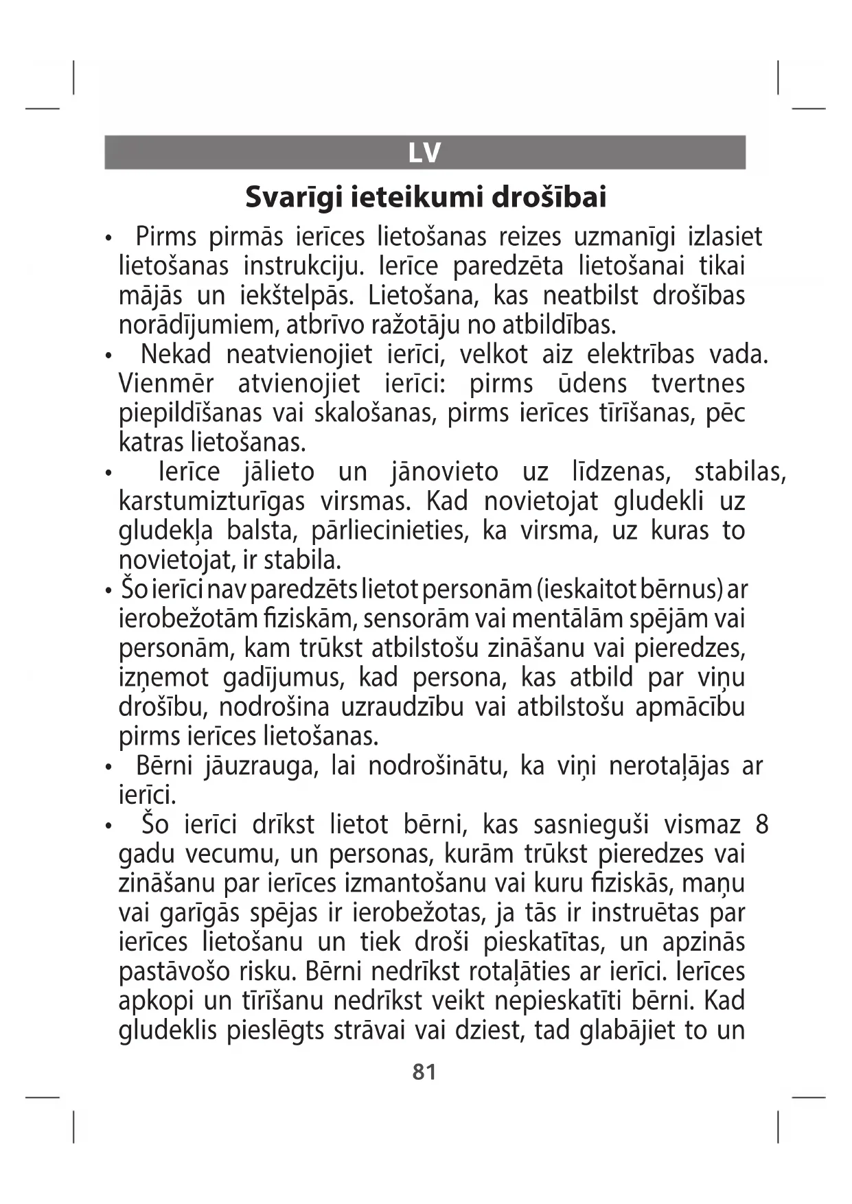 - Šo ierīci drīkst lietot bērni, kas sasnieguši vismaz 8 gadu vecumu, un personas, kurām trūkst pieredzes vai zināšanu par ierīces izmantošanu vai kuru ziskās, maņu vai garīgās spējas ir ierobežotas, ja tās ir instruētas par ierīces lietošanu un tiek droši pieskatītas, un apzinās pastāvošo risku. Bērni nedrīkst rotaļāties ar ierīci. Ierīces apkopi un tīrīšanu nedrīkst veikt nepieskatīti bērni. Kad gludeklis pieslēgts strāvai vai dziest, tad glabājiet to un 81tā vadus bērniem, kas jaunāki par 8 gadiem, nepieejamā vietā.