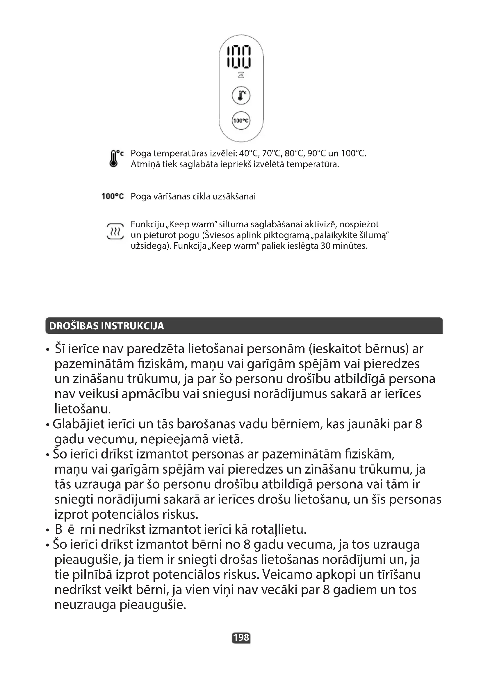 Poga temperatūras izvēlei: 40°C, 70°C, 80°C, 90°C un 100°C. Atmiņā tiek saglabāta iepriekš izvēlētā temperatūra. Poga vārīšanas cikla uzsākšanai Funkciju „Keep warm” siltuma saglabāšanai aktivizē, nospiežot un pieturot pogu (Šviesos aplink piktogramą „palaikykite šilumą” užsidega). Funkcija „Keep warm” paliek ieslēgta 30 minūtes.199
