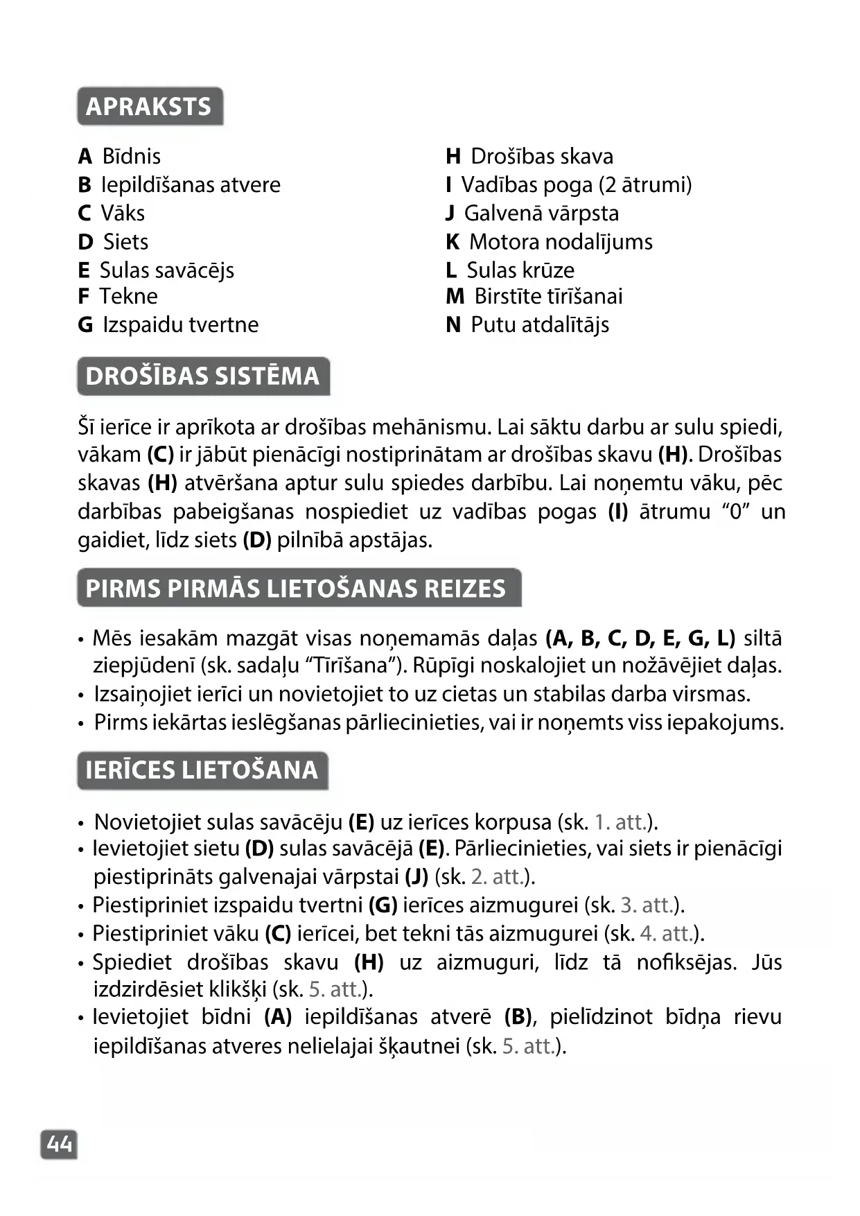A Bīdnis B Iepildīšanas atvere C Vāks D Siets E Sulas savācējs F Tekne G Izspaidu tvertne H Drošības skava I Vadības poga (2ātrumi) J Galvenā vārpsta K Motora nodalījums L Sulas krūze M Birstīte tīrīšanai N Putu atdalītājs Šī ierīce ir aprīkota ar drošības mehānismu. Lai sāktu darbu ar sulu spiedi, vākam (C) ir jābūt pienācīgi nostiprinātam ar drošības skavu (H). Drošības skavas (H) atvēršana aptur sulu spiedes darbību. Lai noņemtu vāku, pēc darbības pabeigšanas nospiediet uz vadības pogas (I) ātrumu “0” un gaidiet, līdz siets (D) pilnībā apstājas.