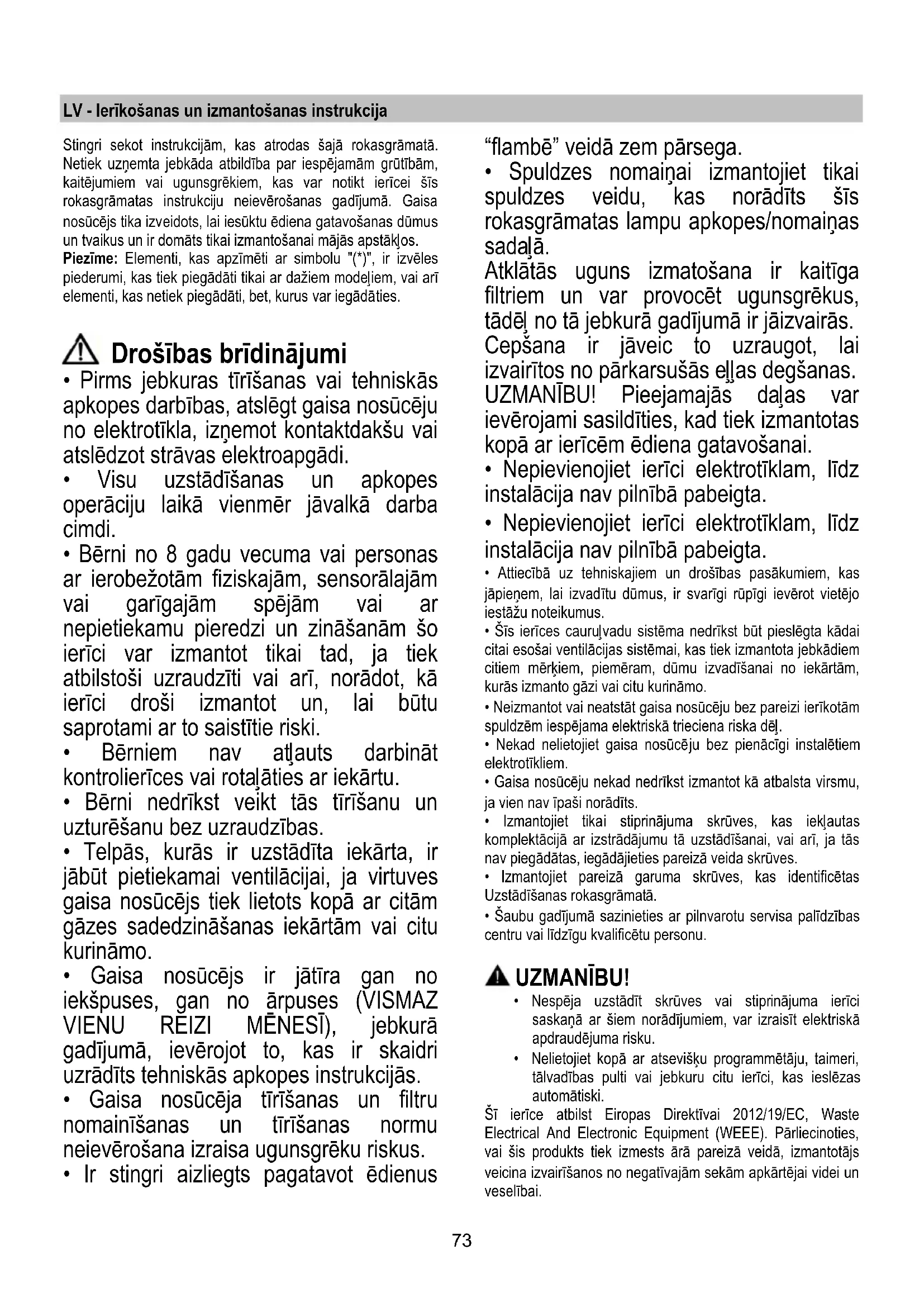 - Spuldzes nomaiņai izmantojiet tikai spuldzes veidu, kas norādīts šīs rokasgrāmatas lampu apkopes/nomaiņas sadaļā. Atklātās uguns izmatošana ir kaitīga filtriem un var provocēt ugunsgrēkus, tādēļ no tā jebkurā gadījumā ir jāizvairās. Cepšana ir jāveic to uzraugot, lai izvairītos no pārkarsušās eļļas degšanas. UZMANĪBU! Pieejamajās daļas var ievērojami sasildīties, kad tiek izmantotas kopā ar ierīcēm ēdiena gatavošanai.
