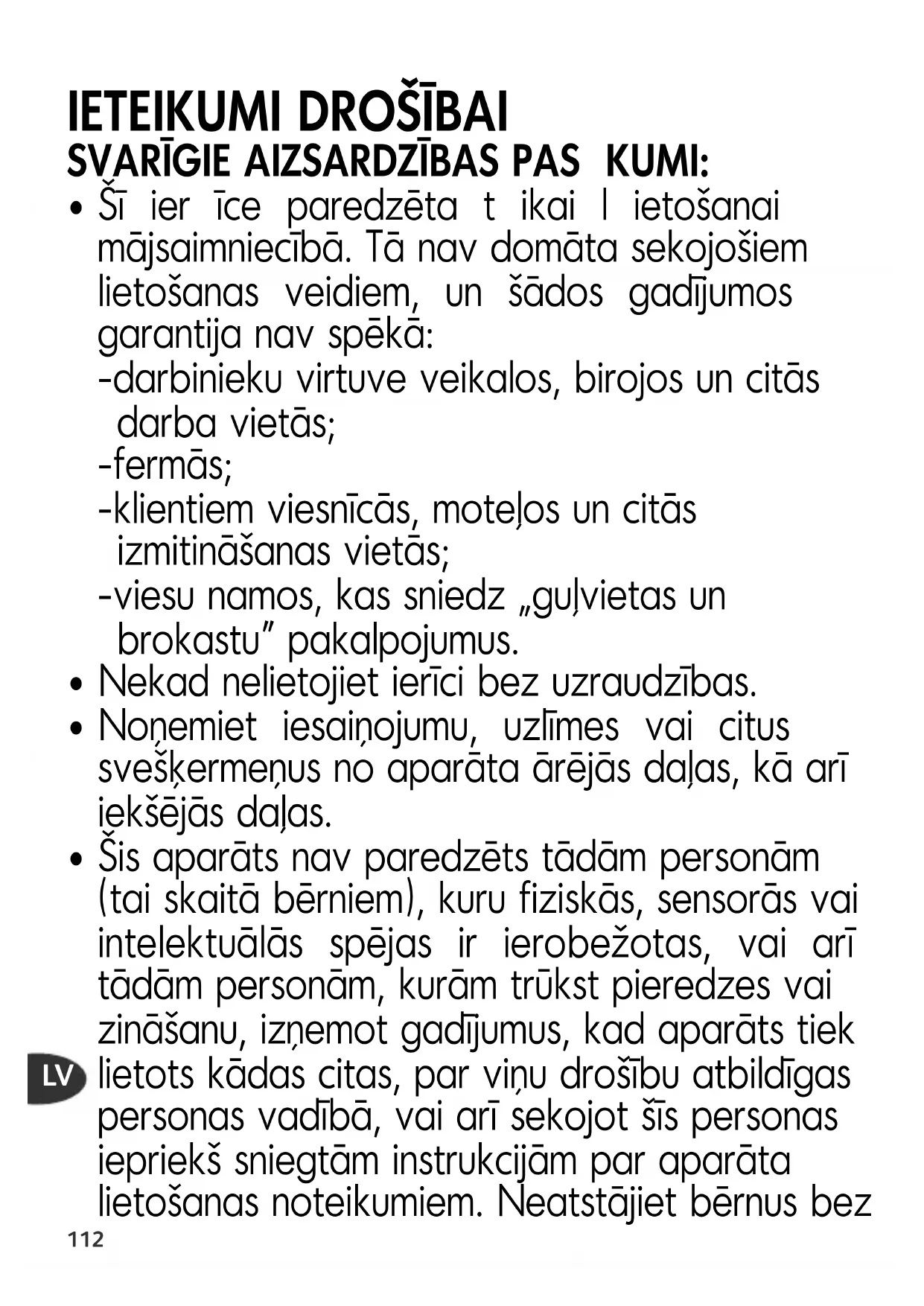 - Šī ier īce paredzēta t ikai l ietošanai mājsaimniecībā. Tā nav domāta sekojošiem lietošanas veidiem, un šādos gadījumos garantija nav spēkā: -darbinieku virtuve veikalos, birojos un citās darba vietās; -fermās; -klientiem viesnīcās, moteļos un citās izmitināšanas vietās; -viesu namos, kas sniedz „guļvietas un brokastu” pakalpojumus.