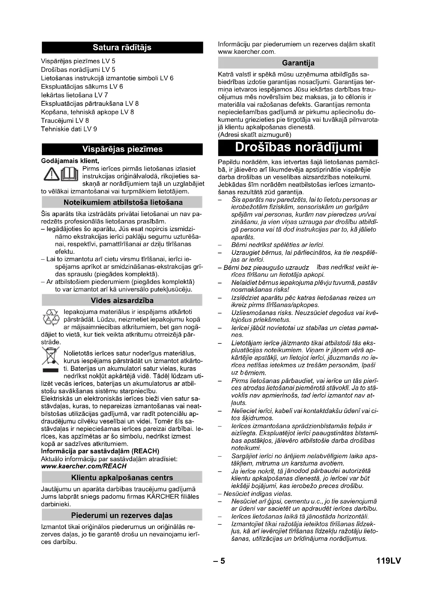 Võrgukaitse (inertne) 10 A Mahuti maht 18 l Veepaagi maht, maks. 4 l Võimsus P nimi 1200 W Võimsus P maks 1400 W Võrgukaabel H05-VV-F2x0,75 Helirõhupeel (EN 60704-2-1) 74 dB(A) 118 ET– 5 Godājamais klient, Pirms ierīces pirmās lietošanas izlasiet instrukcijas oriģinālvalodā, rīkojieties sa- skaņā ar norādījumiem tajā un uzglabājiet to vēlākai izmantošanai vai turpmākiem lietotājiem. Šis aparāts tika izstrādāts privātai lietošanai un nav pa- redzēts profesionālās lietošanas prasībām. – Iegādājoties šo aparātu, Jūs esat nopircis izsmidzi- nāmo ekstrakcijas ierīci paklāju segumu uzturēša- nai, respektīvi, pamattīrīšanai ar dziļu tīrīšanas efektu. – Lai to izmantotu arī cietu virsmu tīrīšanai, ierīci ie- spējams aprīkot ar smidzināšanas-ekstrakcijas grī- das sprauslu (piegādes komplektā). – Ar atbilstošiem piederumiem (piegādes komplektā) to var izmantot arī kā universālo putekļusūcēju. Iepakojuma materiālus ir iespējams atkārtoti pārstrādāt. Lūdzu, neizmetiet iepakojumu kopā ar mājsaimniecības atkritumiem, bet gan nogā- dājiet to vietā, kur tiek veikta atkritumu otrreizējā pār- strāde. Nolietotās ierīces satur noderīgus materiālus, kurus iespējams pārstrādāt un izmantot atkārto- ti. Baterijas un akumulatori satur vielas, kuras nedrīkst nokļūt apkārtējā vidē. Tādēļ lūdzam uti- lizēt vecās ierīces, baterijas un akumulatorus ar atbil- stošu savākšanas sistēmu starpniecību. Elektriskās un elektroniskās ierīces bieži vien satur sa- stāvdaļas, kuras, to nepareizas izmantošanas vai neat- bilstošas utilizācijas gadījumā, var radīt potenciālu ap- draudējumu cilvēku veselībai un videi. Tomēr šīs sa- stāvdaļas ir nepieciešamas ierīces pareizai darbībai. Ie- rīces, kas apzīmētas ar šo simbolu, nedrīkst izmest kopā ar sadzīves atkritumiem. Informācija par sastāvdaļām (REACH) Aktuālo informāciju par sastāvdaļām atradīsiet: www.kaercher.com/REACH Jautājumu un aparāta darbības traucējumu gadījumā Jums labprāt sniegs padomu firmas KÄRCHER filiāles darbinieki. Izmantot tikai oriģinālos piederumus un oriģinālās re- zerves daļas, jo tie garantē drošu un nevainojamu ierī- ces darbību. Informāciju par piederumiem un rezerves daļām skatīt www.kaercher.com. Katrā valstī ir spēkā mūsu uzņēmuma atbildīgās sa- biedrības izdotie garantijas nosacījumi. Garantijas ter- miņa ietvaros iespējamos Jūsu iekārtas darbības trau- cējumus mēs novērsīsim bez maksas, ja to cēlonis ir materiāla vai ražošanas defekts. Garantijas remonta nepieciešamības gadījumā ar pirkumu apliecinošu do- kumentu griezieties pie tirgotāja vai tuvākajā pilnvarota- jā klientu apkalpošanas dienestā. (Adresi skatīt aizmugurē) Papildu norādēm, kas ietvertas šajā lietošanas pamācī- bā, ir jāievēro arī likumdevēja apstiprinātie vispārējie darba drošības un veselības aizsardzības noteikumi. Jebkādas šīm norādēm neatbilstošas ierīces izmanto- šanas rezultātā zūd garantija. – Šis aparāts nav paredzēts, lai to lietotu personas ar ierobežotām fiziskām, sensoriskām un garīgām spējām vai personas, kurām nav pieredzes un/vai zināšanu, ja vien viņas uzrauga par drošību atbildī- gā persona vai tā dod instrukcijas par to, kā jālieto aparāts. – Bērni nedrīkst spēlēties ar ierīci. – Uzraugiet bērnus, lai pārliecinātos, ka tie nespēlē- jas ar ierīci. – Bērni bez pieaugušo uzraudz ības nedrīkst veikt ie- rīces tīrīšanu un lietotāja apkopi. – Nelaidiet bērnus iepakojuma plēvju tuvumā, pastāv nosmakšanas risks! – Izslēdziet aparātu pēc katras lietošanas reizes un ikreiz pirms tīrīšanas/apkopes. – Uzliesmošanas risks. Neuzsūciet degošus vai kvē- lojošus priekšmetus. – Ierīcei jābūt novietotai uz stabilas un cietas pamat- nes. – Lietotājam ierīce jāizmanto tikai atbilstoši tās eks- pluatācijas noteikumiem. Viņam ir jāņem vērā ap- kārtējie apstākļi, un lietojot ierīci, jāuzmanās no ie- rīces netīšas ietekmes uz trešām personām, īpaši uz b ērniem. – Pirms lietošanas pārbaudiet, vai ierīce un tās pierī- ces atrodas lietošanai piemērotā stāvoklī. Ja to stā- voklis nav apmierinošs, tad ierīci izmantot nav at- ļauts. – Nelieciet ierīci, kabeli vai kontaktdakšu ūdenī vai ci- tos šķidrumos. – Ierīces izmantošana sprādzienbīstamās telpās ir aizliegta. Ekspluatējot ierīci paaugstinātas bīstamī- bas apstākļos, jāievēro atbilstošie darba drošības noteikumi. – Sargājiet ierīci no ārējiem nelabvēlīgiem laika aps- tākļiem, mitruma un karstuma avotiem. – Ja ierīce nokrīt, tā j ānodod pārbaudei autorizētā klientu apkalpošanas dienestā, jo ierīcei var būt iekšēji bojājumi, kas ierobežo preces drošību. – Nesūciet indīgas vielas. – Nesūciet arī ģipsi, cementu u.c., jo tie savienojumā ar ūdeni var sacietēt un apdraudēt ierīces darbību. – Ierīces lietošanas laikā tā jānostāda horizontāli. – Izmantojiet tikai ražotāja ieteiktos tīrīšanas līdzek- ļus, kā arī ievērojiet tīrīšanas līdzekļu ražotāju lieto- šanas, utilizācijas un brīdinājuma norādījumus. Satura rādītājs Vispārējas piezīmes LV 5 Drošības norādījumi LV 5 Lietošanas instrukcijā izmantotie simboli LV 6 Ekspluatācijas sākums LV 6 Iekārtas lietošana LV 7 Ekspluatācijas pārtraukšana LV 8 Kopšana, tehniskā apkope LV 8 Traucējumi LV 8 Tehniskie dati LV 9 Vispārējas piezīmes Noteikumiem atbilstoša lietošana Vides aizsardzība Klientu apkalpošanas centrs Piederumi un rezerves daļas Garantija Drošības norādījumi 119LV– 6 몇 BĪSTAMI – Ierīci atļauts pieslēgt tikai saskaņā ar noteikumiem sazemētām kontaktligzdām. – Aparātu pieslēdziet tikai maiņstrāvai. Spriegumam jāatbilst uz aparāta rūpnīcas plāksnītes norād