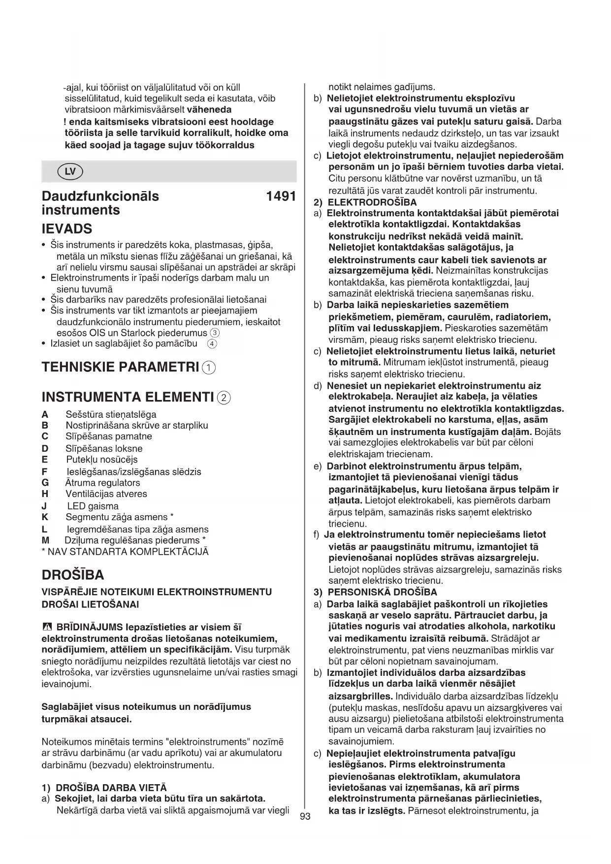 - LED-märgutuli J süttib lüliti F aktiveerimisel automaatselt93 notikt nelaimes gadījums. b) Nelietojiet elektroinstrumentu eksplozīvu vai ugunsnedrošu vielu tuvumā un vietās ar paaugstinātu gāzes vai putekļu saturu gaisā. Darba laikā instruments nedaudz dzirksteļo, un tas var izsaukt viegli degošu putekļu vai tvaiku aizdegšanos. c) Lietojot elektroinstrumentu, neļaujiet nepiederošām personām un jo īpaši bērniem tuvoties darba vietai. Citu personu klātbūtne var novērst uzmanību, un tā rezultātā jūs varat zaudēt kontroli pār instrumentu.