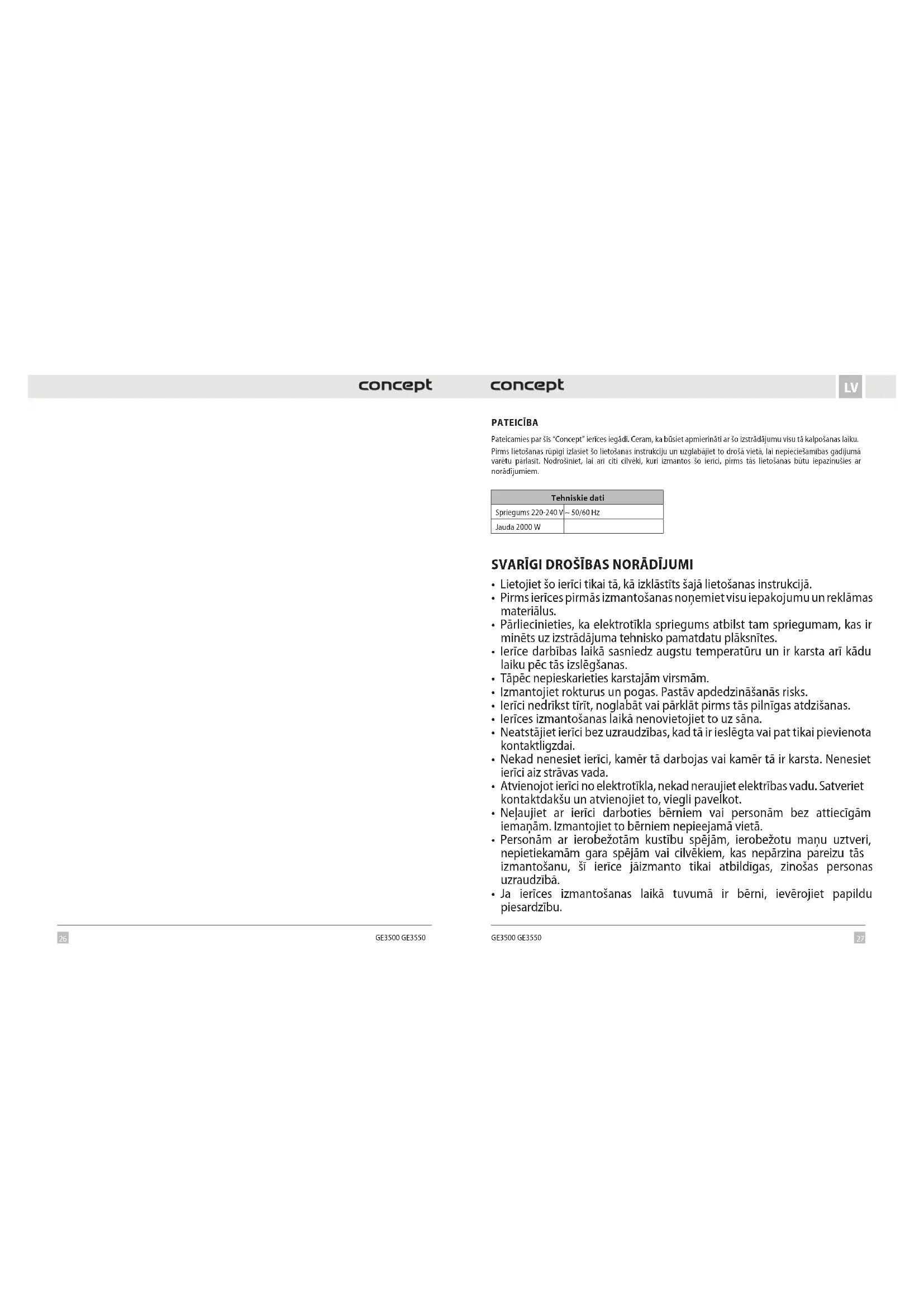 GE3500 GE3550 PATEICĪBA Pateicamies par šīs “Concept” ierīces iegādi. Ceram, ka būsiet apmierināti ar šo izstrādājumu visu tā kalpošanas laiku. Pirms lietošanas rūpīgi izlasiet šo lietošanas instrukciju un uzglabājiet to drošā vietā, lai nepieciešamības gadījumā varētu pārlasīt. Nodrošiniet, lai arī citi cilvēki, kuri izmantos šo ierīci, pirms tās lietošanas būtu iepazinušies ar norādījumiem. Tehniskie dati Spriegums 220-240 V ~ 50/60Hz Jauda 2000 W SVARĪGI DROŠĪBAS NORĀDĪJUMI