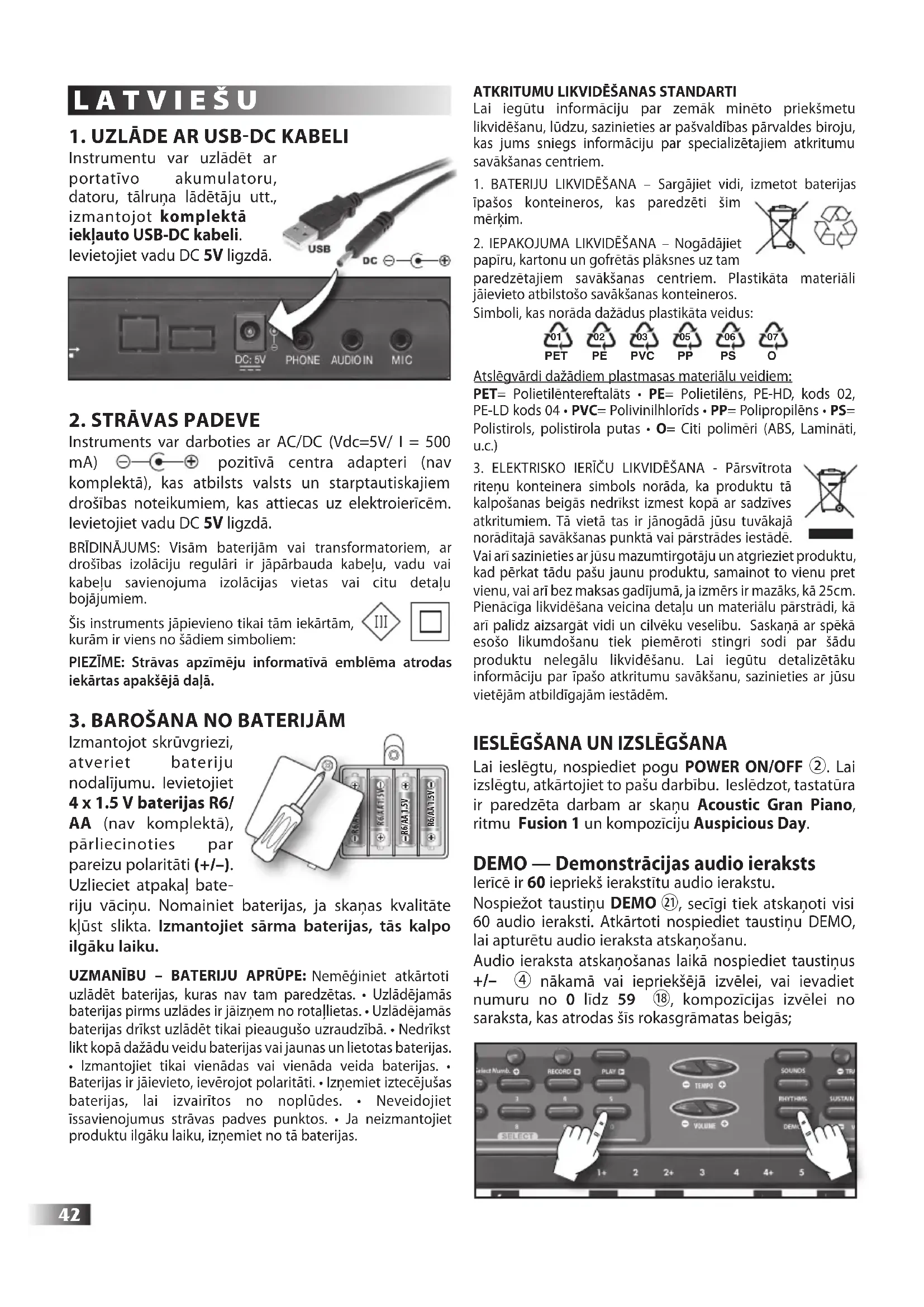 riju vāciņu. Nomainiet baterijas, ja skaņas kvalitāte kļūst slikta. Izmantojiet sārma baterijas, tās kalpo ilgāku laiku. UZMANĪBU – BATERIJU APRŪPE: Nemēģiniet atkārtoti uzlādēt baterijas, kuras nav tam paredzētas. • Uzlādējamās baterijas pirms uzlādes ir jāizņem no rotaļlietas. • Uzlādējamās baterijas drīkst uzlādēt tikai pieaugušo uzraudzībā. • Nedrīkst likt kopā dažādu veidu baterijas vai jaunas un lietotas baterijas. • Izmantojiet tikai vienādas vai vienāda veida baterijas. • Baterijas ir jāievieto, ievērojot polaritāti. • Izņemiet iztecējušas baterijas, lai izvairītos no noplūdes. • Neveidojiet īssavienojumus strāvas padves punktos. • Ja neizmantojiet produktu ilgāku laiku, izņemiet no tā baterijas.ATKRITUMU LIKVIDĒŠANAS STANDARTILai iegūtu informāciju par zemāk minēto priekšmetu likvidēšanu, lūdzu, sazinieties ar pašvaldības pārvaldes biroju, kas jums sniegs informāciju par specializētajiem atkritumu savākšanas centriem.1. BATERIJU LIKVIDĒŠANA – Sargājiet vidi, izmetot baterijas īpašos konteineros, kas paredzēti šim mērķim.2. IEPAKOJUMA LIKVIDĒŠANA – Nogādājiet papīru, kartonu un gofrētās plāksnes uz tam paredzētajiem savākšanas centriem. Plastikāta materiāli jāievieto atbilstošo savākšanas konteineros.Simboli, kas norāda dažādus plastikāta veidus:Atslēgvārdi dažādiem plastmasas materiālu veidiem: PET= Polietilēntereftalāts • PE= Polietilēns, PE-HD, kods 02, PE-LD kods 04 • PVC= Polivinilhlorīds • PP= Polipropilēns • PS= Polistirols, polistirola putas • O= Citi polimēri (ABS, Lamināti, u.c.)3. ELEKTRISKO IERĪČU LIKVIDĒŠANA - Pārsvītrota riteņu konteinera simbols norāda, ka produktu tā kalpošanas beigās nedrīkst izmest kopā ar sadzīves atkritumiem. Tā vietā tas ir jānogādā jūsu tuvākajā norādītajā savākšanas punktā vai pārstrādes iestādē. Vai arī sazinieties ar jūsu mazumtirgotāju un atgrieziet produktu, kad pērkat tādu pašu jaunu produktu, samainot to vienu pret vienu, vai arī bez maksas gadījumā, ja izmērs ir mazāks, kā 25cm. Pienācīga likvidēšana veicina detaļu un materiālu pārstrādi, kā arī palīdz aizsargāt vidi un cilvēku veselību. Saskaņā ar spēkā esošo likumdošanu tiek piemēroti stingri sodi par šādu produktu nelegālu likvidēšanu. Lai iegūtu detalizētāku informāciju par īpašo atkritumu savākšanu, sazinieties ar jūsu vietējām atbildīgajām iestādēm. IESLĒGŠANA UN IZSLĒGŠANA Lai ieslēgtu, nospiediet pogu POWER ON/OFF ②. Lai izslēgtu, atkārtojiet to pašu darbību. Ieslēdzot, tastatūra ir paredzēta darbam ar skaņu Acoustic Gran Piano, ritmu Fusion 1 un kompozīciju Auspicious Day. DEMO — Demonstrācijas audio ieraksts Ierīcē ir 60 iepriekš ierakstītu audio ierakstu. Nospiežot taustiņu DEMO ㉑, secīgi tiek atskaņoti visi 60 audio ieraksti. Atkārtoti nospiediet taustiņu DEMO, lai apturētu audio ieraksta atskaņošanu. Audio ieraksta atskaņošanas laikā nospiediet taustiņus