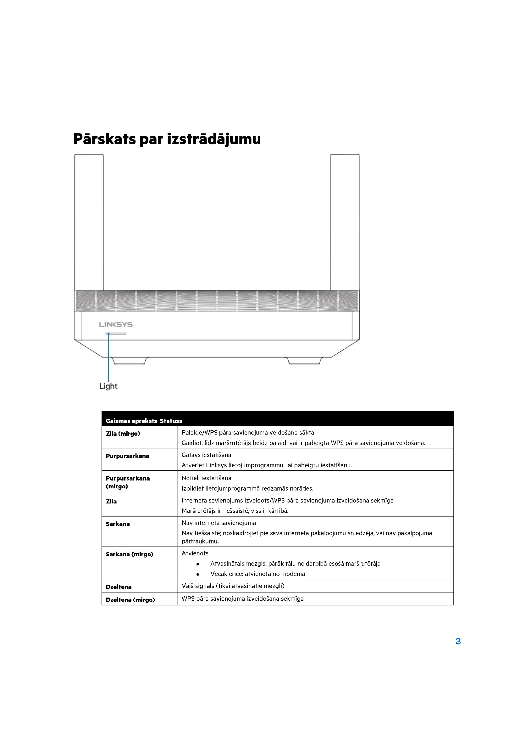 Gaismas apraksts Statuss Zila (mirgo) Palaide/WPS pāra savienojuma veidošana sākta Gaidiet, līdz maršrutētājs beidz palaidi vai ir pabeigta WPS pāra savienojuma veidošana. Purpursarkana Gatavs iestatīšanai Atveriet Linksys lietojumprogrammu, lai pabeigtu iestatīšanu. Purpursarkana (mirgo) Notiek iestatīšana Izpildiet lietojumprogrammā redzamās norādes. Zila Interneta savienojums izveidots/WPS pāra savienojuma izveidošana sekmīga Maršrutētājs ir tiešsaistē, viss ir kārtībā. Sarkana Nav interneta savienojuma Nav tiešsaistē; noskaidrojiet pie sava interneta pakalpojumu sniedzēja, vai nav pakalpojuma pārtraukumu. Sarkana (mirgo) Atvienots