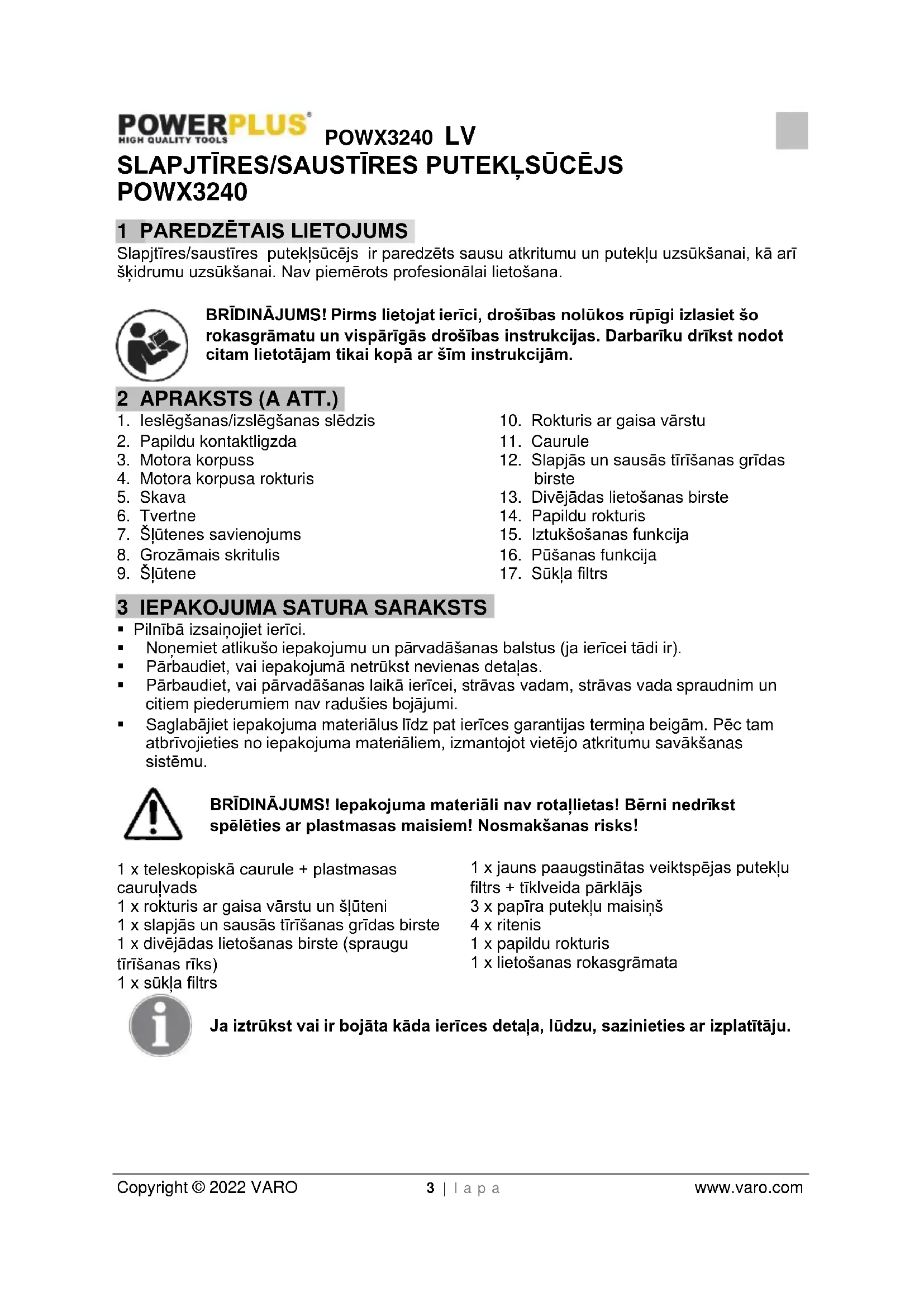- Saglabājiet iepakojuma materiālus līdz pat ierīces garantijas termiņa beigām. Pēc tam atbrīvojieties no iepakojuma materiāliem, izmantojot vietējo atkritumu savākšanas sistēmu. BRĪDINĀJUMS! Iepakojuma materiāli nav rotaļlietas! Bērni nedrīkst spēlēties ar plastmasas maisiem! Nosmakšanas risks! 1 x teleskopiskā caurule + plastmasas cauruļvads 1 x rokturis ar gaisa vārstu un šļūteni 1 x slapjās un sausās tīrīšanas grīdas birste 1 x divējādas lietošanas birste (spraugu tīrīšanas rīks) 1 x sūkļa filtrs 1 x jauns paaugstinātas veiktspējas putekļu filtrs + tīklveida pārklājs 3 x papīra putekļu maisiņš 4 x ritenis 1 x papildu rokturis 1 x lietošanas rokasgrāmata Ja iztrūkst vai ir bojāta kāda ierīces detaļa, lūdzu, sazinieties ar izplatītāju.POWX3240 LV Copyright © 2022 VARO 4 | l a p a www.varo.com