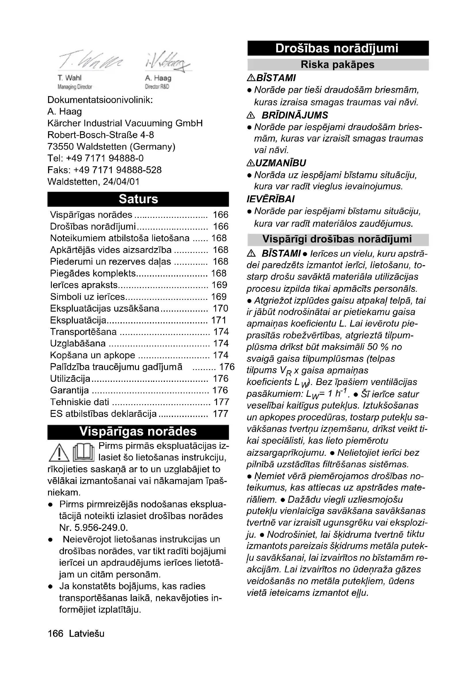 Kaabli pikkus m 10166 Latviešu Dokumentatsioonivolinik: A. Haag Kärcher Industrial Vacuuming GmbH Robert-Bosch-Straße 4-8 73550 Waldstetten (Germany) Tel: +49 7171 94888-0 Faks: +49 7171 94888-528 Waldstetten, 24/04/01 Saturs Vispārīgas norādes Pirms pirmās ekspluatācijas iz- lasiet šo lietošanas instrukciju, rīkojieties saskaņā ar to un uzglabājiet to vēlākai izmantošanai vai nākamajam īpaš- niekam. ● Pirms pirmreizējās nodošanas eksplua- tācijā noteikti izlasiet drošības norādes Nr. 5.956-249.0. ● Neievērojot lietošanas instrukcijas un drošības norādes, var tikt radīti bojājumi ierīcei un apdraudējums ierīces lietotā- jam un citām personām. ● Ja konstatēts bojājums, kas radies transportēšanas laikā, nekavējoties in- formējiet izplatītāju. Drošības norādījumi Riska pakāpes BĪSTAMI ● Norāde par tieši draudošām briesmām, kuras izraisa smagas traumas vai nāvi.