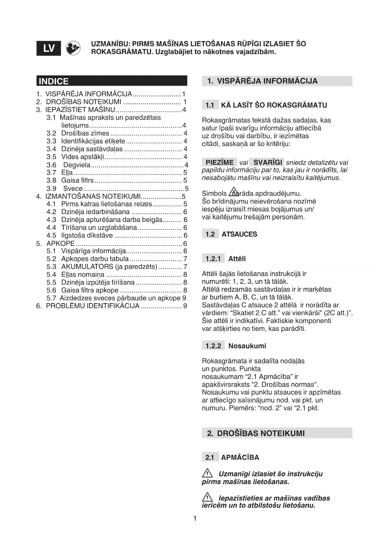 Uzmanīgi izlasiet šo instrukciju pirms mašīnas lietošanas. Iepazīstieties ar mašīnas vadības ierīcēm un to atbilstošu lietošanu. UZMANĪBU: PIRMS MAŠĪNAS LIETOŠANAS RŪPĪGI IZLASIET ŠO ROKASGRĀMATU. Uzglabājiet to nākotnes vajadzībām.