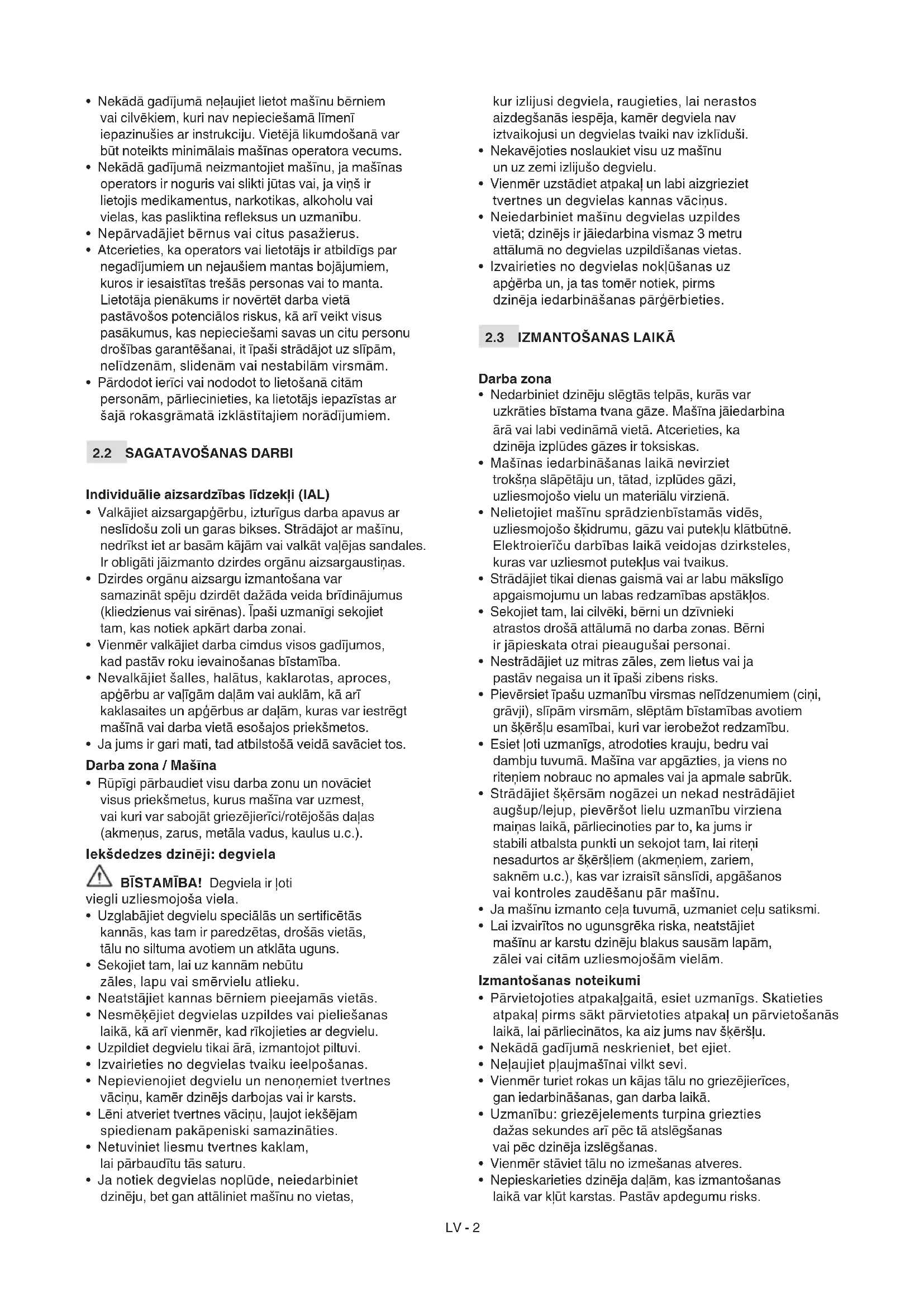 - Nekādā gadījumā neizmantojiet mašīnu, ja mašīnas operators ir noguris vai slikti jūtas vai, ja viņš ir lietojis medikamentus, narkotikas, alkoholu vai vielas, kas pasliktina reeksus un uzmanību.