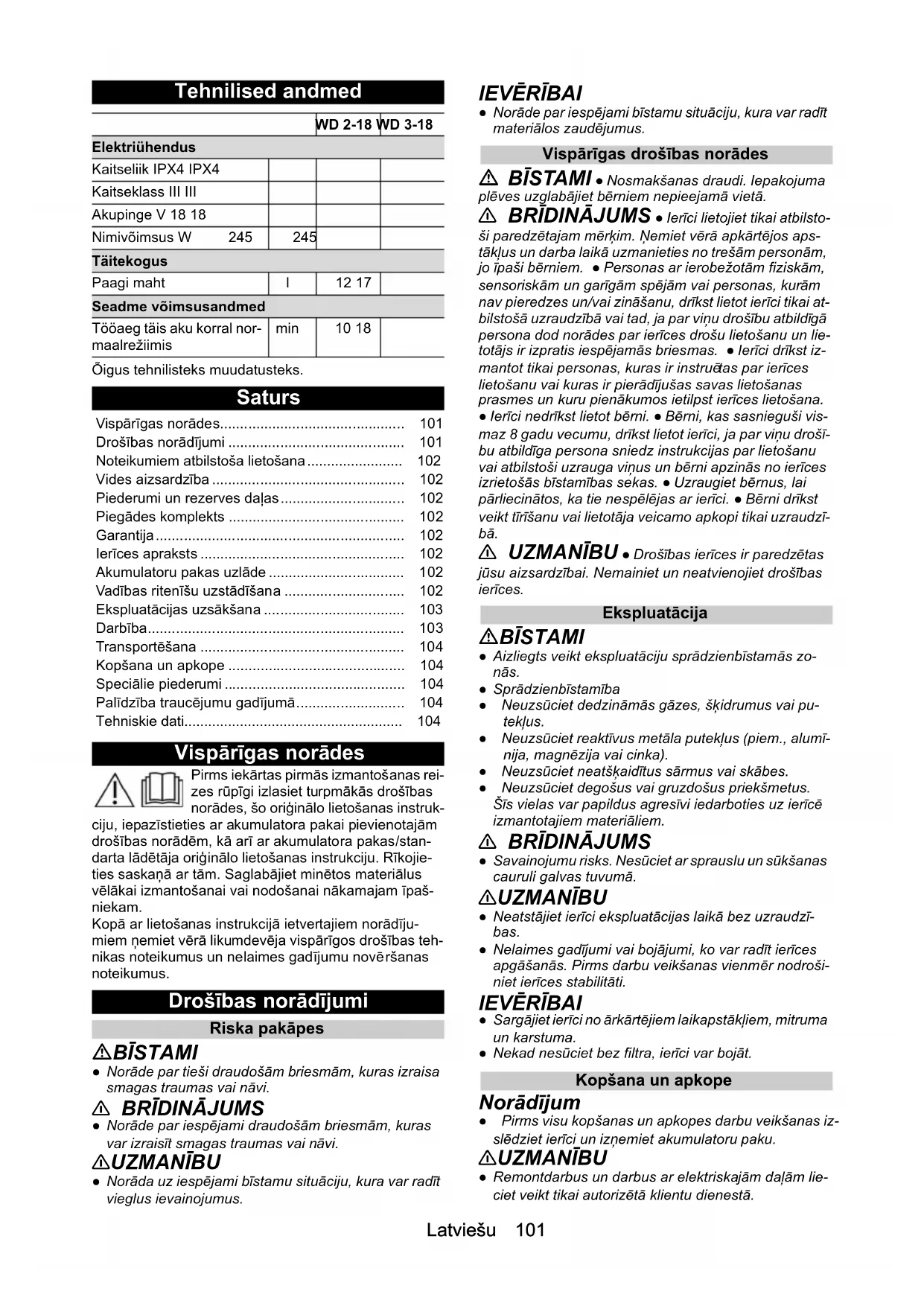 Seade lülitub automaatselt välja Seade / akupakk üle kuumenenud. Oodake, kuni seade / akupakk on maha jahtunud. Imivõimsus väheneb Tarvikud, imivoolik või imitorud on ummistunud. Eemaldage ummistus sobiliku abivahendiga. Filterkott on täis. Vahetage filterkott välja. Vahtfilter / padrunfilter on määrdunud. Puhastage vahtfiltrit / padrunfiltrit (vt peatükki Vaht- filtri / padrunfiltri puhastamine). Vahtfilter / padrunfilter on kahjustatud. Vahetage vahtfilter / padrunfilter välja.Latviešu 101 Tehnilised andmed Õigus tehnilisteks muudatusteks. Saturs Vispārīgas norādes Pirms iekārtas pirmās izmantošanas rei- zes rūpīgi izlasiet turpmākās drošības norādes, šo oriģinālo lietošanas instruk- ciju, iepazīstieties ar akumulatora pakai pievienotajām drošības norādēm, kā arī ar akumulatora pakas/stan- darta lādētāja oriģinālo lietošanas instrukciju. Rīkojie- ties saskaņā ar tām. Saglabājiet minētos materiālus vēlākai izmantošanai vai nodošanai nākamajam īpaš- niekam. Kopā ar lietošanas instrukcijā ietvertajiem norādīju- miem ņemiet vērā likumdevēja vispārīgos drošības teh- nikas noteikumus un nelaimes gadījumu novē ršanas noteikumus. Drošības norādījumi Riska pakāpes BĪSTAMI ● Norāde par tieši draudošām briesmām, kuras izraisa smagas traumas vai nāvi.