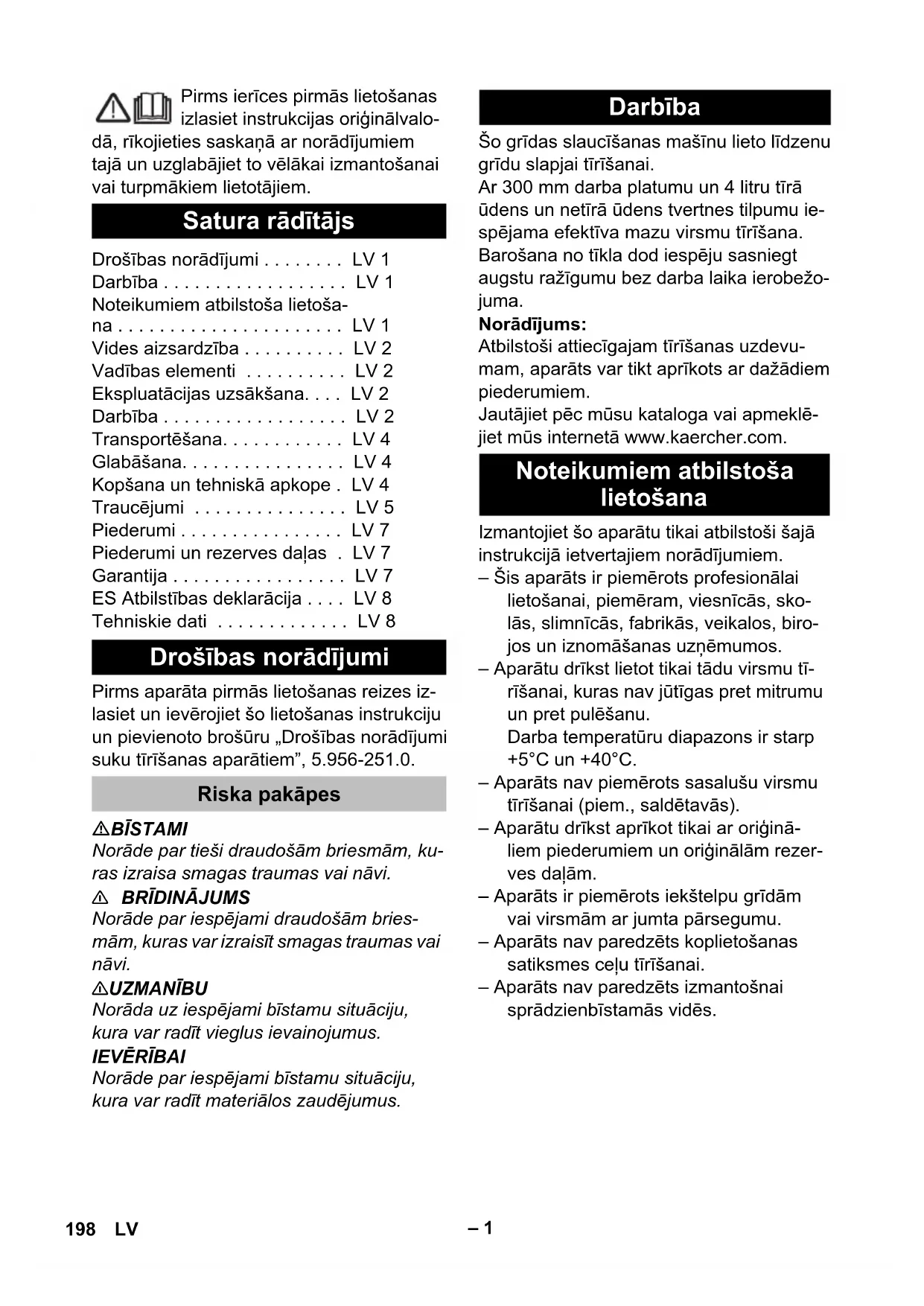 Norāde par iespējami bīstamu situāciju, kura var radīt materiālos zaudējumus. Šo grīdas slaucīšanas mašīnu lieto līdzenu grīdu slapjai tīrīšanai. Ar 300 mm darba platumu un 4 litru tīrā ūdens un netīrā ūdens tvertnes tilpumu ie- spējama efektīva mazu virsmu tīrīšana. Barošana no tīkla dod iespēju sasniegt augstu ražīgumu bez darba laika ierobežo- juma. Norādījums: Atbilstoši attiecīgajam tīrīšanas uzdevu- mam, aparāts var tikt aprīkots ar dažādiem piederumiem. Jautājiet pēc mūsu kataloga vai apmeklē- jiet mūs internetā www.kaercher.com. Izmantojiet šo aparātu tikai atbilstoši šajā instrukcijā ietvertajiem norādījumiem. – Šis aparāts ir piemērots profesionālai lietošanai, piemēram, viesnīcās, sko- lās, slimnīcās, fabrikās, veikalos, biro- jos un iznomāšanas uzņēmumos. – Aparātu drīkst lietot tikai tādu virsmu tī- rīšanai, kuras nav jūtīgas pret mitrumu un pret pulēšanu. Darba temperatūru diapazons ir starp +5°C un +40°C. – Aparāts nav piemērots sasalušu virsmu tīrīšanai (piem., saldētavās). – Aparātu drīkst aprīkot tikai ar oriģinā- liem piederumiem un oriģinālām rezer- ves daļām. – Aparāts ir piemērots iekštelpu grīdām vai virsmām ar jumta pārsegumu. – Aparāts nav paredzēts koplietošanas satiksmes ceļu tīrīšanai. – Aparāts nav paredzēts izmantošnai sprādzienbīstamās vidēs. Satura rādītājs Drošības norādījumi . . . . . . . . LV 1 Darbība . . . . . . . . . . . . . . . . . . LV 1 Noteikumiem atbilstoša lietoša- na . . . . . . . . . . . . . . . . . . . . . . LV 1 Vides aizsardzība . . . . . . . . . . LV 2 Vadības elementi . . . . . . . . . . LV 2 Ekspluatācijas uzsākšana. . . . LV 2 Darbība . . . . . . . . . . . . . . . . . . LV 2 Transportēšana. . . . . . . . . . . . LV 4 Glabāšana. . . . . . . . . . . . . . . . LV 4 Kopšana un tehniskā apkope . LV 4 Traucējumi . . . . . . . . . . . . . . . LV 5 Piederumi . . . . . . . . . . . . . . . . LV 7 Piederumi un rezerves daļas . LV 7 Garantija . . . . . . . . . . . . . . . . . LV 7 ES Atbilstības deklarācija . . . . LV 8 Tehniskie dati . . . . . . . . . . . . . LV 8 Drošības norādījumi Riska pakāpes Darbība Noteikumiem atbilstoša lietošana 198 LV– 2 Elektriskās un elektroniskās ierīces bieži vien satur sastāvdaļas, kuras, to neparei- zas izmantošanas vai neatbilstošas utilizā- cijas gadījumā, var radīt potenciālu apdrau- dējumu cilvēku veselībai un videi. Tomēr šīs sastāvdaļas ir nepieciešamas ierīces pareizai darbībai. Ierīces, kas apzīmētas ar šo simbolu, nedrīkst izmest kopā ar sadzī- ves atkritumiem. Informācija par sastāvdaļām (REACH) Aktuālo informāciju par sastāvdaļām atra- dīsiet: www.kaercher.com/REACH