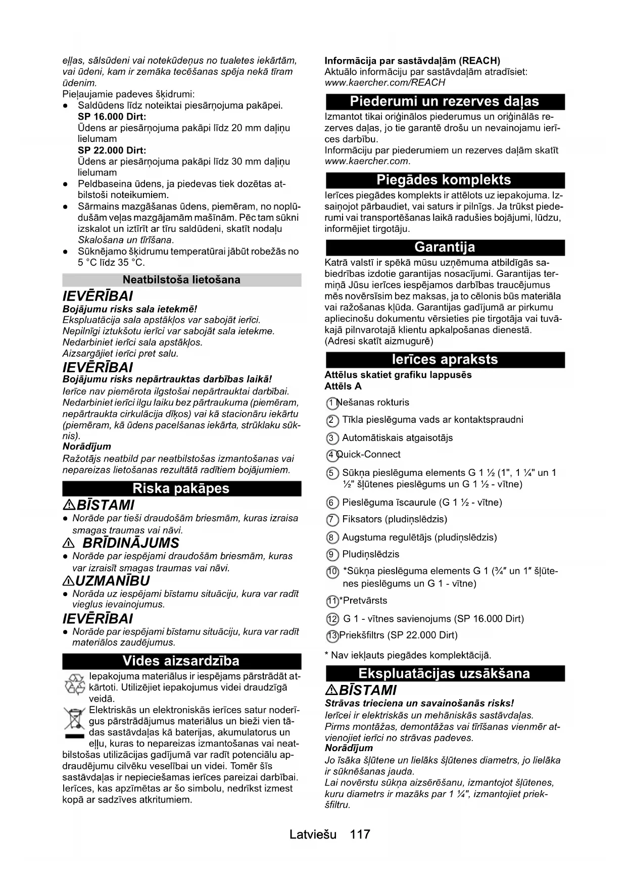 ● Norāde par iespējami bīstamu situāciju, kura var radīt materiālos zaudējumus. Vides aizsardzība Iepakojuma materiālus ir iespējams pārstrādāt at- kārtoti. Utilizējiet iepakojumus videi draudzīgā veidā. Elektriskās un elektroniskās ierīces satur noderī- gus pārstrādājumus materiālus un bieži vien tā- das sastāvdaļas kā baterijas, akumulatorus un eļļu, kuras to nepareizas izmantošanas vai neat- bilstošas utilizācijas gadījumā var radīt potenciālu ap- draudējumu cilvēku veselībai un videi. Tomēr šīs sastāvdaļas ir nepieciešamas ierīces pareizai darbībai. Ierīces, kas apzīmētas ar šo simbolu, nedrīkst izmest kopā ar sadzīves atkritumiem. Informācija par sastāvdaļām (REACH) Aktuālo informāciju par sastāvdaļām atradīsiet: www.kaercher.com/REACH Piederumi un rezerves daļas Izmantot tikai oriģinālos piederumus un oriģinālās re- zerves daļas, jo tie garantē drošu un nevainojamu ierī- ces darbību. Informāciju par piederumiem un rezerves daļām skatīt www.kaercher.com. Piegādes komplekts Ierīces piegādes komplekts ir attēlots uz iepakojuma. Iz- saiņojot pārbaudiet, vai saturs ir pilnīgs. Ja trūkst piede- rumi vai transportēšanas laikā radušies bojājumi, lūdzu, informējiet tirgotāju. Garantija Katrā valstī ir spēkā mūsu uzņēmuma atbildīgās sa- biedrības izdotie garantijas nosacījumi. Garantijas ter- miņā Jūsu ierīces iespējamos darbības traucējumus mēs novērsīsim bez maksas, ja to cēlonis būs materiāla vai ražošanas kļūda. Garantijas gadījumā ar pirkumu apliecinošu dokumentu vērsieties pie tirgotāja vai tuvā- kajā pilnvarotajā klientu apkalpošanas dienestā. (Adresi skatīt aizmugurē) Ierīces apraksts Attēlus skatiet grafiku lappusēs Attēls A 1 Nešanas rokturis 2 Tīkla pieslēguma vads ar kontaktspraudni 3 Automātiskais atgaisotājs 4 Quick-Connect 5 Sūkņa pieslēguma elements G 1 ½ (1", 1 ¼" un 1 ½" šļūtenes pieslēgums un G 1 ½ - vītne) 6 Pieslēguma īscaurule (G 1 ½ - vītne) 7 Fiksators (pludiņslēdzis) 8 Augstuma regulētājs (pludiņslēdzis) 9 Pludiņslēdzis 10 *Sūkņa pieslēguma elements G 1 (¾″ un 1″ šļūte- nes pieslēgums un G 1 - vītne) 11 *Pretvārsts 12 G 1 - vītnes savienojums (SP 16.000 Dirt) 13 Priekšfiltrs (SP 22.000 Dirt)