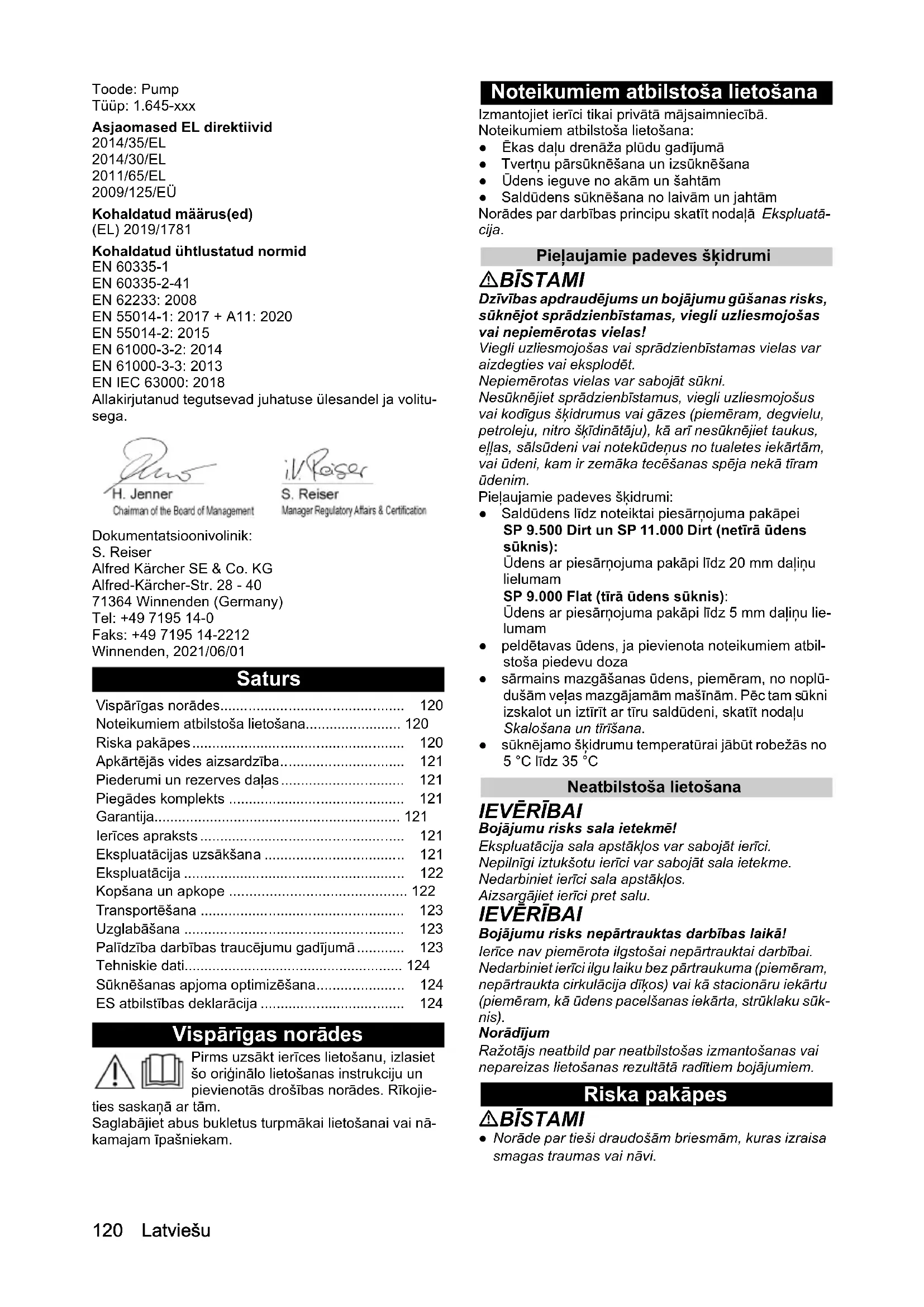 Dirt120 Latviešu Toode: Pump Tüüp: 1.645-xxx Asjaomased EL direktiivid 2014/35/EL 2014/30/EL 2011/65/EL 2009/125/EÜ Kohaldatud määrus(ed) (EL) 2019/1781 Kohaldatud ühtlustatud normid EN 60335-1 EN 60335-2-41 EN 62233: 2008 EN 55014-1: 2017 + A11: 2020 EN 55014-2: 2015 EN 61000-3-2: 2014 EN 61000-3-3: 2013 EN IEC 63000: 2018 Allakirjutanud tegutsevad juhatuse ülesandel ja volitu- sega. Dokumentatsioonivolinik: S. Reiser Alfred Kärcher SE & Co. KG Alfred-Kärcher-Str. 28 - 40 71364 Winnenden (Germany) Tel: +49 7195 14-0 Faks: +49 7195 14-2212 Winnenden, 2021/06/01 Saturs Vispārīgas norādes Pirms uzsākt ierīces lietošanu, izlasiet šo oriģinālo lietošanas instrukciju un pievienotās drošības norādes. Rīkojie- ties saskaņā ar tām. Saglabājiet abus bukletus turpmākai lietošanai vai nā- kamajam īpašniekam. Noteikumiem atbilstoša lietošana Izmantojiet ierīci tikai privātā mājsaimniecībā. Noteikumiem atbilstoša lietošana: ●Ēkas daļu drenāža plūdu gadījumā ● Tvertņu pārsūknēšana un izsūknēšana ●Ūdens ieguve no akām un šahtām ● Saldūdens sūknēšana no laivām un jahtām Norādes par darbības principu skatīt nodaļā Ekspluatā- cija. Pieļaujamie padeves šķidrumi BĪSTAMI Dzīvības apdraudējums un bojājumu gūšanas risks, sūknējot sprādzienbīstamas, viegli uzliesmojošas vai nepiemērotas vielas! Viegli uzliesmojošas vai sprādzienbīstamas vielas var aizdegties vai eksplodēt. Nepiemērotas vielas var sabojāt sūkni. Nesūknējiet sprādzienbīstamus, viegli uzliesmojošus vai kodīgus šķidrumus vai gāzes (piemēram, degvielu, petroleju, nitro šķīdinātāju), kā arī nesūknējiet taukus, eļļas, sālsūdeni vai notekūdeņus no tualetes iekārtām, vai ūdeni, kam ir zemāka tecēšanas spēja nekā tīram ūdenim. Pieļaujamie padeves šķidrumi: ● Saldūdens līdz noteiktai piesārņojuma pakāpei SP 9.500 Dirt un SP 11.000 Dirt (netīrā ūdens sūknis): Ūdens ar piesārņojuma pakāpi līdz 20 mm daļiņu lielumam SP 9.000 Flat (tīrā ūdens sūknis): Ūdens ar piesārņojuma pakāpi līdz 5 mm daļiņu lie- lumam ● peldētavas ūdens, ja pievienota noteikumiem atbil- stoša piedevu doza ● sārmains mazgāšanas ūdens, piemēram, no noplū- dušām veļas mazgājamām mašīnām. Pēc tam s ūkni izskalot un iztīrīt ar tīru saldūdeni, skatīt nodaļu Skalošana un tīrīšana. ● sūknējamo šķidrumu temperatūrai jābūt robežās no 5 °C līdz 35 °C Neatbilstoša lietošana