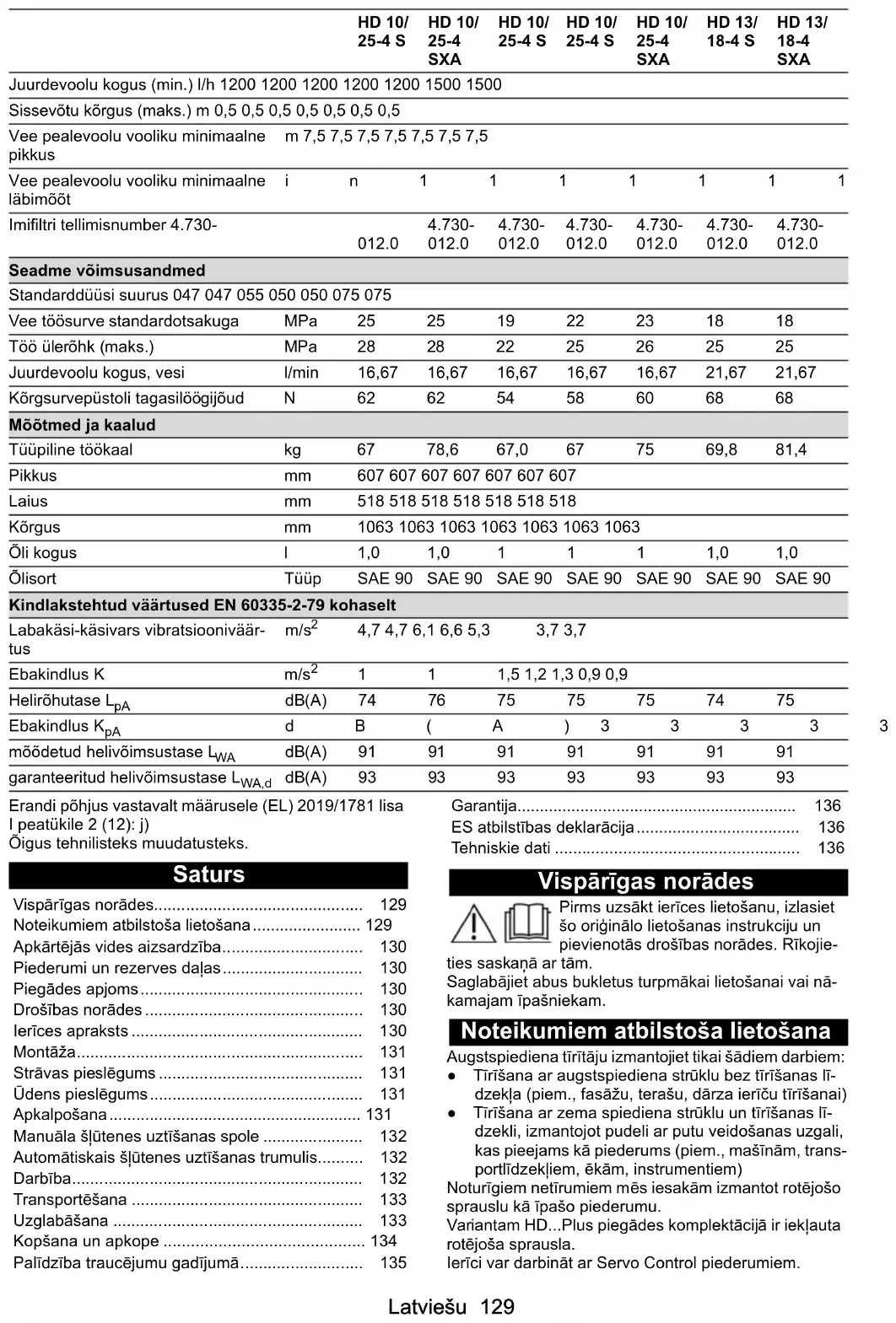 Veevõtuühendus Juurdevoolurõhk (maks.) MPa1111111 Juurdevoolu temperatuur (maks.) °C 60 60 60 60 60 60 60Latviešu 129 Erandi põhjus vastavalt määrusele (EL) 2019/1781 lisa I peatükile 2 (12): j) Õigus tehnilisteks muudatusteks. Saturs Vispārīgas norādes Pirms uzsākt ierīces lietošanu, izlasiet šo oriģinālo lietošanas instrukciju un pievienotās drošības norādes. Rīkojie- ties saskaņā ar tām. Saglabājiet abus bukletus turpmākai lietošanai vai nā- kamajam īpašniekam. Noteikumiem atbilstoša lietošana Augstspiediena tīrītāju izmantojiet tikai šādiem darbiem: ● Tīrīšana ar augstspiediena strūklu bez tīrīšanas lī- dzekļa (piem., fasāžu, terašu, dārza ierīču tīrīšanai) ● Tīrīšana ar zema spiediena strūklu un tīrīšanas lī- dzekli, izmantojot pudeli ar putu veidošanas uzgali, kas pieejams kā piederums (piem., mašīnām, trans- portlīdzekļiem, ēkām, instrumentiem) Noturīgiem netīrumiem mēs iesakām izmantot rotējošo sprauslu kā īpašo piederumu. Variantam HD...Plus piegādes komplektācijā ir iekļauta rotējoša sprausla. Ierīci var darbināt ar Servo Control piederumiem. Juurdevoolu kogus (min.) l/h 1200 1200 1200 1200 1200 1500 1500 Sissevõtu kõrgus (maks.) m 0,5 0,5 0,5 0,5 0,5 0,5 0,5 Vee pealevoolu vooliku minimaalne pikkus m 7,5 7,5 7,5 7,5 7,5 7,5 7,5 Vee pealevoolu vooliku minimaalne läbimõõt in1111111 Imifiltri tellimisnumber 4.730-