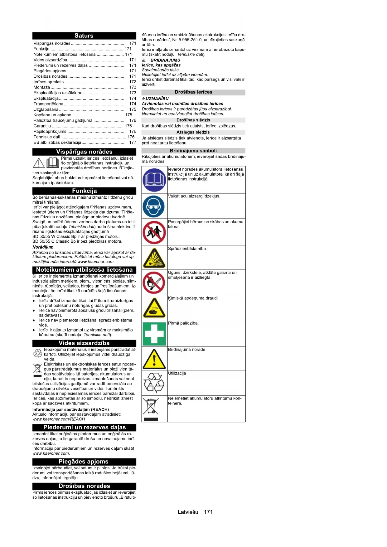 dB(A) 84,1 84,1 BD 50/55 W Classic Bp BD 50/55 C Classic Bp Chairman of the Board of Management Director Regulatory Affairs & Certification H. Jenner S. ReiserLatviešu 171 Saturs Vispārīgas norādes Pirms uzsākt ierīces lietošanu, izlasiet šo oriģinālo lietošanas instrukciju un pievienotās drošības norādes. Rīkojie- ties saskaņā ar tām. Saglabājiet abus bukletus turpmākai lietošanai vai nā- kamajam īpašniekam. Funkcija Šo beršanas-sūkšanas mašīnu izmanto līdzenu grīdu mitrai tīrīšanai. Ierīci var pielāgot attiecīgajam tīrīšanas uzdevumam, iestatot ūdens un tīrīšanas līdzekļa daudzumu. Tīrīša- nas līdzekļa dozēšanu pielāgo ar piedevu tvertnē. Svaigā un netīrā ūdens tvertnes darba platums un ietil- pība (skatīt nodaļu Tehniskie dati) nodrošina efektīvu tī- rīšanu ilgstošas ekspluatācijas gadījumā BD 50/55 W Classic Bp ir ar piedziņas motoru. BD 50/55 C Classic Bp ir bez piedziņas motora. Norādījum Atkarībā no tīrīšanas uzdevuma, ierīci var aprīkot ar da- žādiem piederumiem. Palūdziet mūsu katalogu vai ap- meklējiet mūs internetā www.kaercher.com. Noteikumiem atbilstoša lietošana Šī ierīce ir piemērota izmantošanai komerciālajiem un industriālajiem mērķiem, piem., viesnīcās, skolās, slim- nīcās, rūpnīcās, veikalos, birojos un īres īpašumiem. Iz- mantojiet šo ierīci tikai kā norādīts šajā lietošanas instrukcijā. ● Ierīci drīkst izmantot tikai, lai tīrītu mitrumizturīgas un pret pulēšanu noturīgas gludas grīdas. ● Ierīce nav piemērota apsalušu grīdu tīrīšanai (piem., saldētavās). ● Ierīce nav piemērota lietošanai sprādzienbīstamā vidē