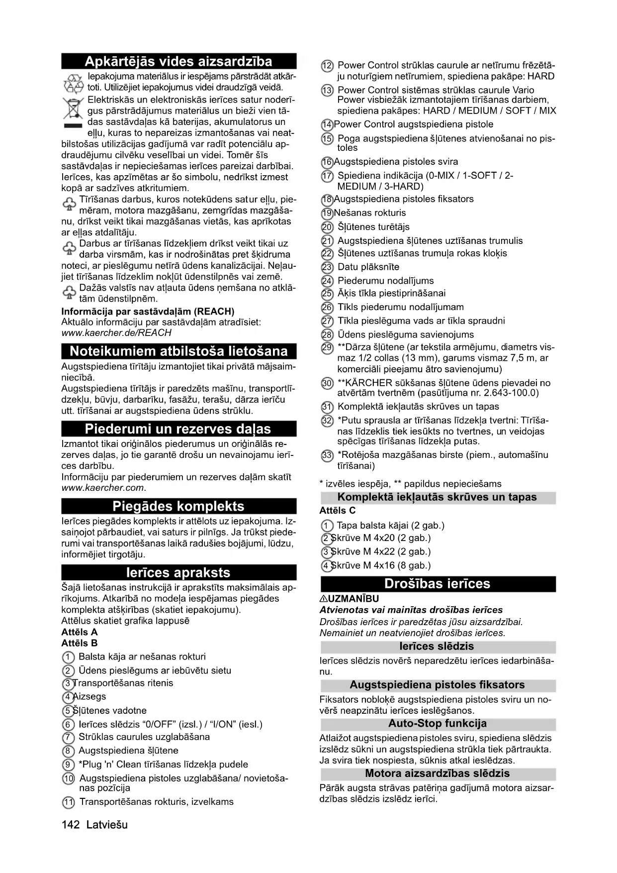 tuālo informāciju par sastāvdaļām atradīsiet: www.kaercher.de/REACH Noteikumiem atbilstoša lietošana Augstspiediena tīrītāju izmantojiet tikai privātā mājsaim- niecībā. Augstspiediena tīrītājs ir paredzēts mašīnu, transportlī- dzekļu, būvju, darbarīku, fasāžu, terašu, dārza ierīču utt. tīrīšanai ar augstspiediena ūdens strūklu. Piederumi un rezerves daļas Izmantot tikai oriģinālos piederumus un oriģinālās re- zerves daļas, jo tie garantē drošu un nevainojamu ierī- ces darbību. Informāciju par piederumiem un rezerves daļām skatīt www.kaercher.com. Piegādes komplekts Ierīces piegādes komplekts ir attēlots uz iepakojuma. Iz- saiņojot pārbaudiet, vai saturs ir pilnīgs. Ja trūkst piede- rumi vai transportēšanas laikā radušies bojājumi, lūdzu, informējiet tirgotāju. Ierīces apraksts Šajā lietošanas instrukcijā ir aprakstīts maksimālais ap- rīkojums. Atkarībā no modeļa iespējamas piegādes komplekta atšķirības (skatiet iepakojumu). Attēlus skatiet grafika lappusē Attēls A Attēls B 1 Balsta kāja ar nešanas rokturi 2 Ūdens pieslēgums ar iebūvētu sietu 3 Transportēšanas ritenis 4 Aizsegs 5 Šļūtenes vadotne 6 Ierīces slēdzis “0/OFF” (izsl.) / “I/ON” (iesl.) 7 Strūklas caurules uzglabāšana 8 Augstspiediena šļūtene 9 *Plug 'n' Clean tīrīšanas līdzekļa pudele 10 Augstspiediena pistoles uzglabāšana/ novietoša- nas pozīcija 11 Transportēšanas rokturis, izvelkams 12 Power Control strūklas caurule ar netīrumu frēzētā- ju noturīgiem netīrumiem, spiediena pakāpe: HARD 13 Power Control sistēmas strūklas caurule Vario Power visbiežāk izmantotajiem tīrīšanas darbiem, spiediena pakāpes: HARD / MEDIUM / SOFT / MIX 14 Power Control augstspiediena pistole 15 Poga augstspiediena šļūtenes atvienošanai no pis- toles 16 Augstspiediena pistoles svira 17 Spiediena indikācija (0-MIX / 1-SOFT / 2- MEDIUM / 3-HARD) 18 Augstspiediena pistoles fiksators 19 Nešanas rokturis 20 Šļūtenes turētājs 21 Augstspiediena šļūtenes uztīšanas trumulis 22 Šļūtenes uztīšanas trumuļa rokas kloķis 23 Datu plāksnīte 24 Piederumu nodalījums 25 Āķis tīkla piestiprināšanai 26 Tīkls piederumu nodalījumam 27 Tīkla pieslēguma vads ar tīkla spraudni 28 Ūdens pieslēguma savienojums 29 **Dārza šļūtene (ar tekstila armējumu, diametrs vis- maz 1/2 collas (13 mm), garums vismaz 7,5 m, ar komerciāli pieejamu ātro savienojumu) 30 **KÄRCHER sūkšanas šļūtene ūdens pievadei no atvērtām tvertnēm (pasūtījuma nr. 2.643-100.0) 31 Komplektā iekļautās skrūves un tapas 32 *Putu sprausla ar tīrīšanas līdzekļa tvertni: Tīrīša- nas līdzeklis tiek iesūkts no tvertnes, un veidojas spēcīgas tīrīšanas līdzekļa putas. 33 *Rotējoša mazgāšanas birste (piem., automašīnu tīrīšanai)