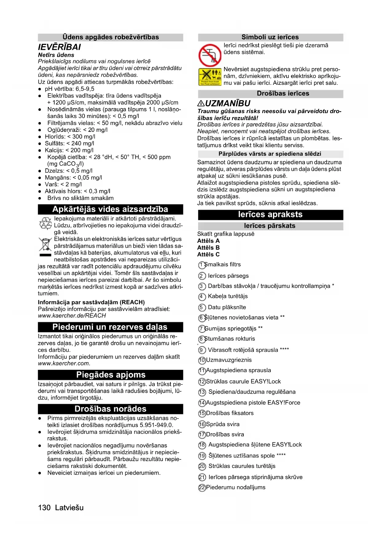 /l) ● Dzelzs: < 0,5 mg/l ● Mangāns: < 0,05 mg/l ● Varš: < 2 mg/l ● Aktīvais hlors: < 0,3 mg/l ● Brīvs no sliktām smakām Apkārtējās vides aizsardzība Iepakojuma materiāli ir atkārtoti pārstrādājami. Lūdzu, atbrīvojieties no iepakojuma videi draudzī- gā veidā. Elektriskās un elektroniskās ierīces satur vērtīgus pārstrādājamus materiālus un bieži vien tādas sa- stāvdaļas kā baterijas, akumulatorus vai eļļu, kuri neatbilstošas apstrādes vai nepareizas utilizāci- jas rezultātā var radīt potenciālu apdraudējumu cilvēku veselībai un apkārtējai videi. Tomēr šīs sastāvdaļas ir nepieciešamas ierīces pareizai darbībai. Ar šo simbolu marķētās ierīces nedrīkst izmest kop ā ar sadzīves atkri- tumiem. Informācija par sastāvdaļām (REACH) Pašreizējo informāciju par sastāvvielām atradīsiet: www.kaercher.de/REACH Piederumi un rezerves daļas Izmantot tikai oriģinālos piederumus un oriģinālās re- zerves daļas, jo tie garantē drošu un nevainojamu ierī- ces darbību. Informāciju par piederumiem un rezerves daļām skatīt www.kaercher.com. Piegādes apjoms Izsaiņojot pārbaudiet, vai saturs ir pilnīgs. Ja trūkst pie- derumi vai transportēšanas laikā radušies bojājumi, lū- dzu, informējiet tirgotāju. Drošības norādes ● Pirms pirmreizējās ekspluatācijas uzsākšanas no- teikti izlasiet drošības norādījumus 5.951-949.0. ● Ievērojiet šķidruma smidzinātāja nacionālos priekš- rakstus. ● Ievērojiet nacionālos negadījumu novēršanas priekšrakstus. Šķidruma smidzinātājus ir nepiecie- šams regulāri pārbaudīt. Pārbaužu rezultātu nepie- ciešams rakstiski dokumentēt. ● Neveiciet izmaiņas ierīcei un piederumiem. Simboli uz ierīces Ierīci nedrīkst pieslēgt tieši pie dzeramā ūdens sistēmai. Nevērsiet augstspiediena strūklu pret perso- nām, dzīvniekiem, aktīvu elektrisko aprīkoju- mu vai pašu ierīci. Aizsargāt ierīci pret salu. Drošības ierīces 몇 UZMANĪBU Traumu gūšanas risks neesošu vai pārveidotu dro- šības ierīču rezultātā! Drošības ierīces ir paredzētas jūsu aizsardzībai. Neapiet, nenoņemt vai neatspējot drošības ierīces. Drošības ierīces ir rūpnīcā iestatītas un plombētas. Ies- tatījumus drīkst veikt tikai klientu serviss. Pārplūdes vārsts ar spiediena slēdzi Samazinot ūdens daudzumu ar spiediena un daudzuma regulētāju, atveras pārplūdes vārsts un daļa ūdens plūst atpakaļ uz sūkni iesūkšanas pusē. Atlaižot augstspiediena pistoles sprūdu, spiediena slē- dzis izslēdz augstspiediena sū kni un augstspiediena strūkla apstājas. Ja tiek pavilkst sprūds, sūknis atkal ieslēdzas. Ierīces apraksts Ierīces pārskats Skatīt grafika lappusē Attēls A Attēls B Attēls C 1 Smalkais filtrs 2 Ierīces pārsegs 3 Darbības stāvokļa / traucējumu kontrollampiņa * 4 Kabeļa turētājs 5 Datu plāksnīte 6 Šļūtenes novietošanas vieta ** 7 Gumijas spriegotājs ** 8 Stumšanas rokturis