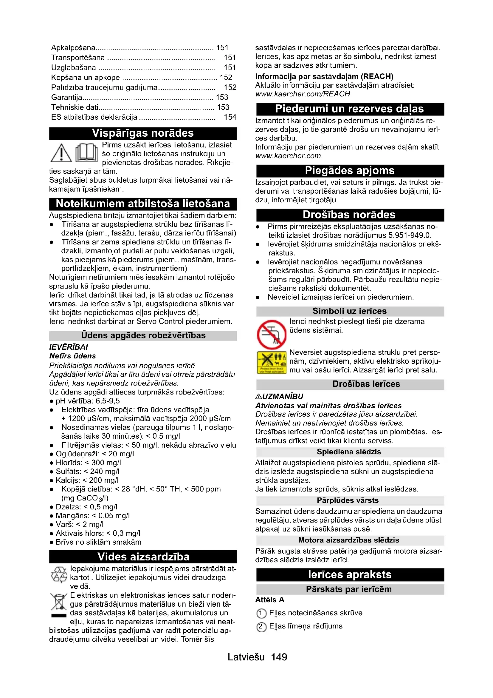 /l) ● Dzelzs: < 0,5 mg/l ● Mangāns: < 0,05 mg/l ● Varš: < 2 mg/l ● Aktīvais hlors: < 0,3 mg/l ● Brīvs no sliktām smakām Vides aizsardzība Iepakojuma materiālus ir iespējams pārstrādāt at- kārtoti. Utilizējiet iepakojumus videi draudzīgā veidā. Elektriskās un elektroniskās ierīces satur noderī- gus pārstrādājumus materiālus un bieži vien tā- das sastāvdaļas kā baterijas, akumulatorus un eļļu, kuras to nepareizas izmantošanas vai neat- bilstošas utilizācijas gadījumā var radīt potenciālu ap- draudējumu cilvēku veselībai un videi. Tomēr šīs sastāvdaļas ir nepieciešamas ierīces pareizai darbībai. Ierīces, kas apzīmētas ar šo simbolu, nedrīkst izmest kopā ar sadzīves atkritumiem. Informācija par sastāvdaļām (REACH) Aktuālo informāciju par sastāvdaļām atradīsiet: www.kaercher.com/REACH Piederumi un rezerves daļas Izmantot tikai oriģinālos piederumus un oriģinālās re- zerves daļas, jo tie garantē drošu un nevainojamu ierī- ces darbību. Informāciju par piederumiem un rezerves daļām skatīt www.kaercher.com. Piegādes apjoms Izsaiņojot pārbaudiet, vai saturs ir pilnīgs. Ja trūkst pie- derumi vai transportēšanas laikā radušies bojājumi, lū- dzu, informējiet tirgotāju. Drošības norādes ● Pirms pirmreizējās ekspluatācijas uzsākšanas no- teikti izlasiet drošības norādījumus 5.951-949.0. ● Ievērojiet šķidruma smidzinātāja nacionālos priekš- rakstus. ● Ievērojiet nacionālos negadījumu novēršanas priekšrakstus. Šķidruma smidzinātājus ir nepiecie- šams regulāri pārbaudīt. Pārbaužu rezultātu nepie- ciešams rakstiski dokumentēt. ● Neveiciet izmaiņas ierīcei un piederumiem. Simboli uz ierīces Ierīci nedrīkst pieslēgt tieši pie dzeramā ūdens sistēmai. Nevērsiet augstspiediena strūklu pret perso- nām, dzīvniekiem, aktīvu elektrisko aprīkoju- mu vai pašu ierīci. Aizsargāt ierīci pret salu. Drošības ierīces 몇 UZMANĪBU Atvienotas vai mainītas drošības ierīces Drošības ierīces ir paredzētas jūsu aizsardzībai. Nemainiet un neatvienojiet drošības ierīces. Drošības ierīces ir rūpnīcā iestatītas un plombētas. Ies- tatījumus drīkst veikt tikai klientu serviss. Spiediena slēdzis Atlaižot augstspiediena pistoles sprūdu, spiediena slē- dzis izslēdz augstspiediena sūkni un augstspiediena strūkla apstājas. Ja tiek izmantots sprūds, sūknis atkal ieslēdzas. Pārplūdes vārsts Samazinot ūdens daudzumu ar spiediena un daudzuma regulētāju, atveras pārplūdes vārsts un daļa ūdens plūst atpakaļ uz sūkni iesūkšanas pusē. Motora a
