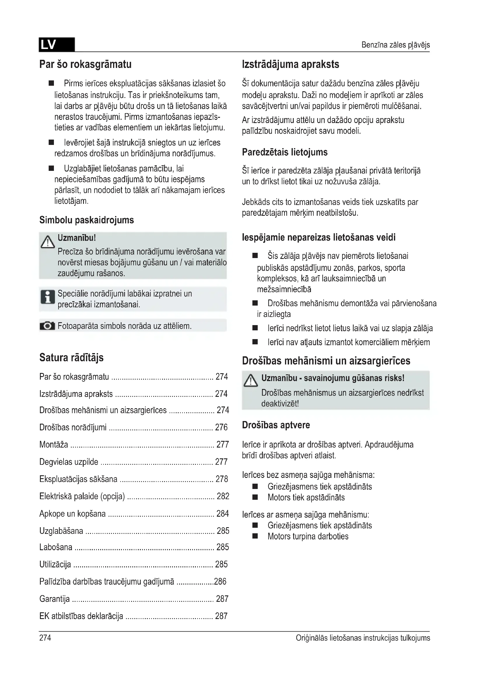 - EK atbilstības deklarācija Par šo rokasgrāmatu Pirms ierīces ekspluatācijas sākšanas izlasiet šo lietošanas instrukciju. Tas ir priekšnoteikums tam, lai darbs ar pļāvēju būtu drošs un tā lietošanas laikā nerastos traucējumi. Pirms izmantošanas iepazīs- tieties ar vadības elementiem un iekārtas lietojumu. Ievērojiet šajā instrukcijā sniegtos un uz ierīces redzamos drošības un brīdinājuma norādījumus. Uzglabājiet lietošanas pamācību, lai nepieciešamības gadījumā to būtu iespējams pārlasīt, un nododiet to tālāk arī nākamajam ierīces lietotājam. Simbolu paskaidrojums Uzmanību! Precīza šo brīdinājuma norādījumu ievērošana var novērst miesas bojājumu gūšanu un / vai materiālo zaudējumu rašanos. Speciālie norādījumi labākai izpratnei un precīzākai izmantošanai. Fotoaparāta simbols norāda uz attēliem. Izstrādājuma apraksts Šī dokumentācija satur dažādu benzīna zāles pļāvēju modeļu aprakstu. Daži no modeļiem ir aprīkoti ar zāles savācējtvertni un/vai papildus ir piemēroti mulčēšanai. Ar izstrādājumu attēlu un dažādo opciju aprakstu palīdzību noskaidrojiet savu modeli. Paredzētais lietojums Šī ierīce ir paredzēta zālāja pļaušanai privātā teritorijā un to drīkst lietot tikai uz nožuvuša zālāja. Jebkāds cits to izmantošanas veids tiek uzskatīts par paredzētajam mērķim neatbilstošu. Iespējamie nepareizas lietošanas veidi Šis zālāja pļāvējs nav piemērots lietošanai publiskās apstādījumu zonās, parkos, sporta kompleksos, kā arī lauksaimniecībā un mežsaimniecībā Drošības mehānismu demontāža vai pārvienošana ir aizliegta Ierīci nedrīkst lietot lietus laikā vai uz slapja zālāja Ierīci nav atļauts izmantot komerciāliem mērķiem Drošības mehānismi un aizsargierīces Uzmanību - savainojumu gūšanas risks! Drošības mehānismus un aizsargierīces nedrīkst deaktivizēt! Drošības aptvere Ierīce ir aprīkota ar drošības aptveri. Apdraudējuma brīdī drošības aptveri atlaist. Ierīces bez asmeņa sajūga mehānisma: Griezējasmens tiek apstādināts Motors tiek apstādināts Ierīces ar asmeņa sajūga mehānismu: Griezējasmens tiek apstādināts Motors turpina darbotiesLV 275470 591_c 1 Startera trose 9 Griešanas augstuma regulētājs* 2 Palaide, apstādināšana* 10 Asmeņa sajūga mehānisms* 3 Riteņu piedziņas mehānisms* 11 Bezpakāpju variātora pārnesumkārba* 4 Drošības aptvere 12 Lietošanas instrukcija 5 Ergonomisks augstuma regulētājs * 13 Izsviedes ieliktnis* 6 Iepildes līmeņa indikators* 14 Noslēgvāks* 7 Atvairītājs* 15 Mulčēšanas komplekts* 8 Zāles savācējtvertne* * atkarībā no modeļa Simboli uz ierīces Uzmanību! Lietojot ievērot īpašu piesardzību. Pirms darbošanās ar griezējmehānismu atvienot aizdedzes sveču kontaktspraudni. Pirms ekspluatācijas sākšanas izlasīt lietošanas instrukciju! Atlaist motora bremzi. Nepieļaut trešo personu uzturēšanos riska zonā! Ieslēgt riteņu piedziņas mehānismu. Rokas un kājas turēt pienācīgā attālumā no griezējmehānisma! p. 287