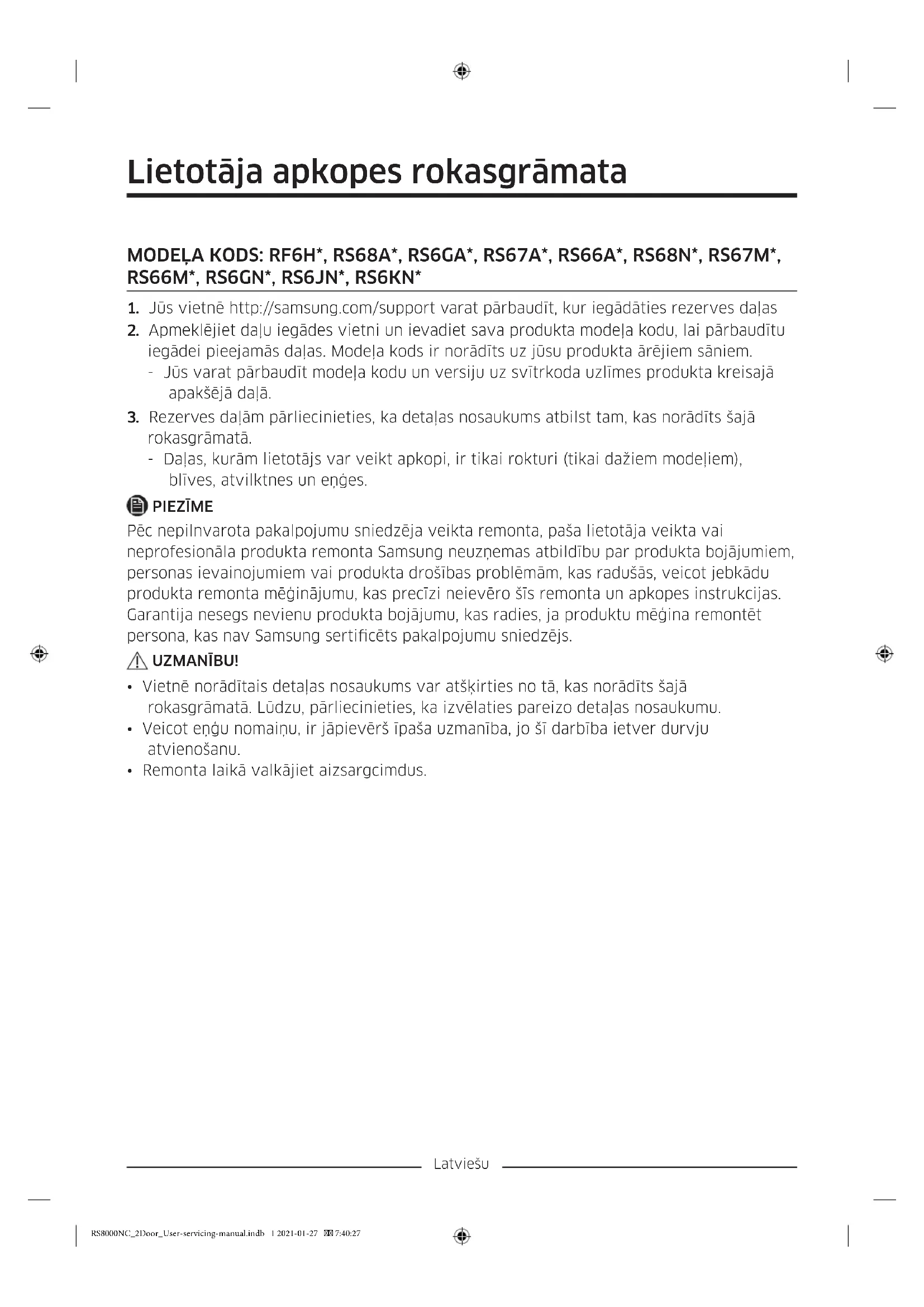 rokasgrāmatā. - Daļas, kurām lietotājs var veikt apkopi, ir tikai rokturi (tikai dažiem modeļiem), blīves, atvilktnes un eņģes. PIEZĪME Pēc nepilnvarota pakalpojumu sniedzēja veikta remonta, paša lietotāja veikta vai neprofesionāla produkta remonta Samsung neuzņemas atbildību par produkta bojājumiem, personas ievainojumiem vai produkta drošības problēmām, kas radušās, veicot jebkādu produkta remonta mēģinājumu, kas precīzi neievēro šīs remonta un apkopes instrukcijas. Garantija nesegs nevienu produkta bojājumu, kas radies, ja produktu mēģina remontēt persona, kas nav Samsung serticēts pakalpojumu sniedzējs. UZMANĪBU!